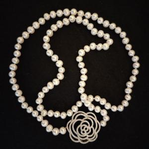 近圆天然深水珍珠豪镶满钻白玫瑰毛衣...