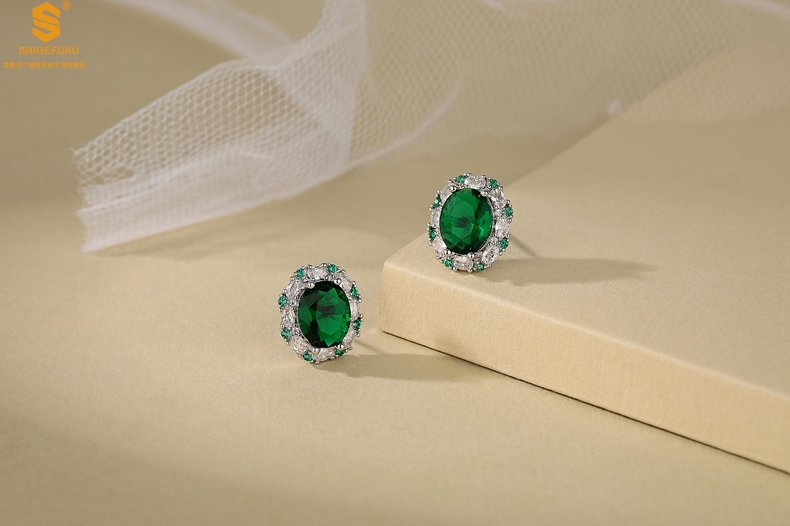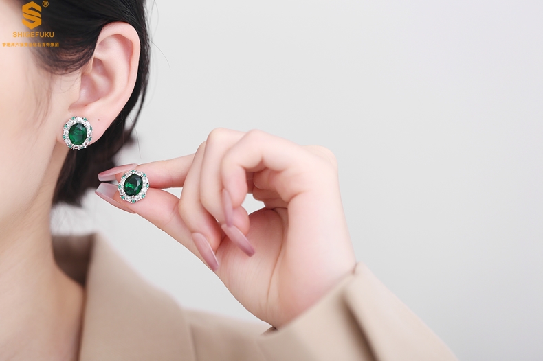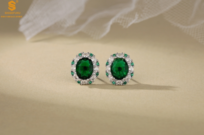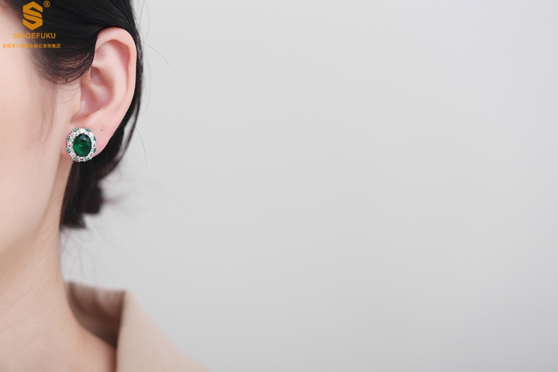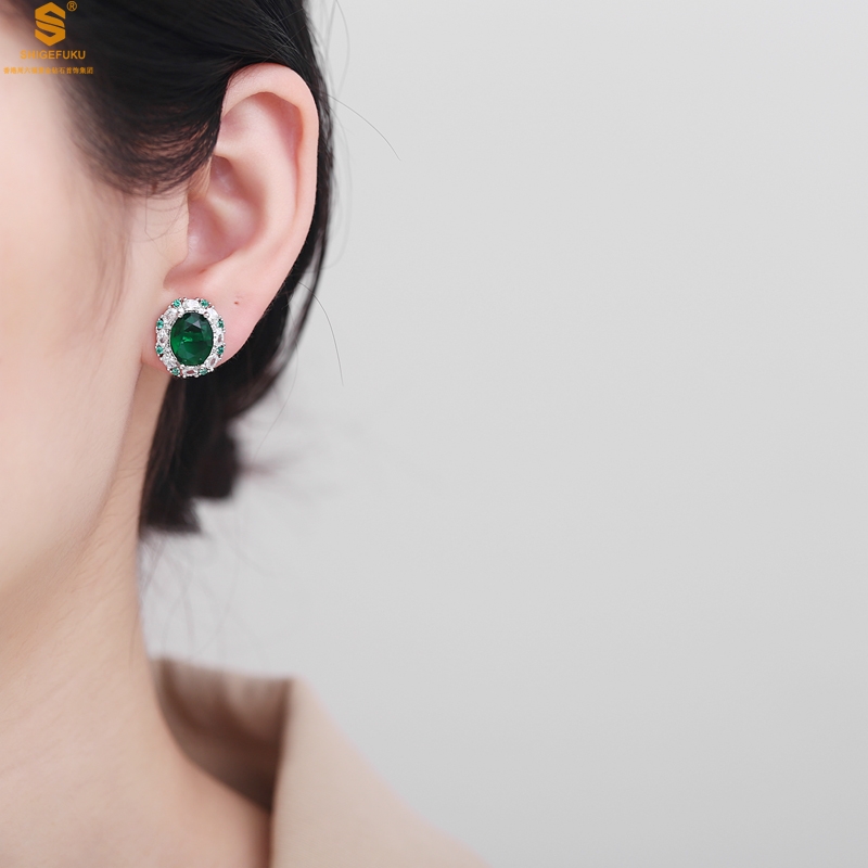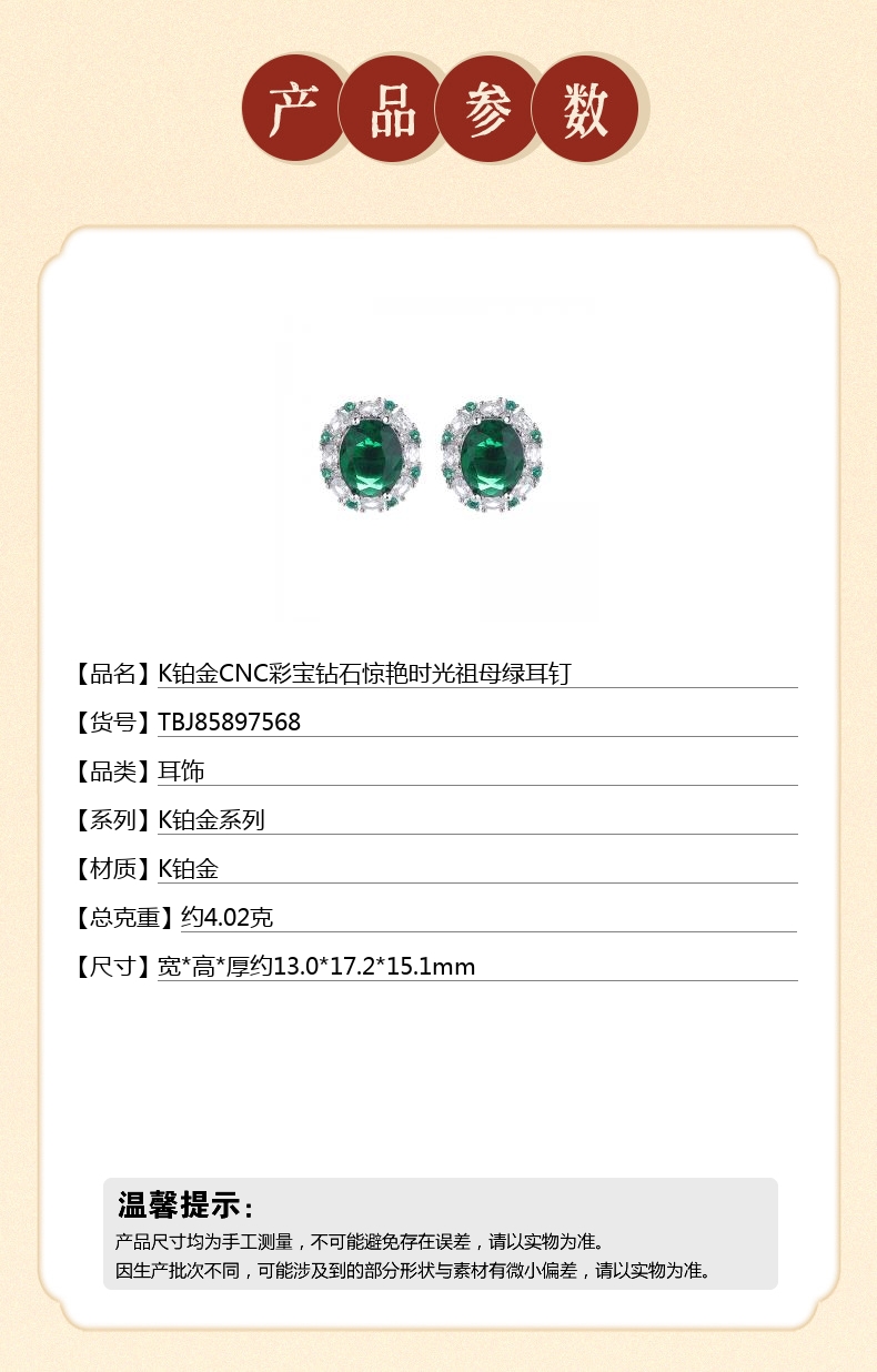 【品名】K铂金CNC彩宝钻石惊艳时光祖母绿耳钉