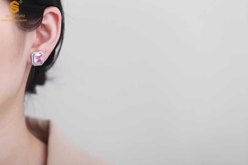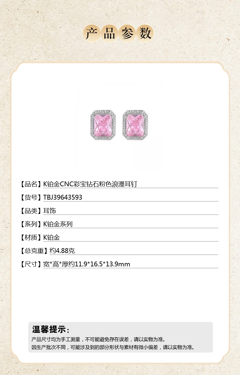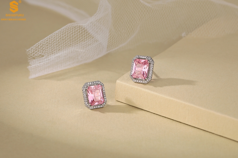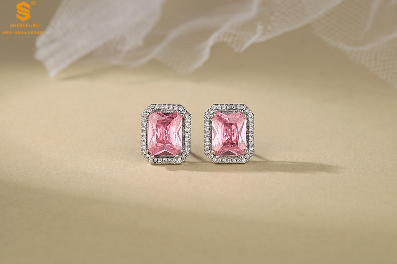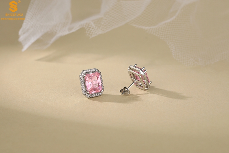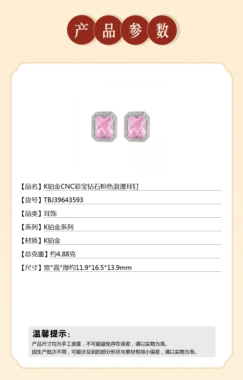 【品名】K铂金CNC彩宝钻石粉色浪漫耳钉