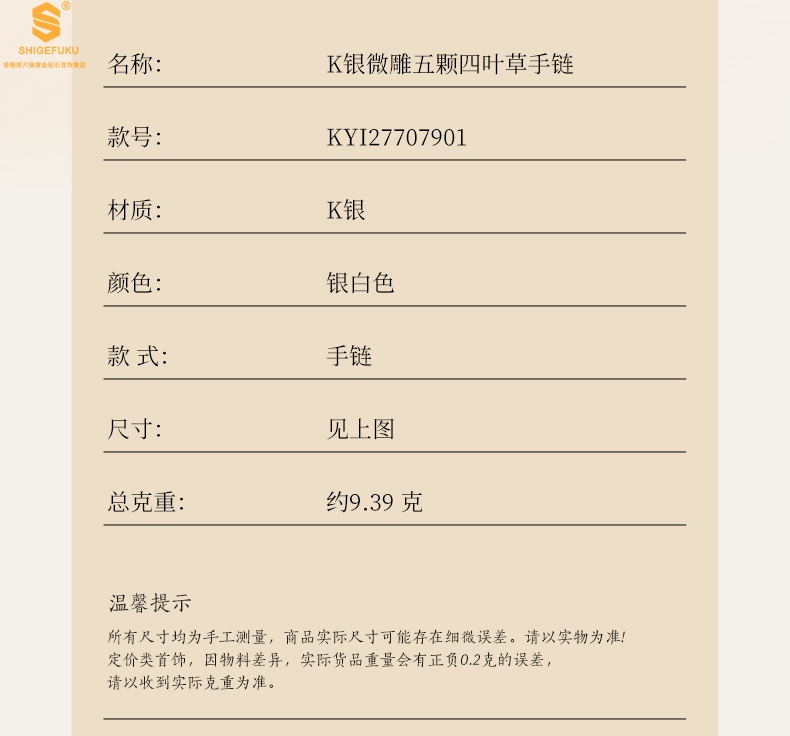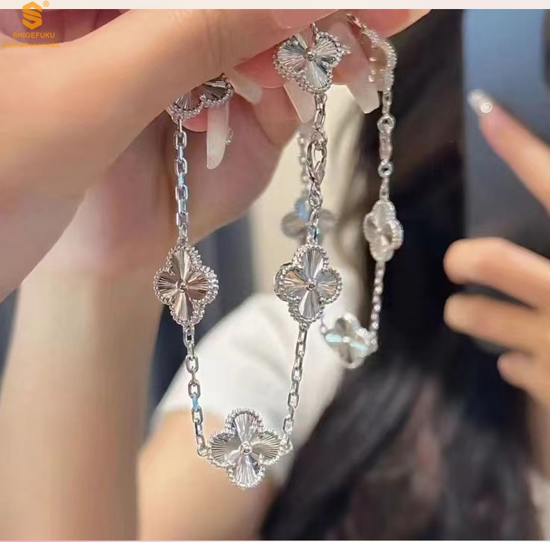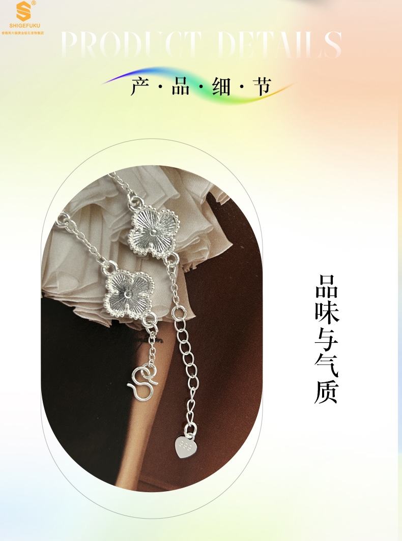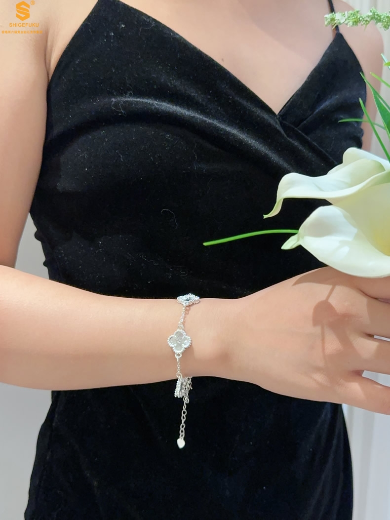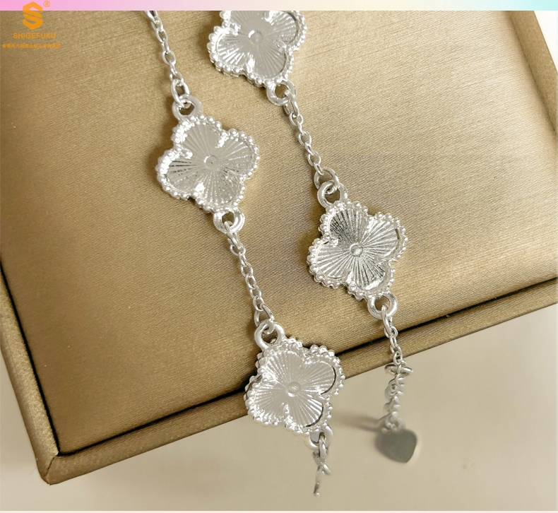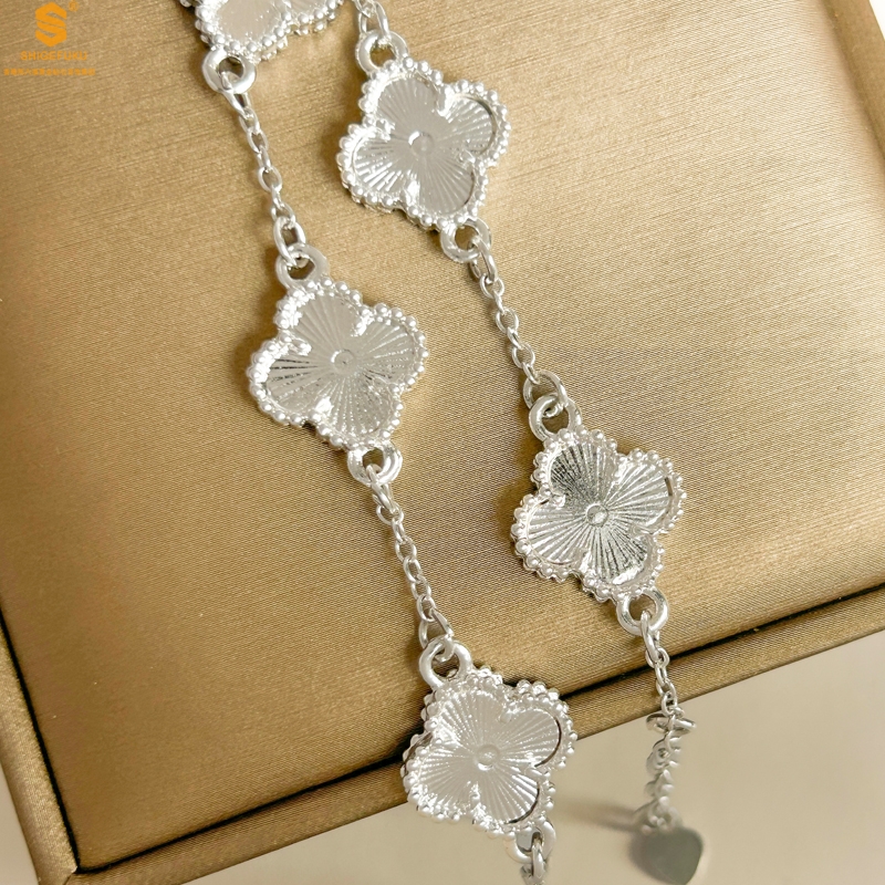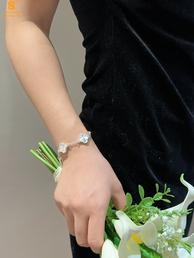 【品名】K银微雕五颗四叶草手链(高定礼盒)
