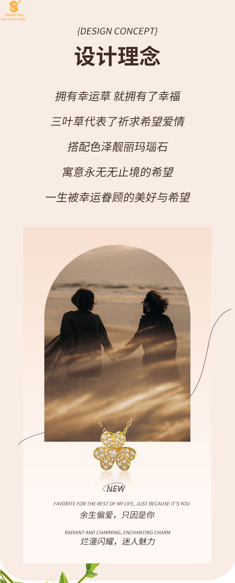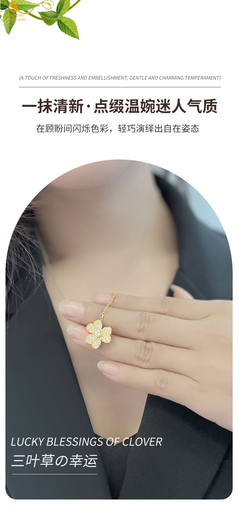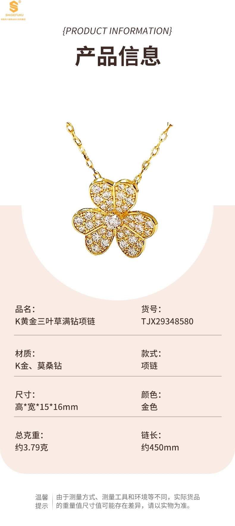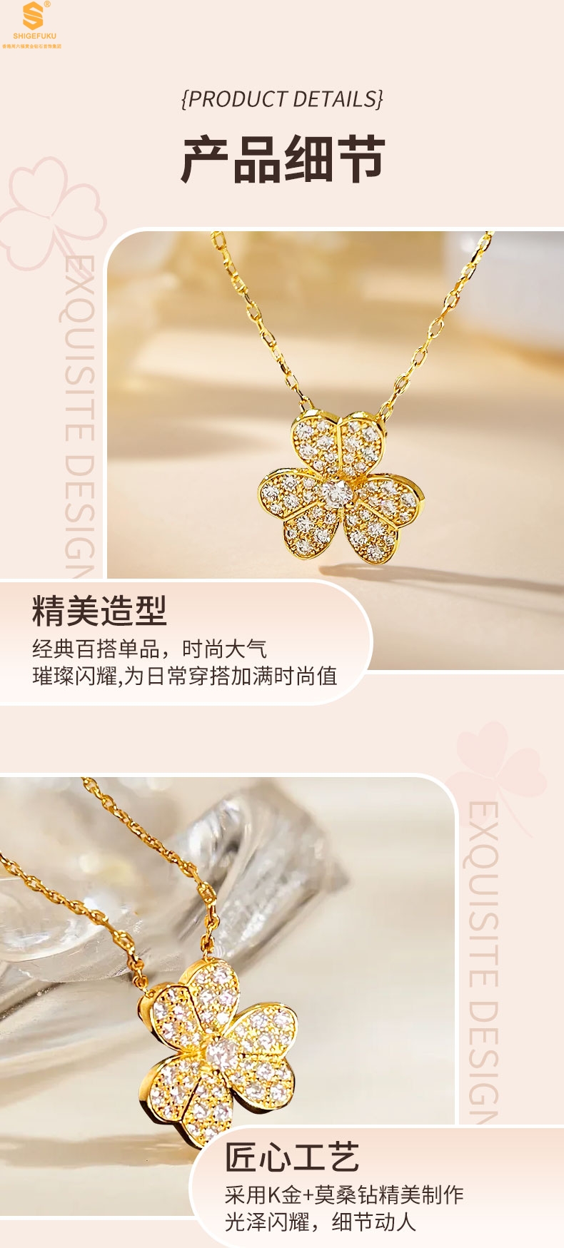 【品名】K黄金三叶草满钻项链