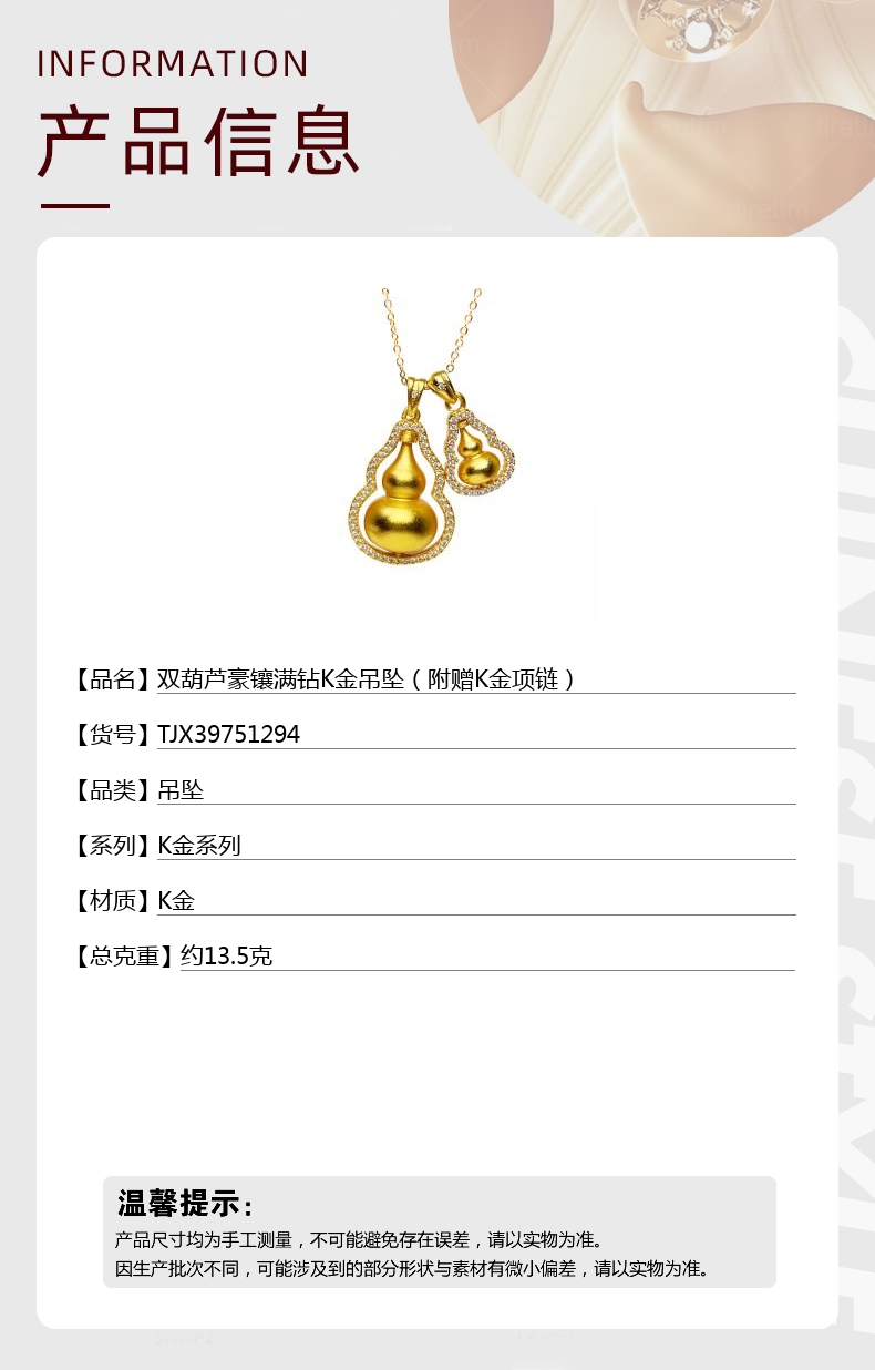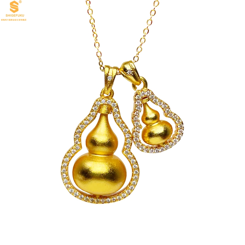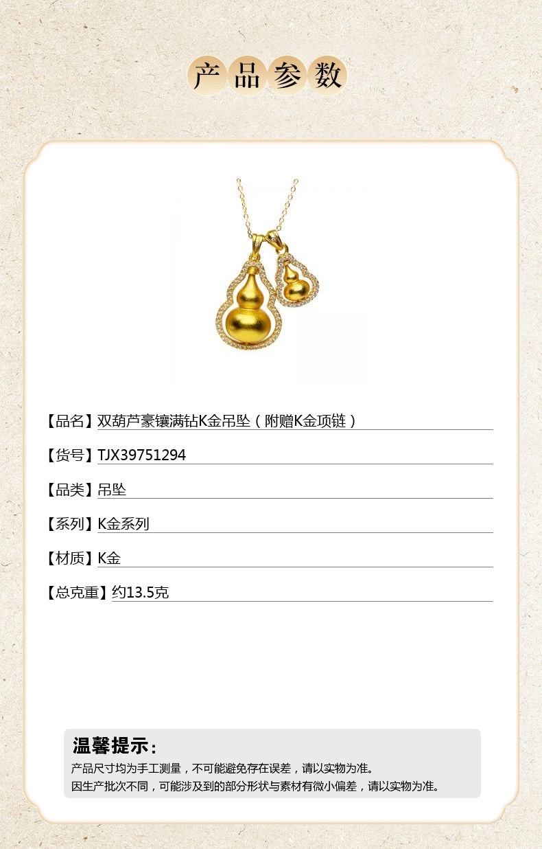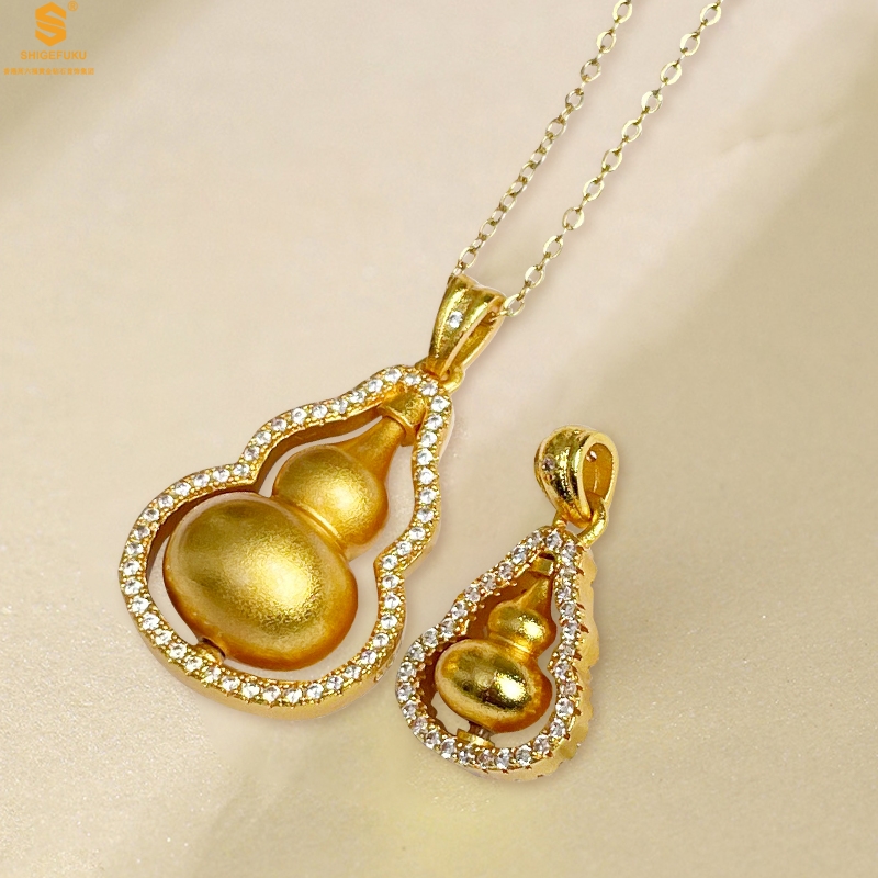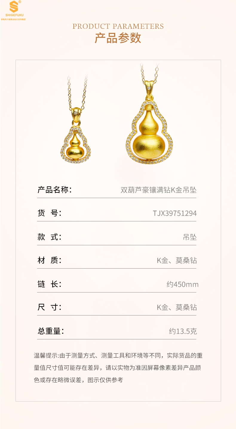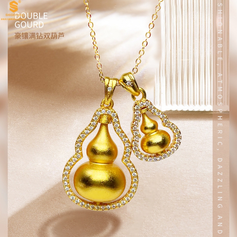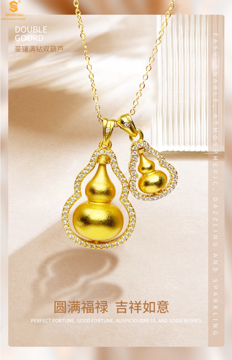 【品名】双葫芦豪镶满钻K金吊坠(附赠K金项链)