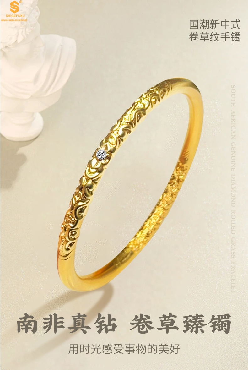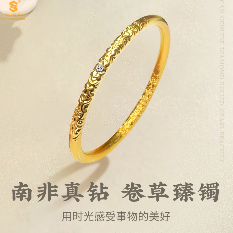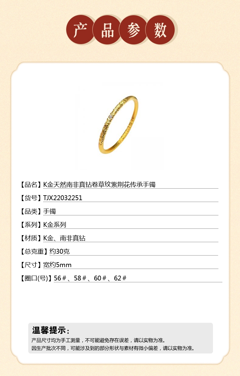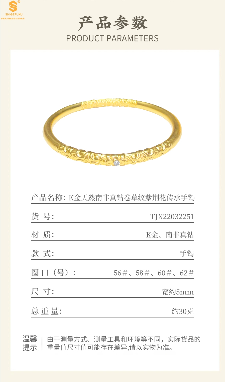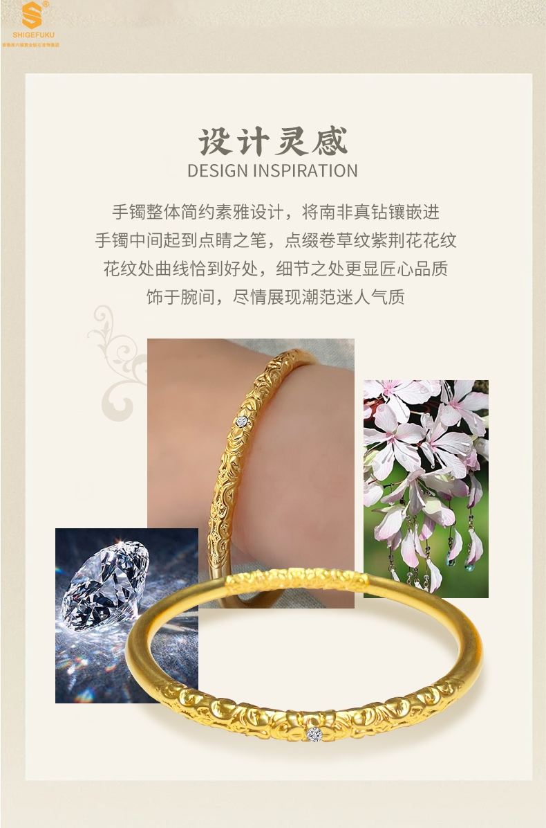 【品名】K金天然南非真钻卷草纹紫荆花传承手镯