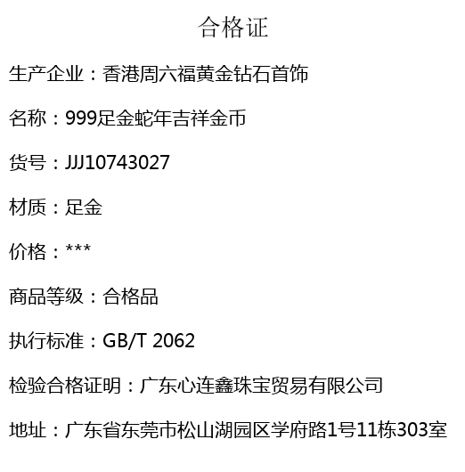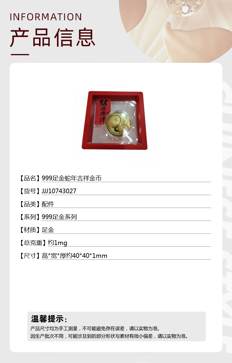 【品名】999足金蛇年吉祥金币