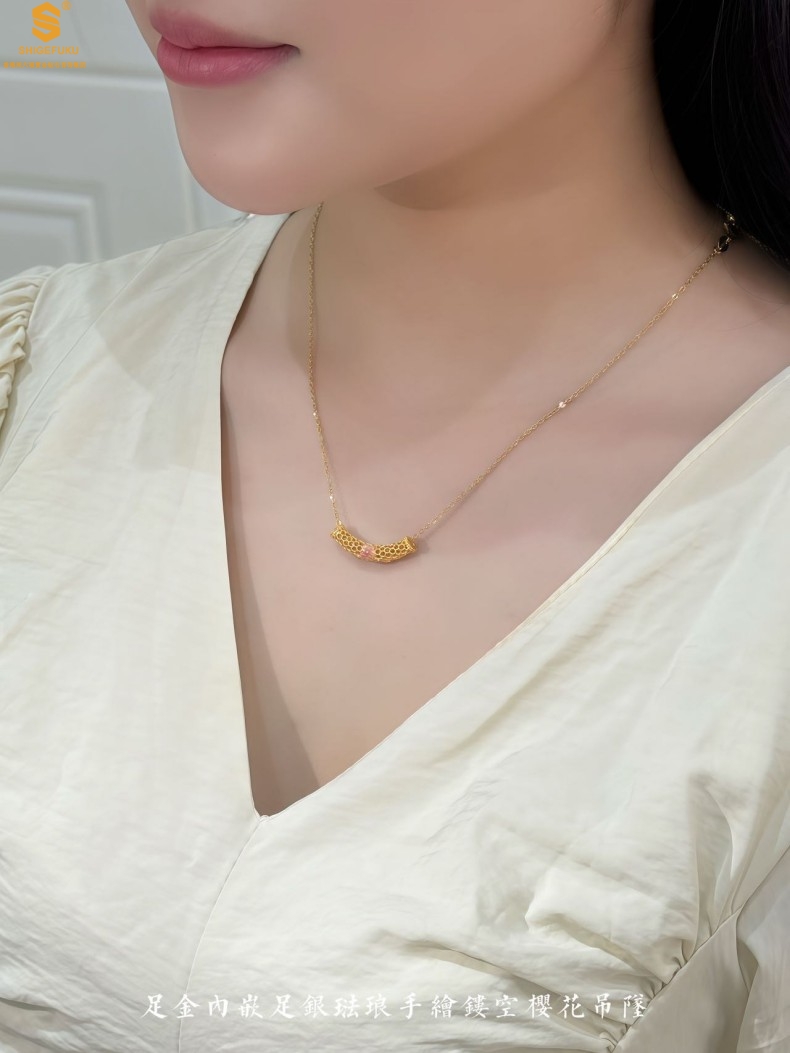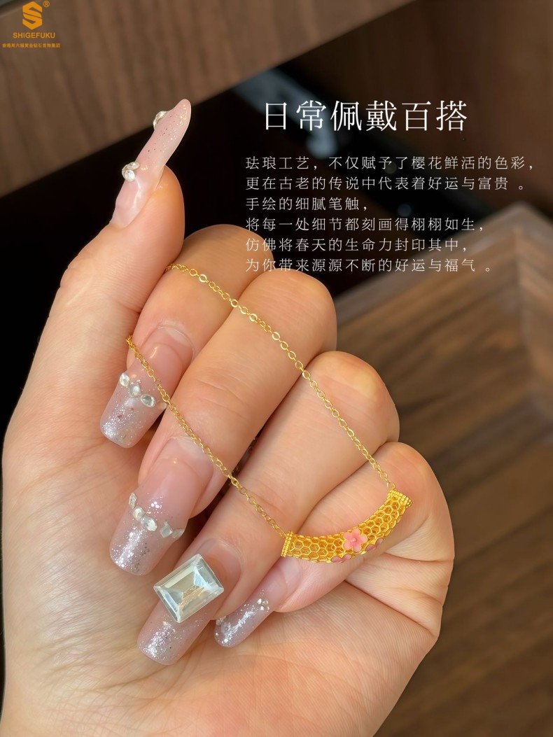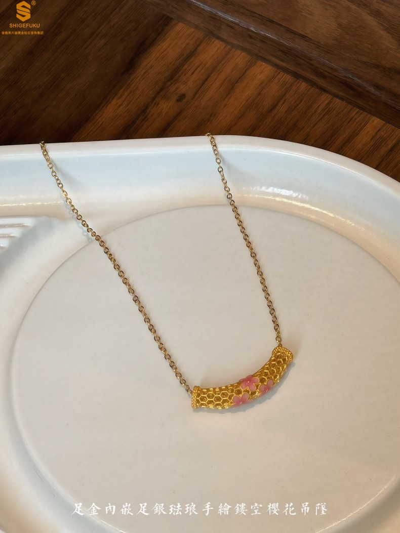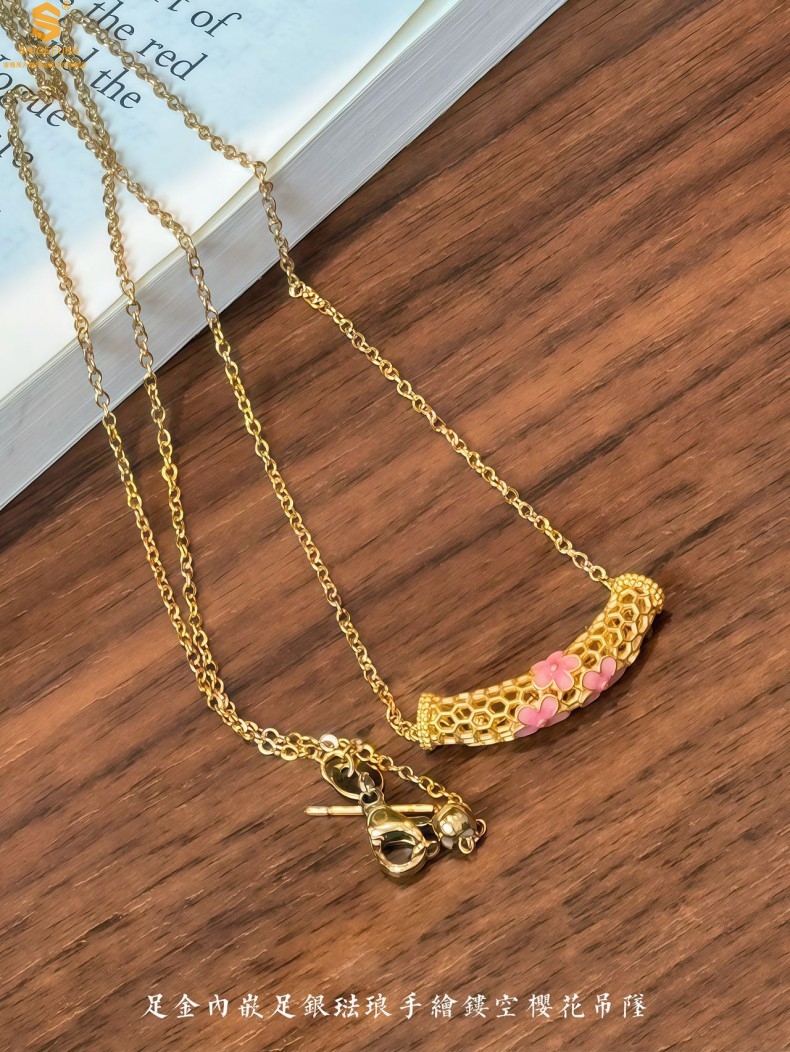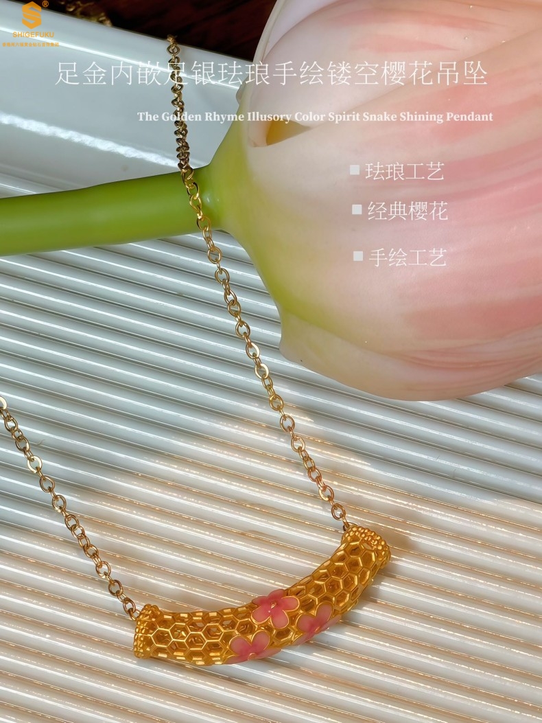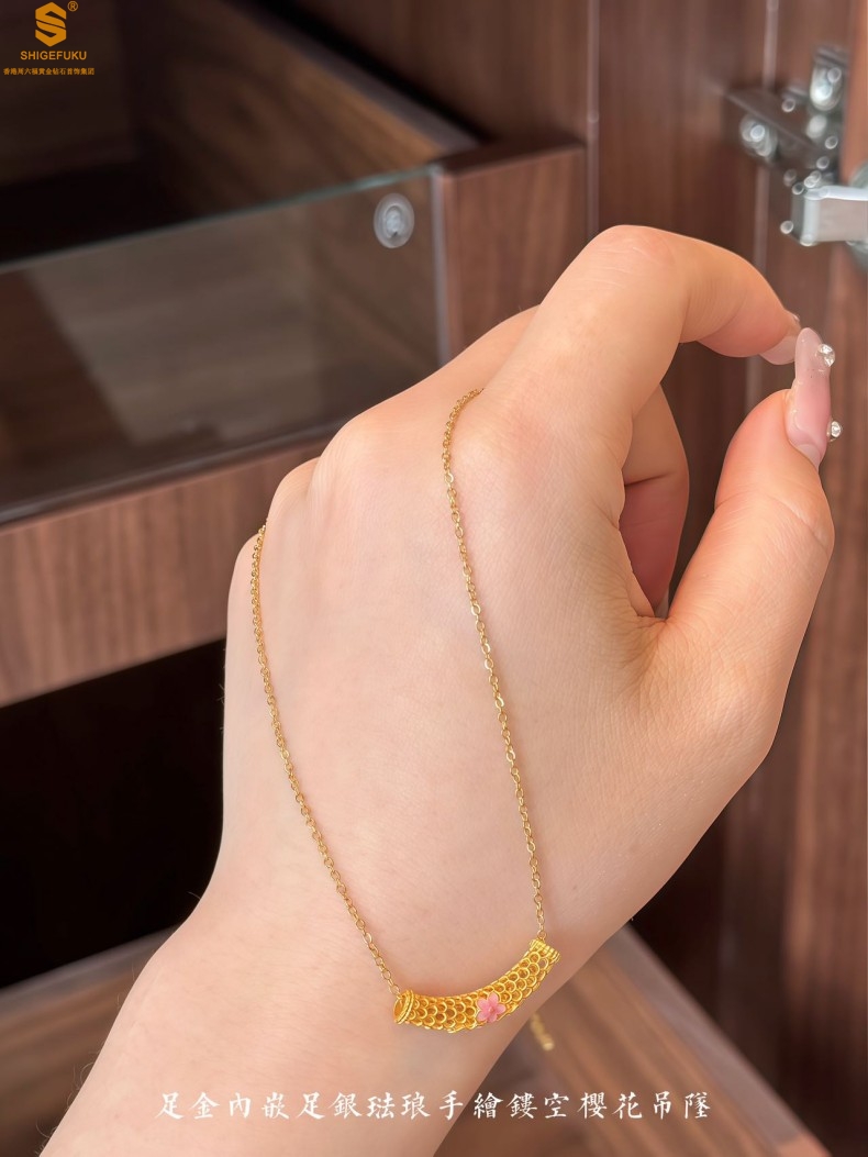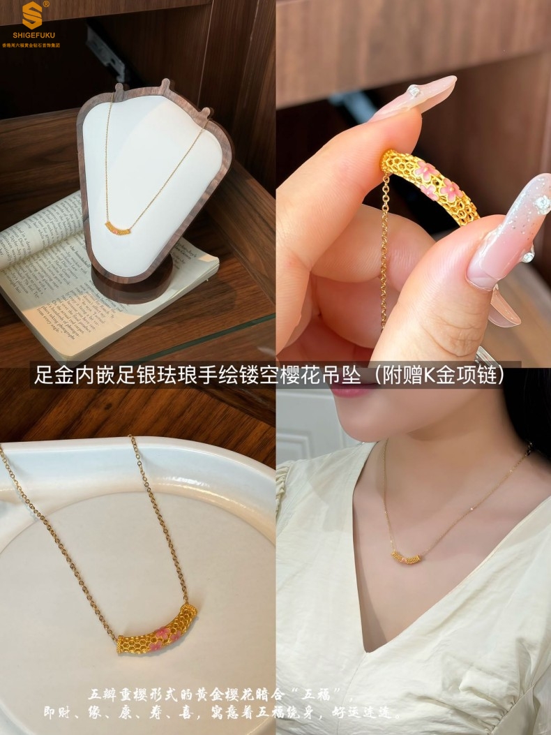 【品名】足金内嵌足银珐琅手绘镂空樱花吊坠(附赠K金项链)