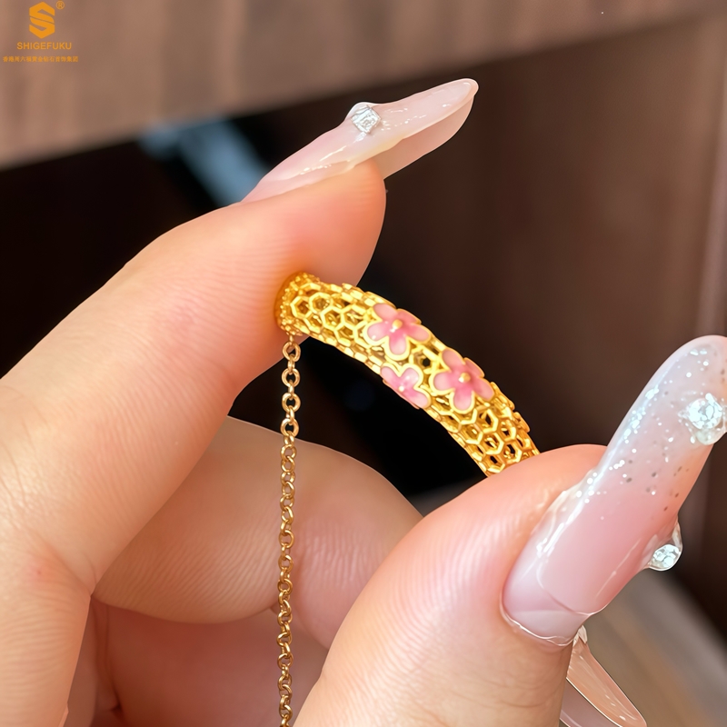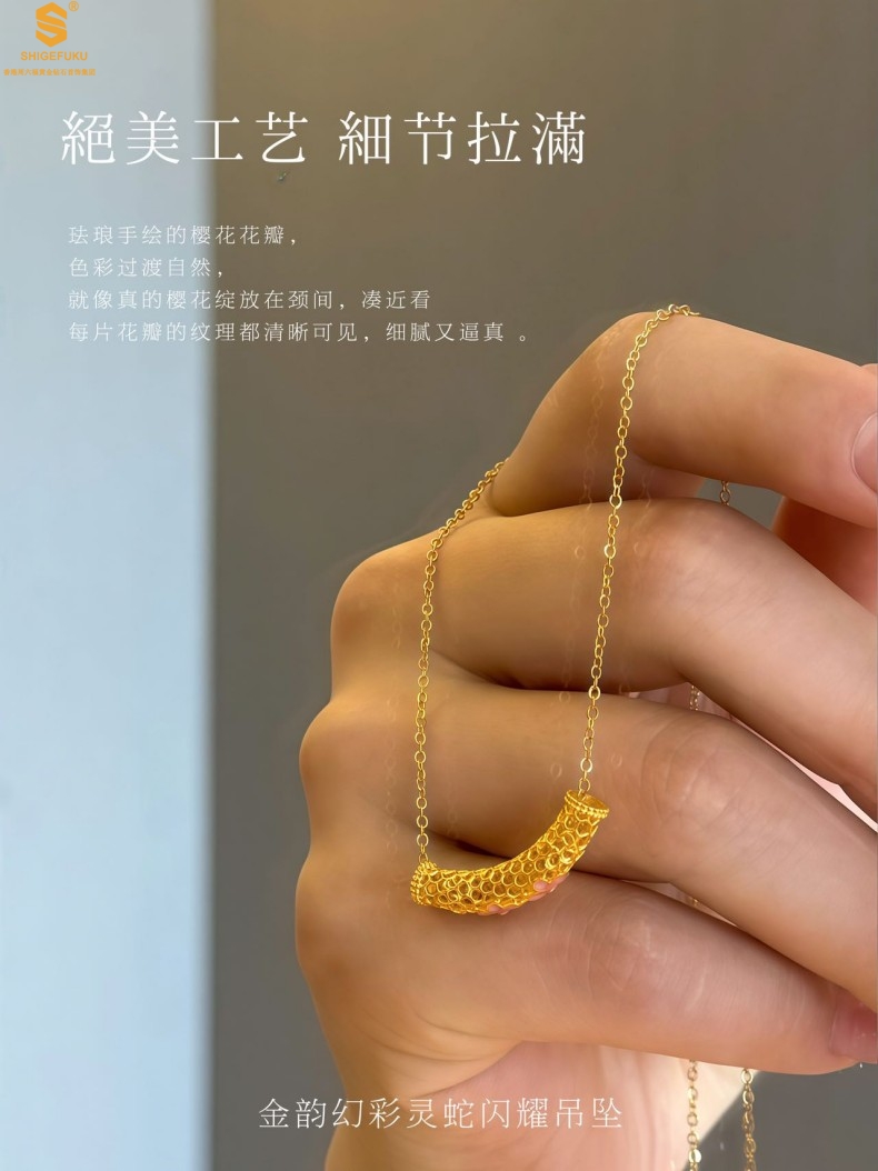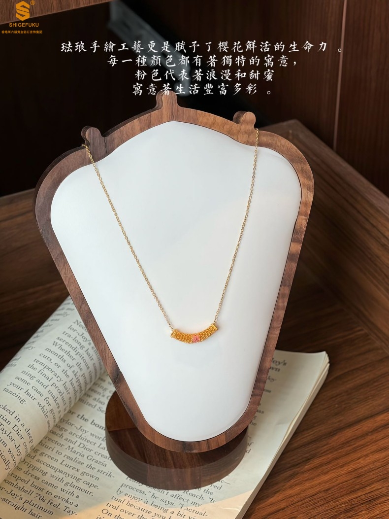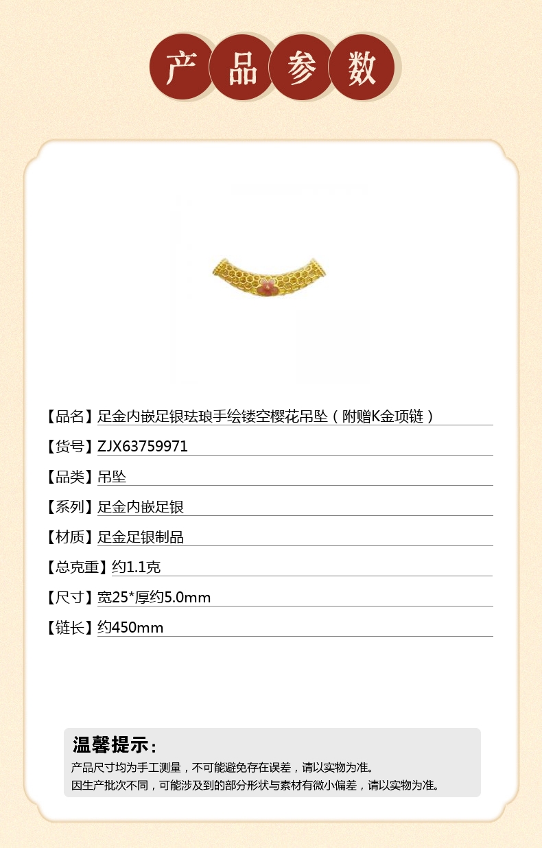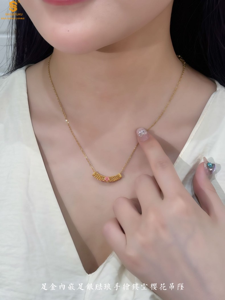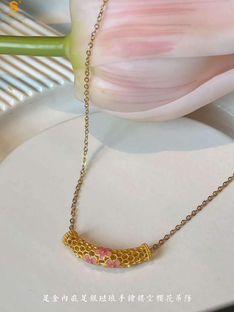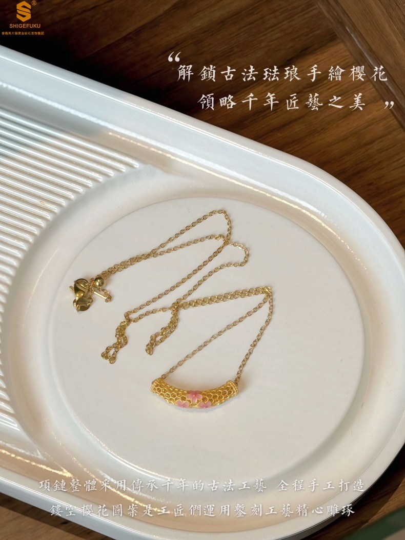 【品名】足金内嵌足银珐琅手绘镂空樱花吊坠(附赠K金项链)
