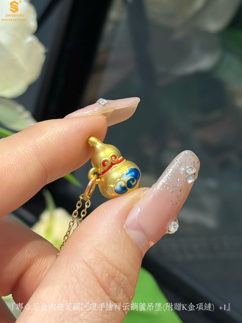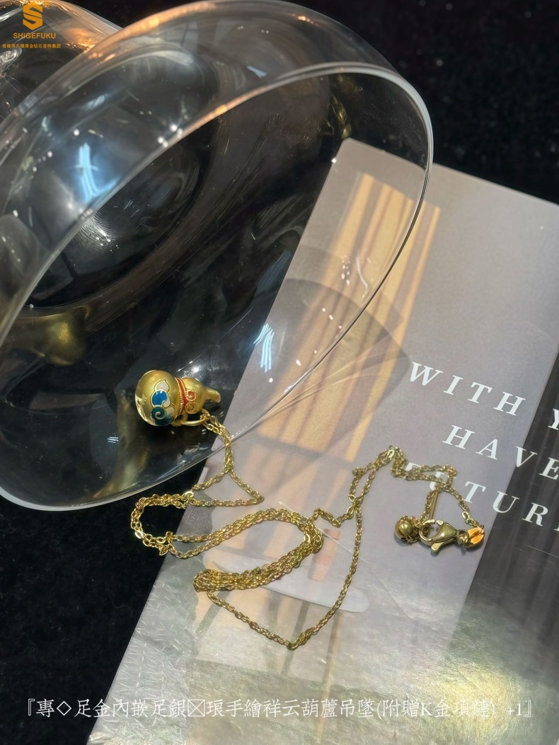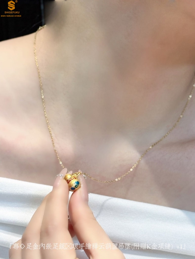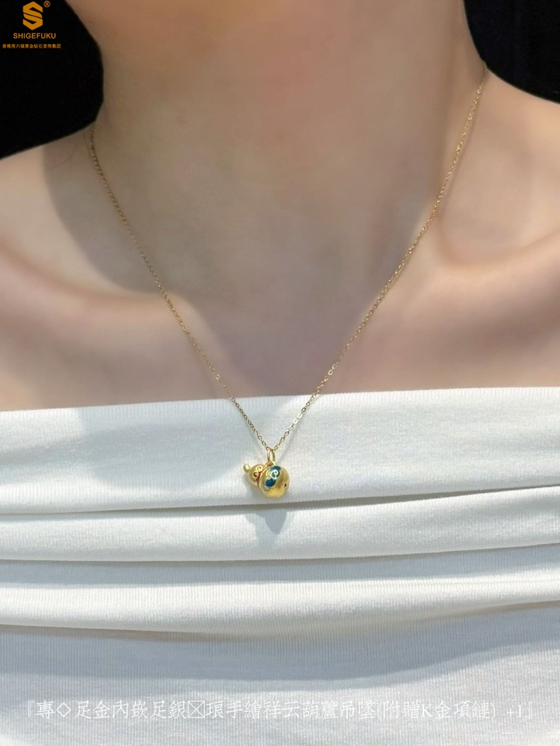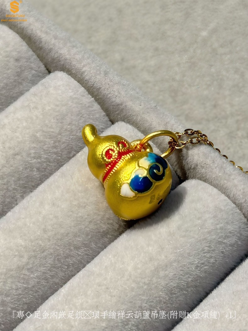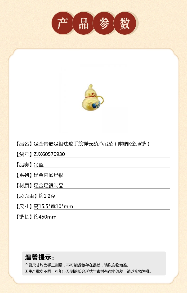 【品名】足金内嵌足银珐琅手绘祥云葫芦吊坠(附赠K金项链)
