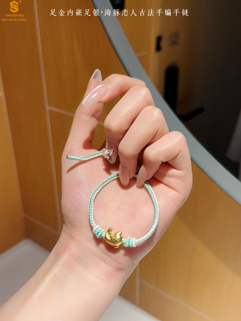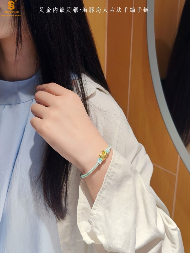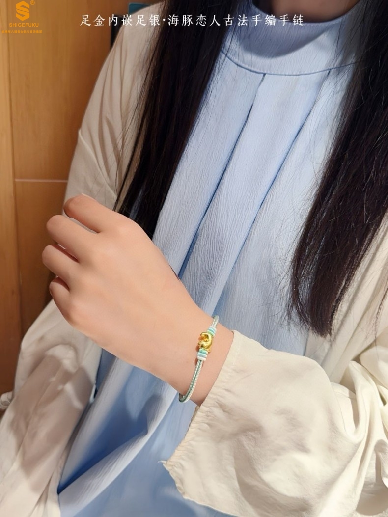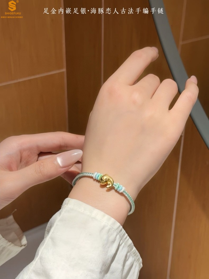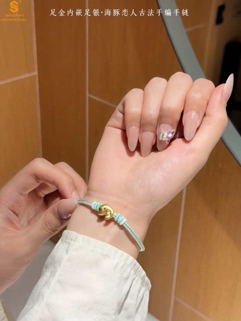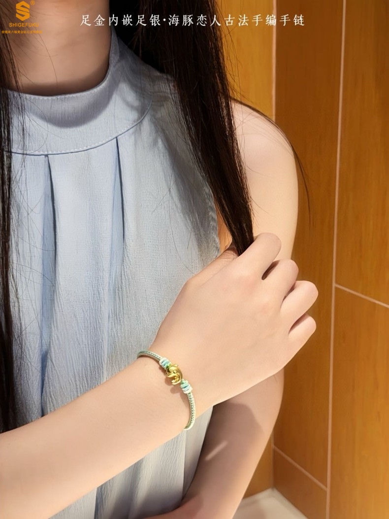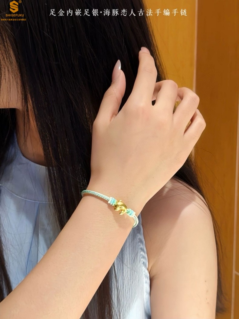 【品名】足金内嵌足银海豚恋人古法手编手链