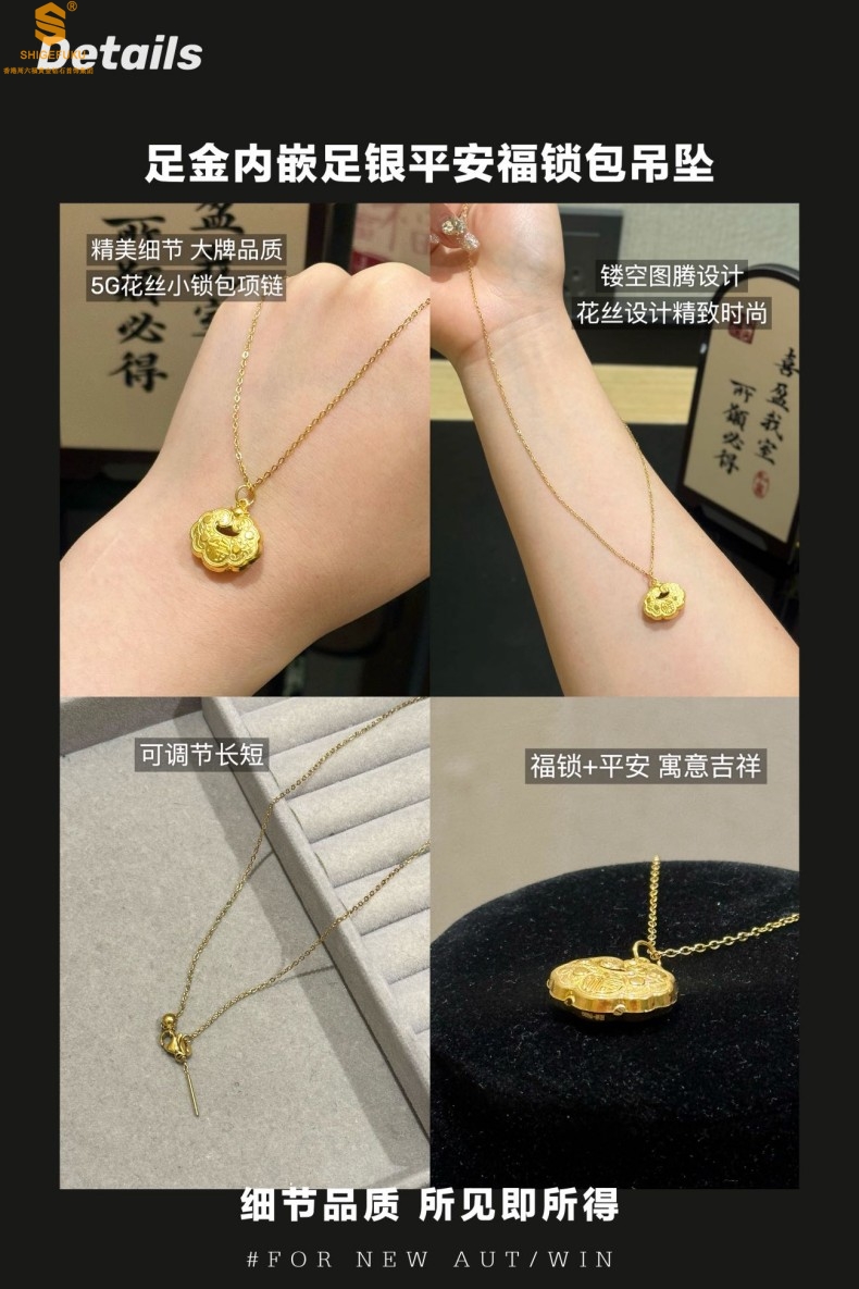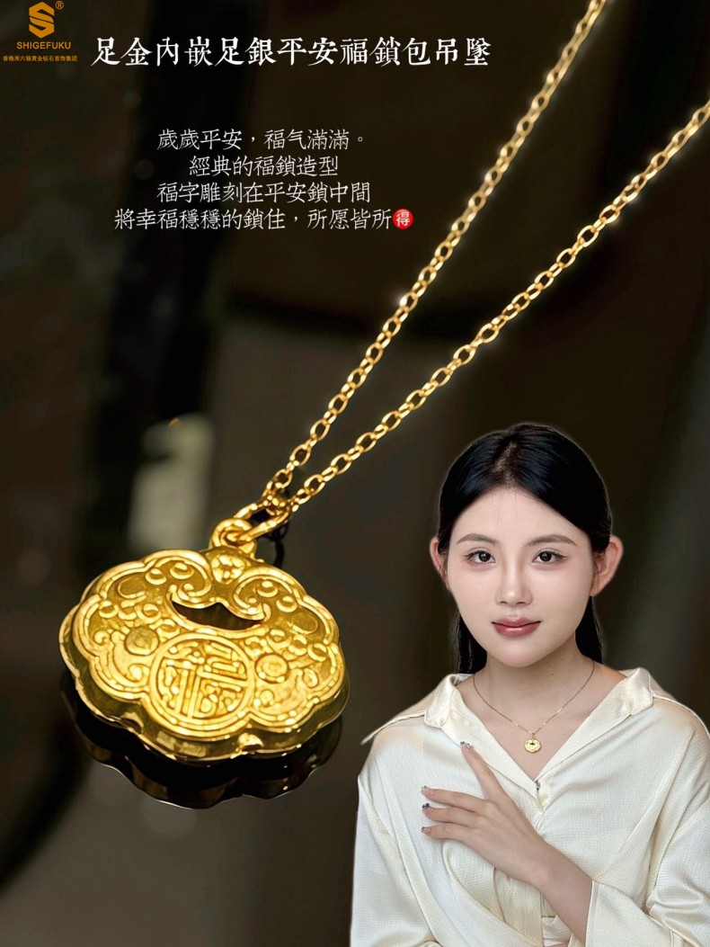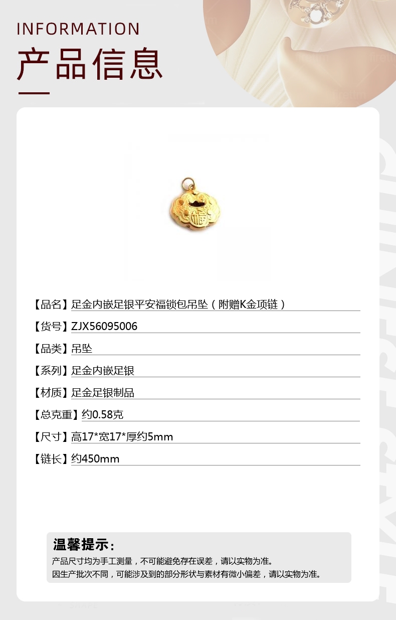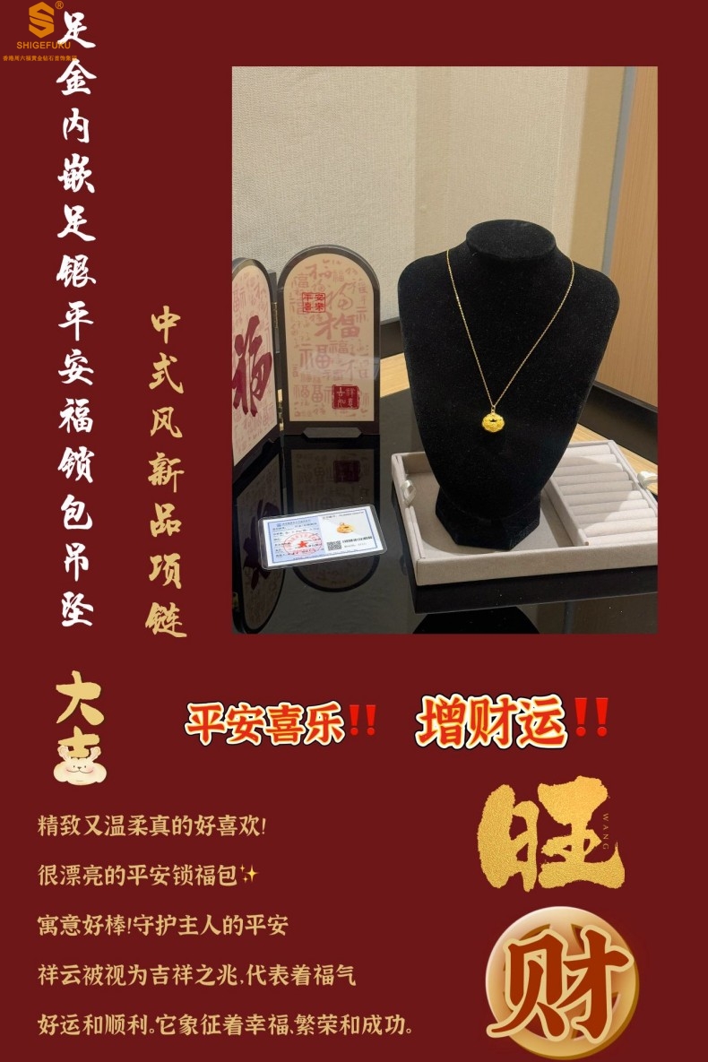 【品名】足金内嵌足银平安福锁包吊坠(附赠K金项链)