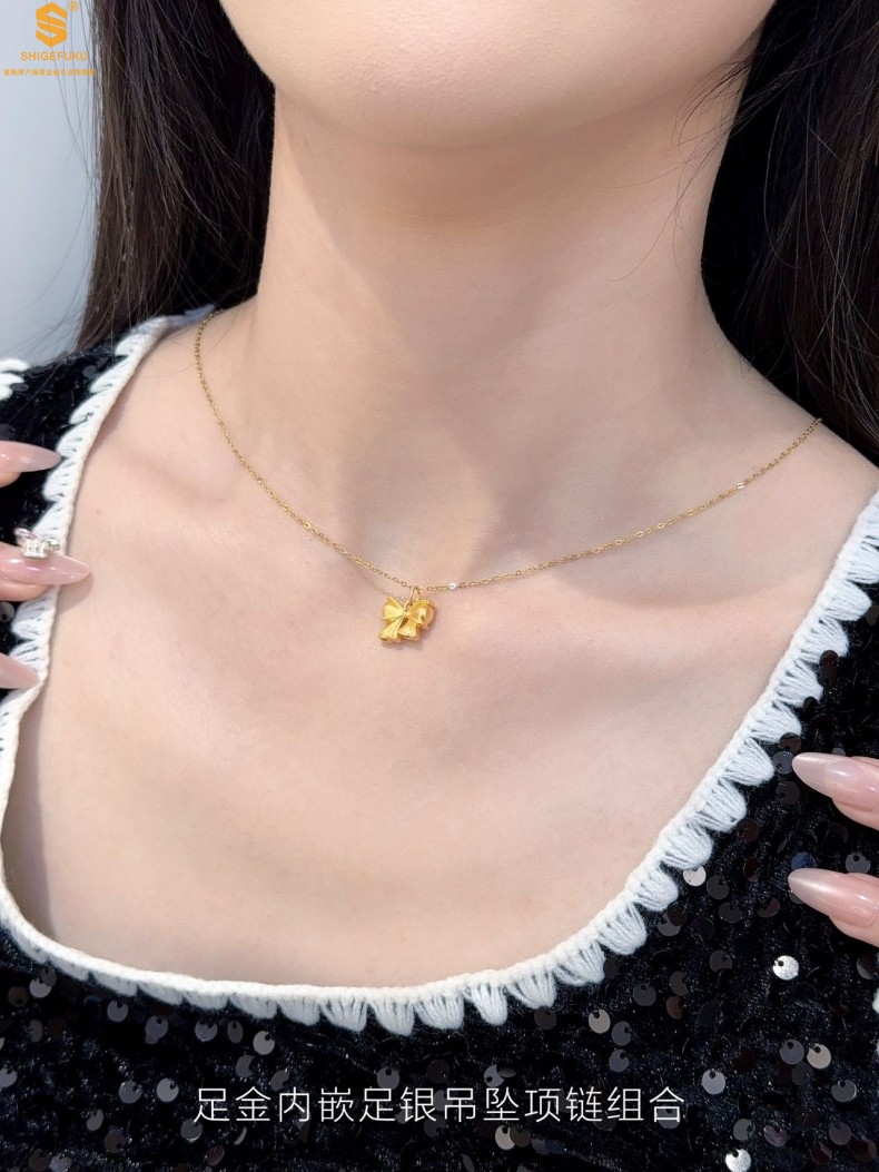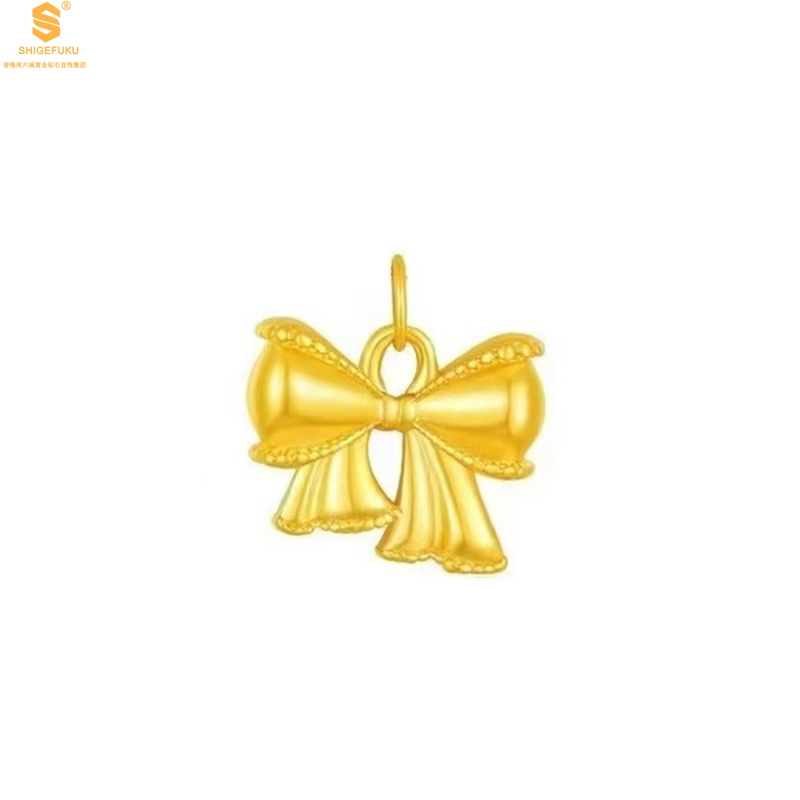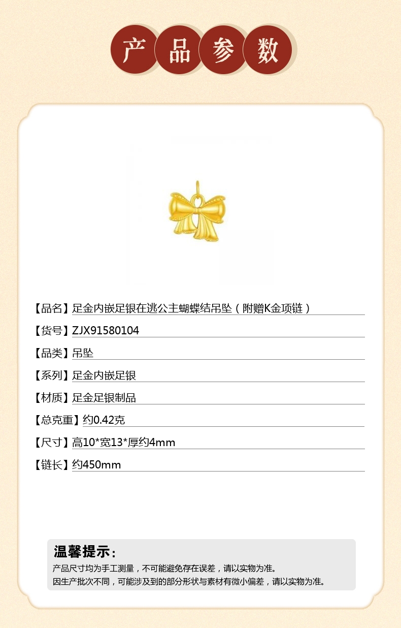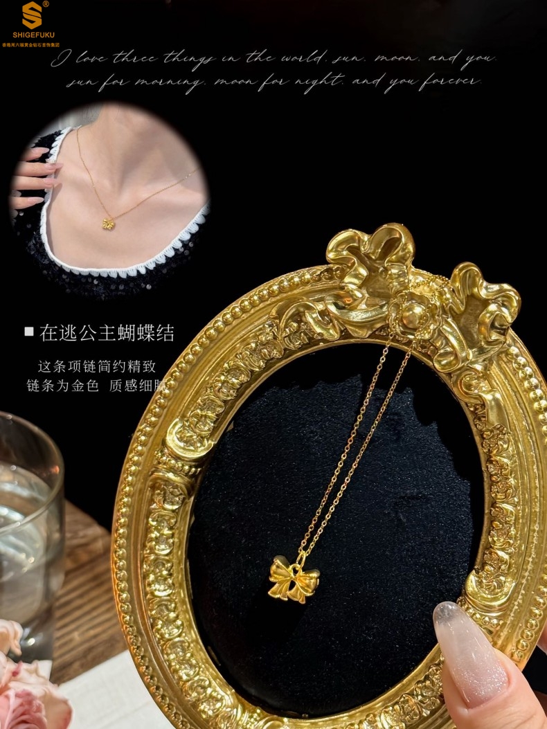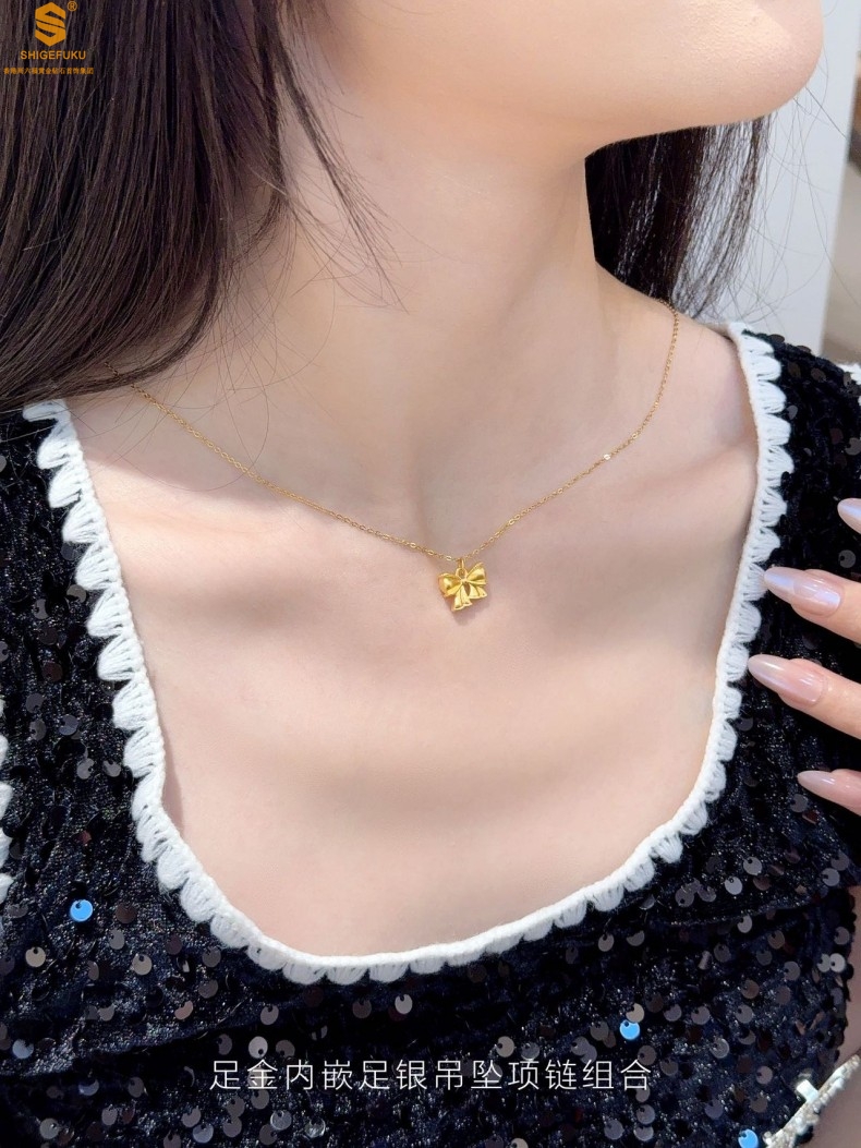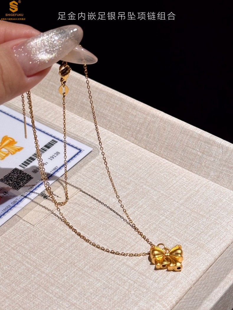【品名】足金内嵌足银在逃公主蝴蝶结吊坠(附赠K金项链)