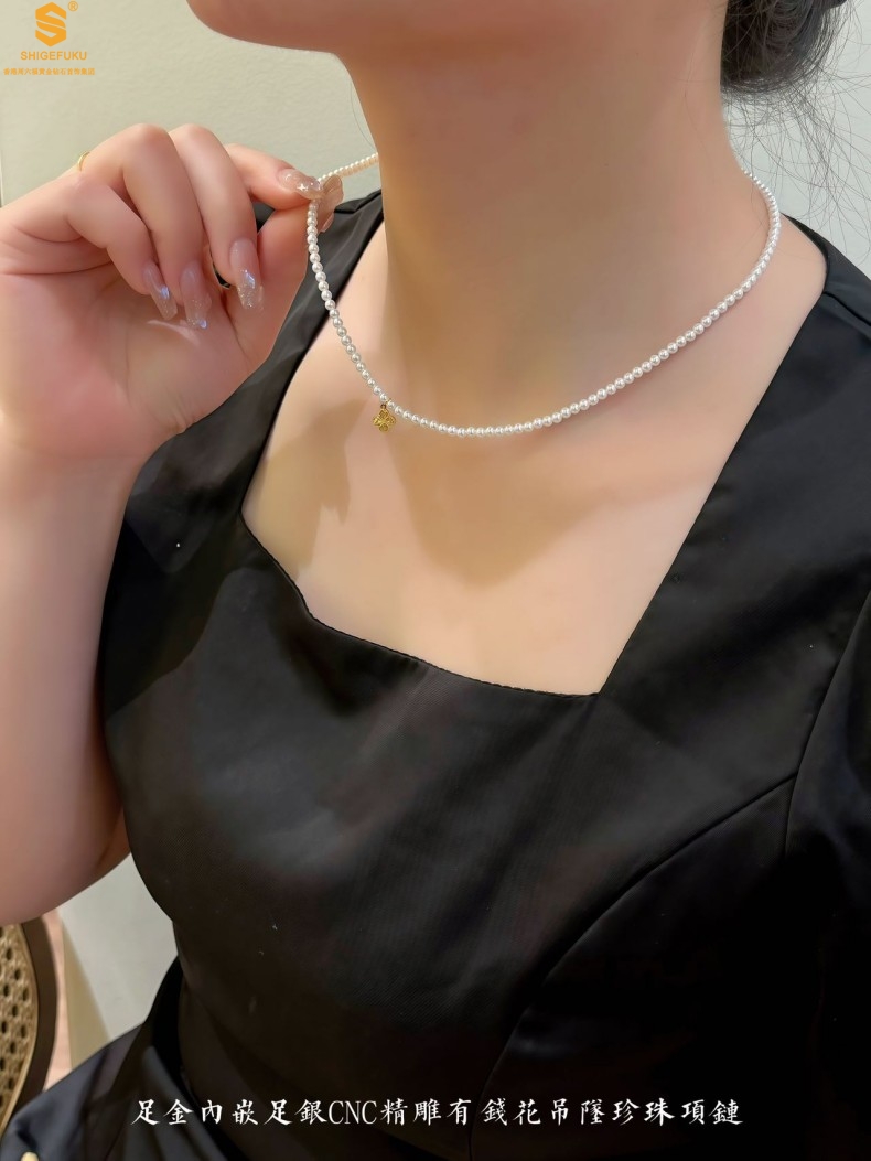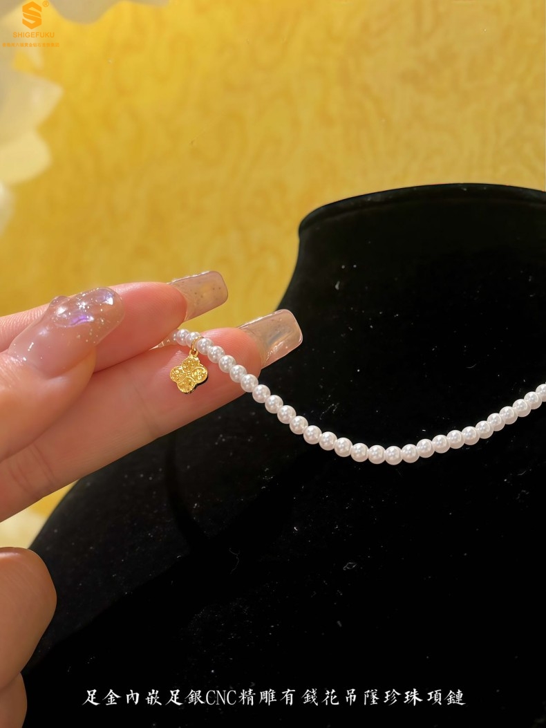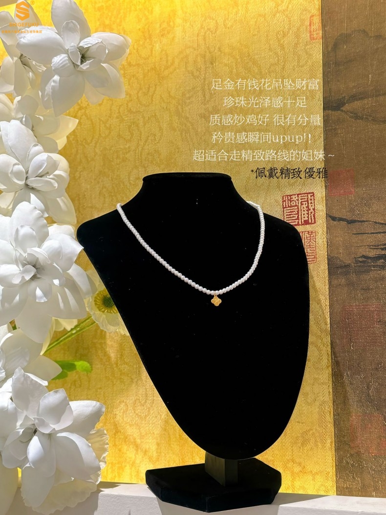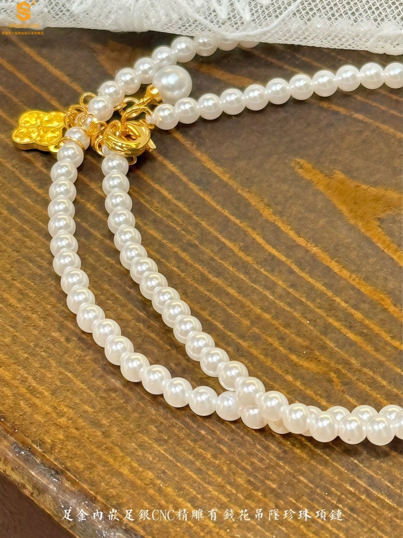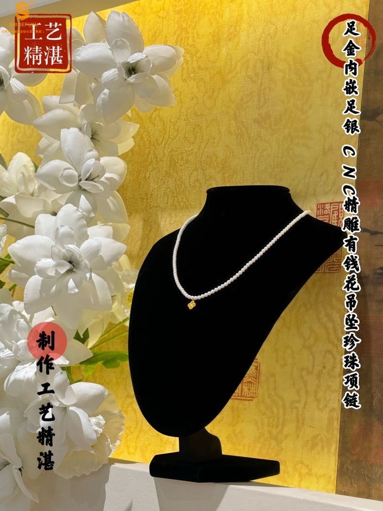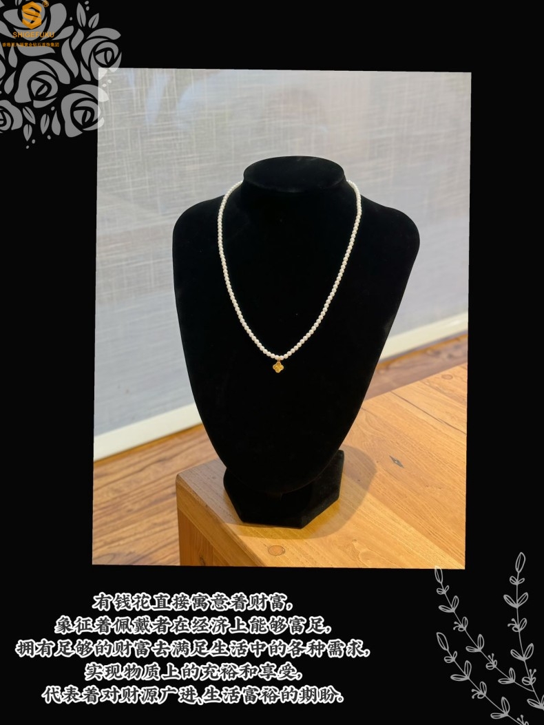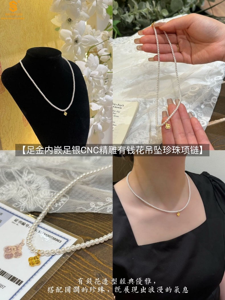 【品名】足金内嵌足银CNC精雕有钱花吊坠珍珠项链(高定礼盒)