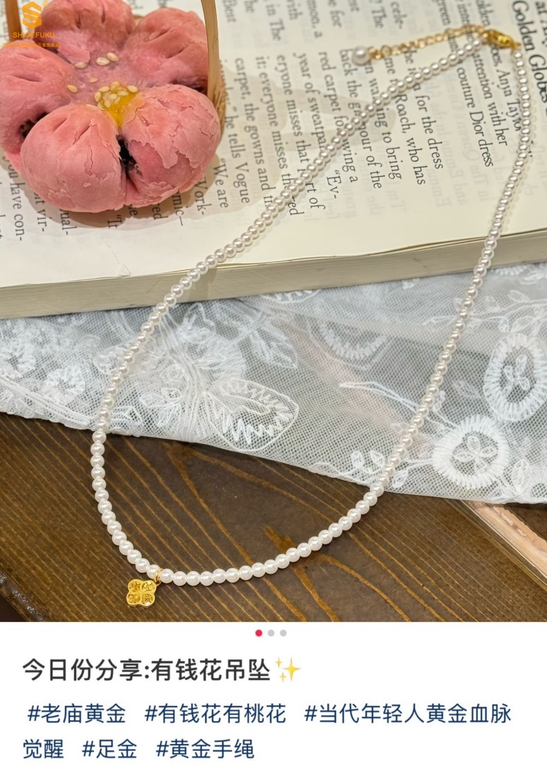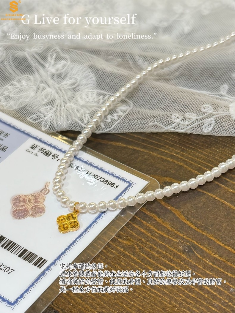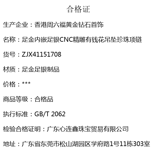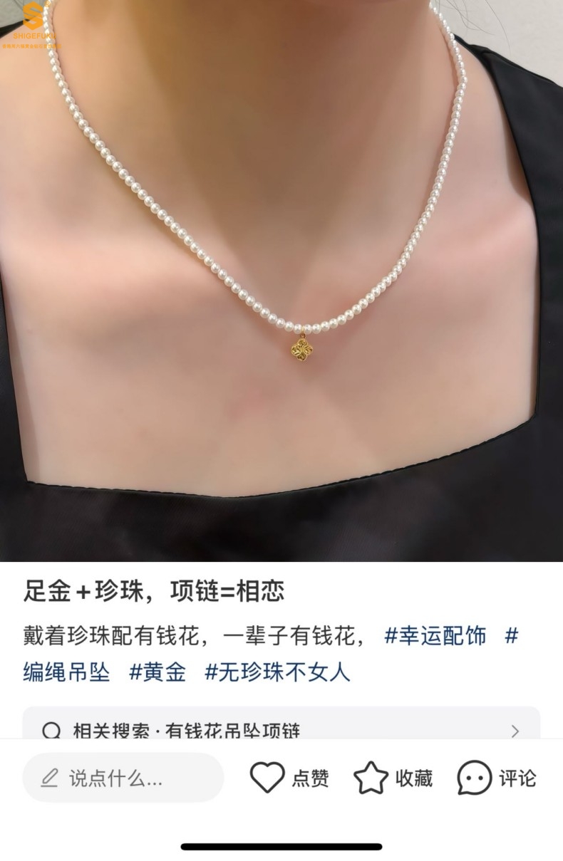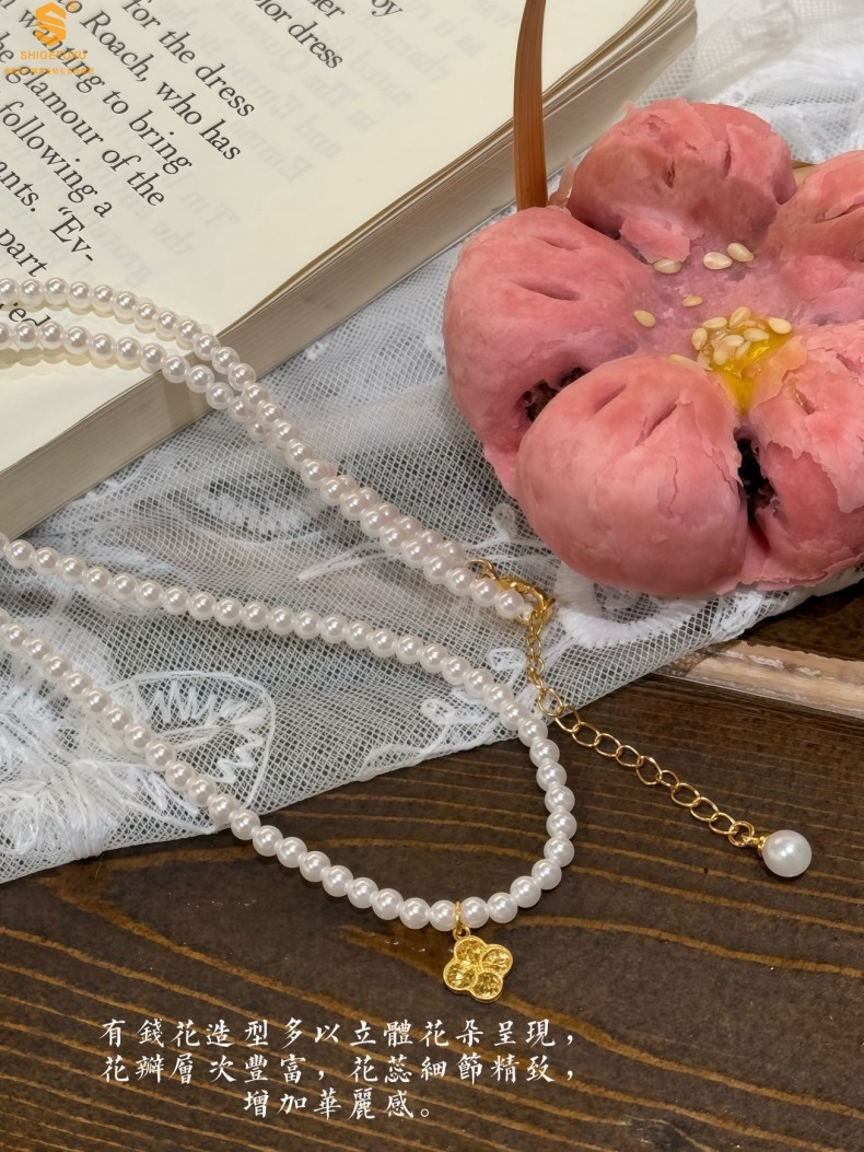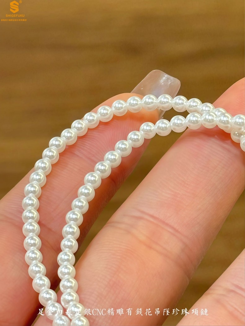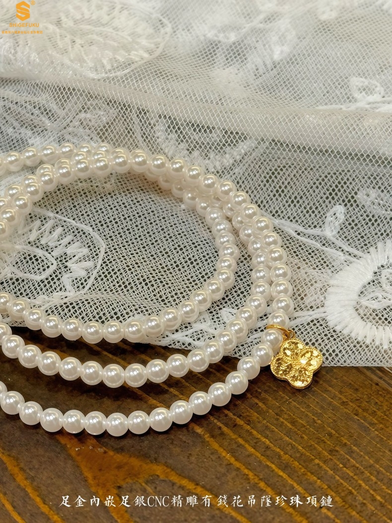 【品名】足金内嵌足银CNC精雕有钱花吊坠珍珠项链(高定礼盒)