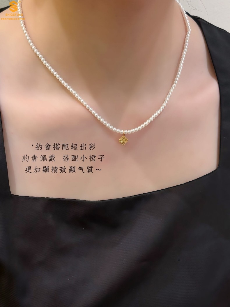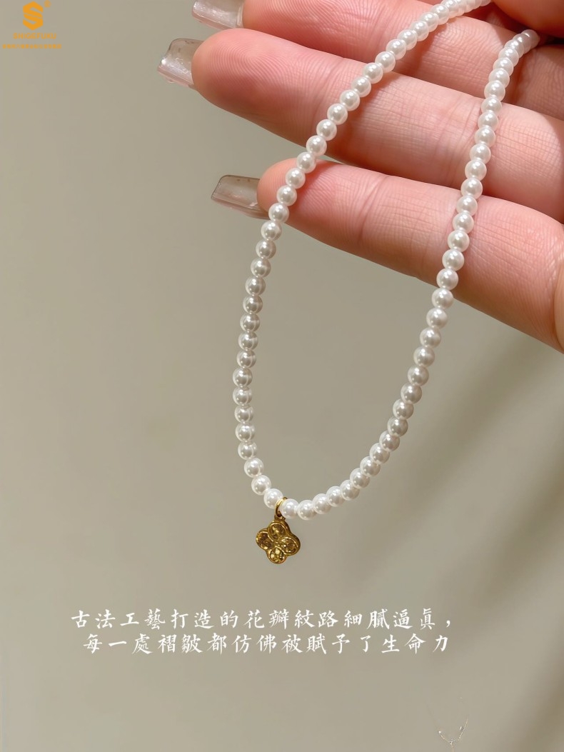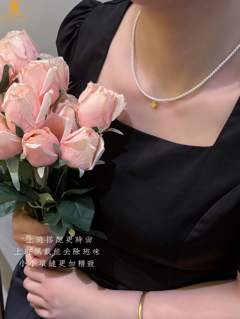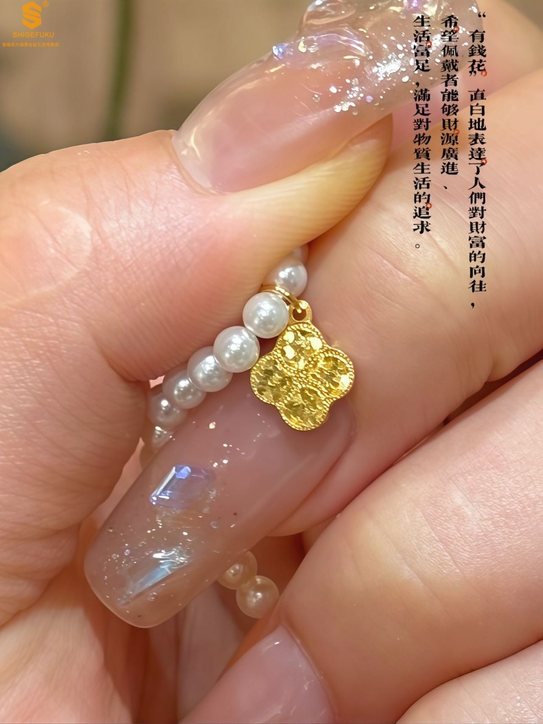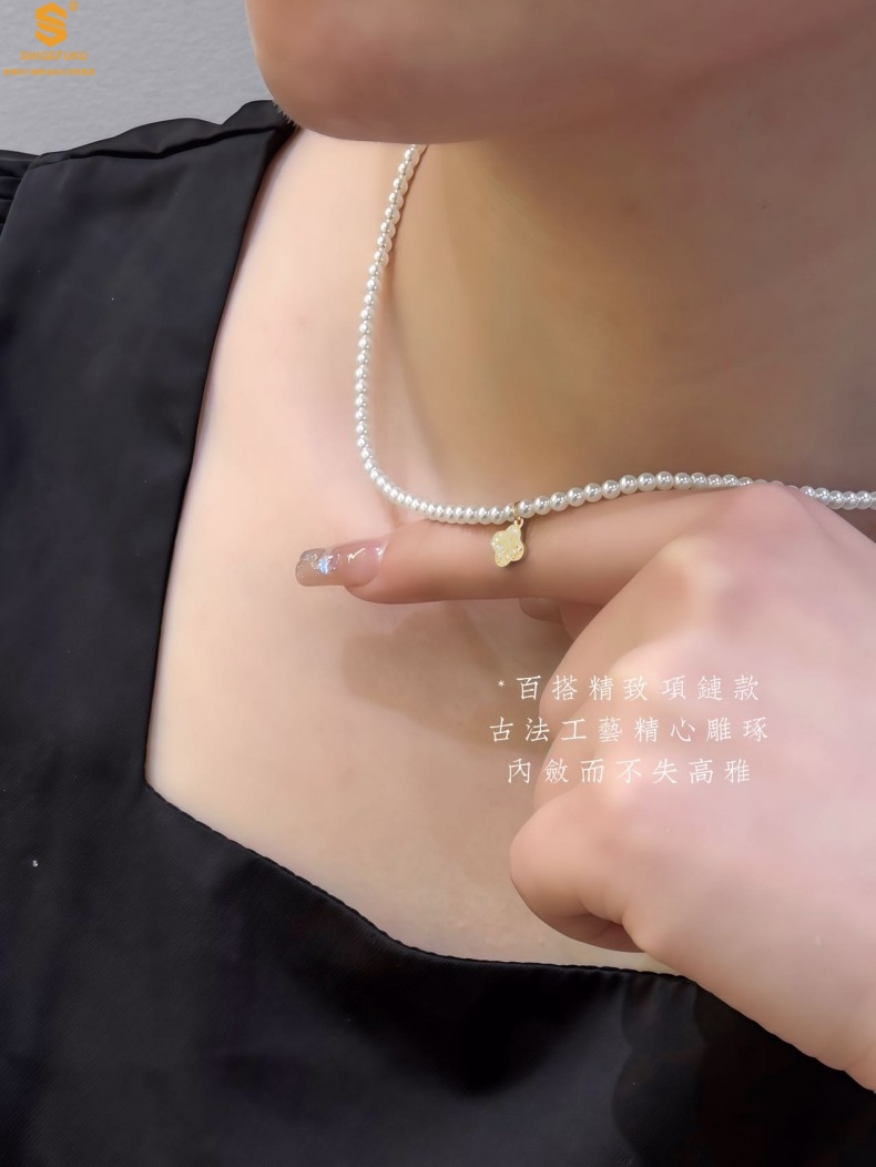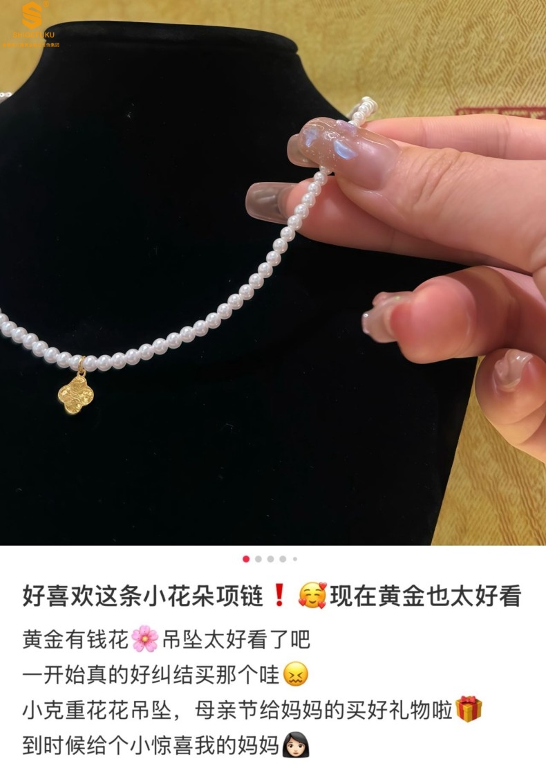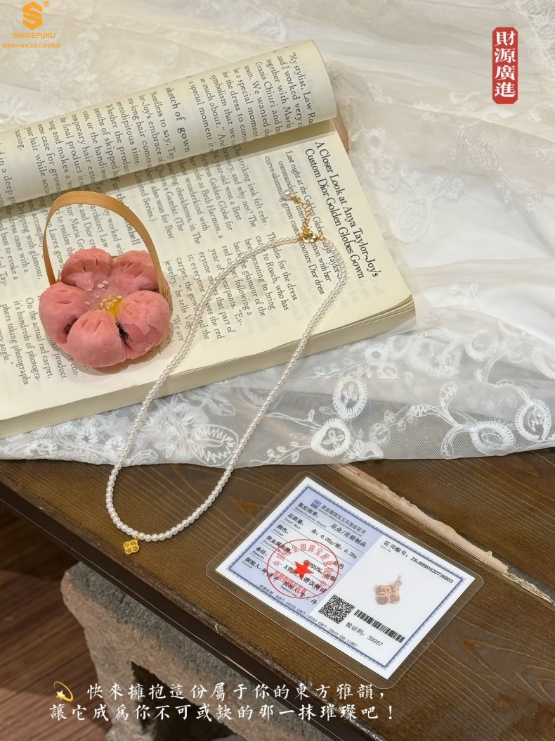 【品名】足金内嵌足银CNC精雕有钱花吊坠珍珠项链(高定礼盒)