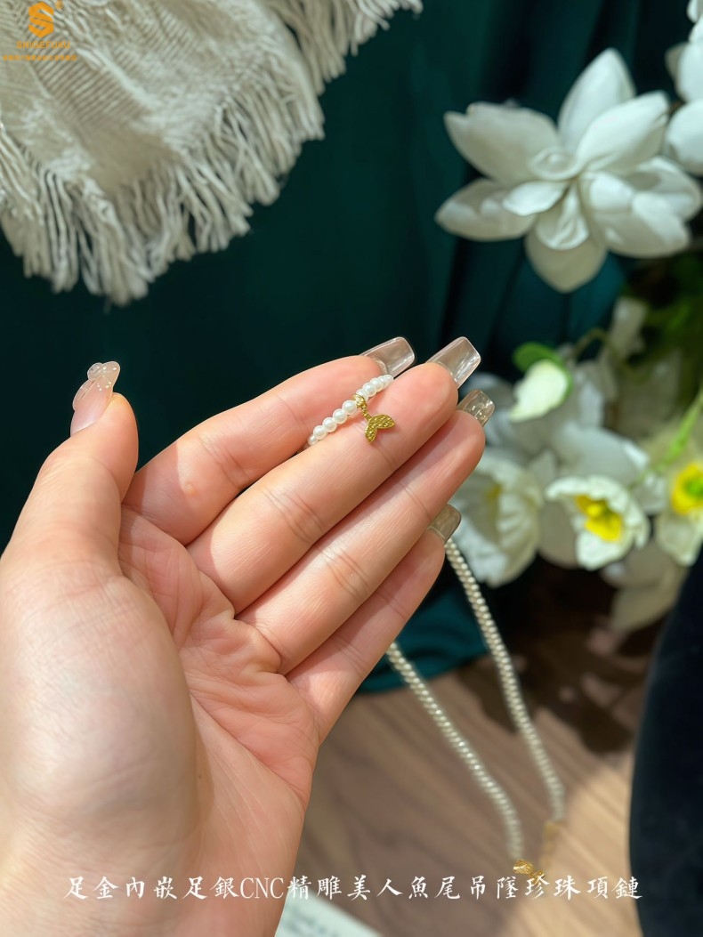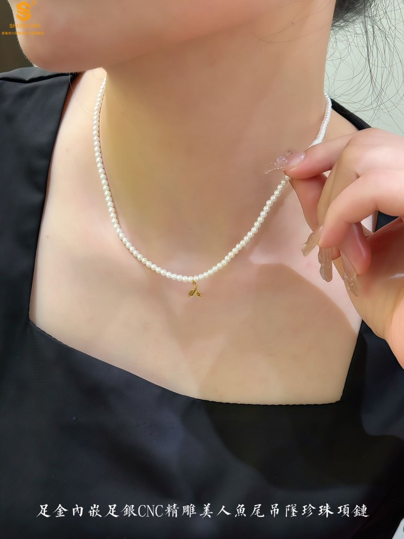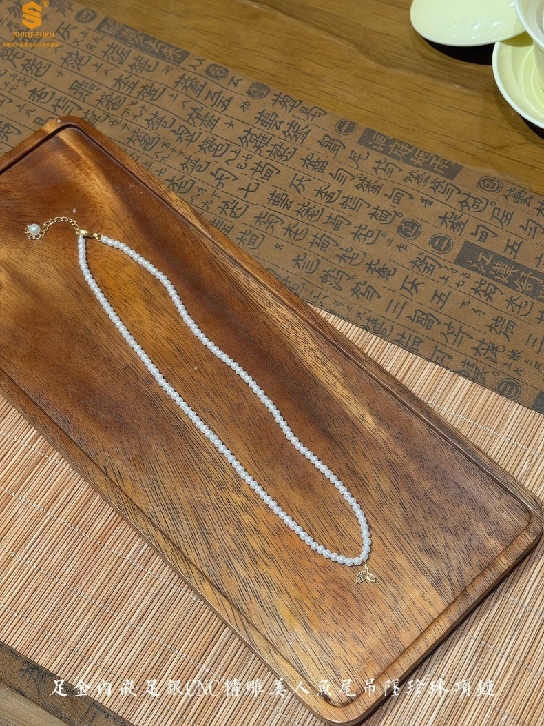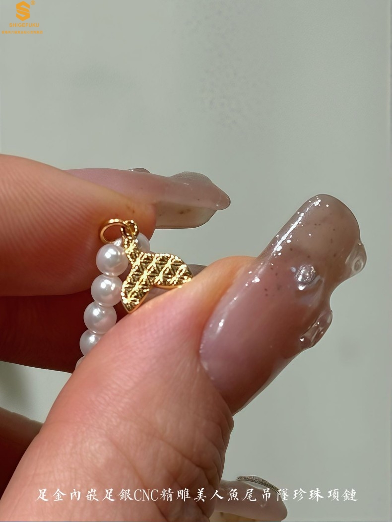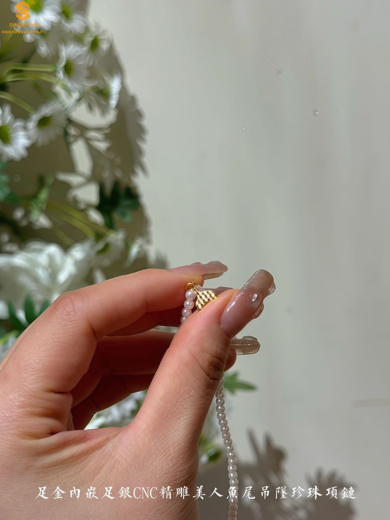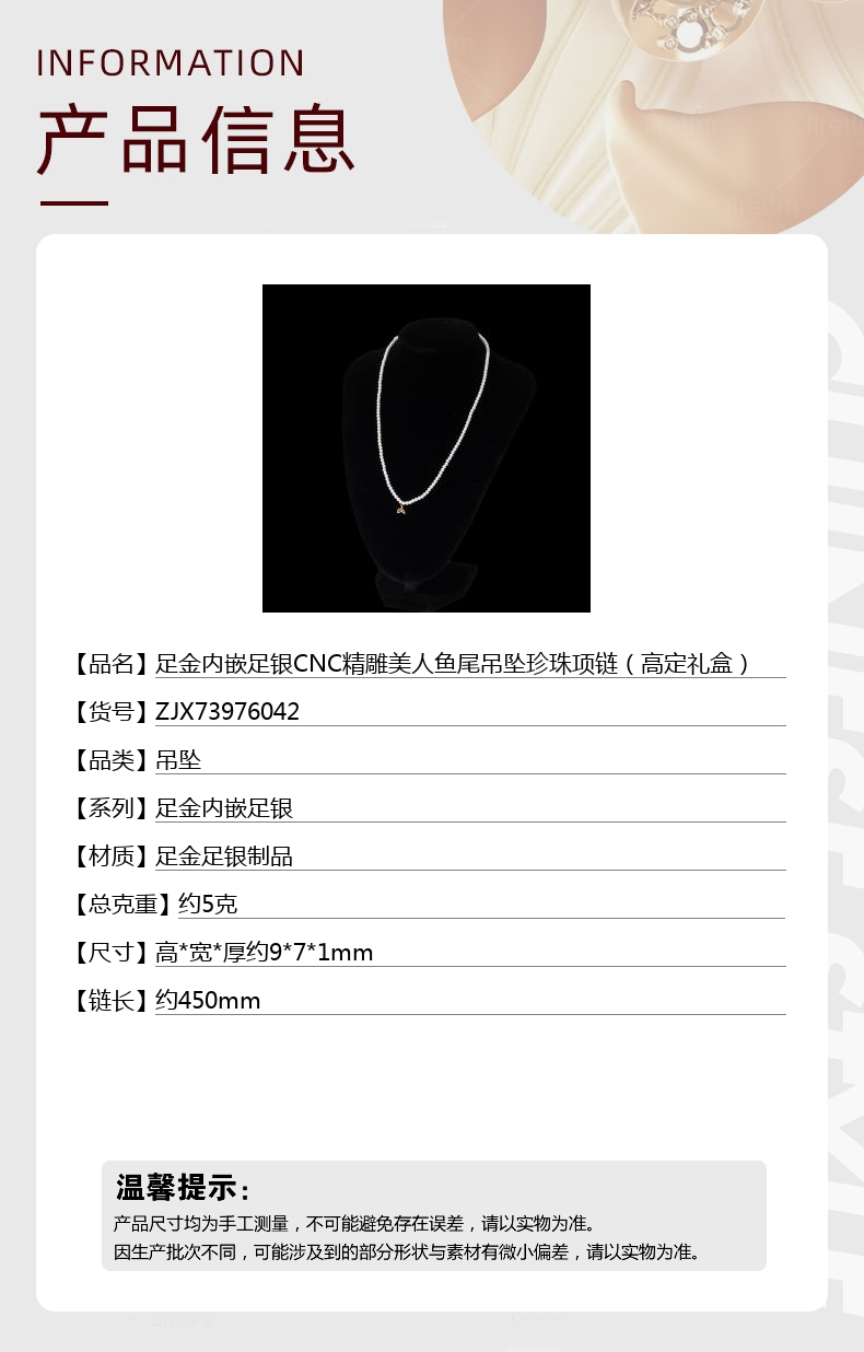 【品名】足金内嵌足银CNC精雕美人鱼尾吊坠珍珠项链(高定礼盒)