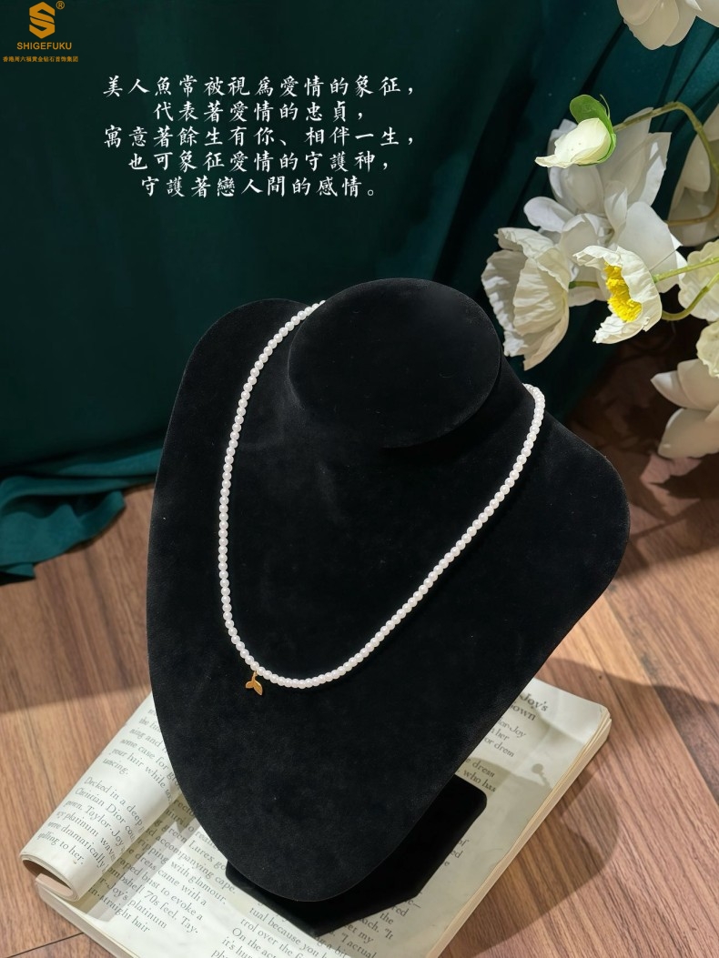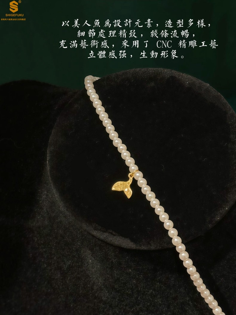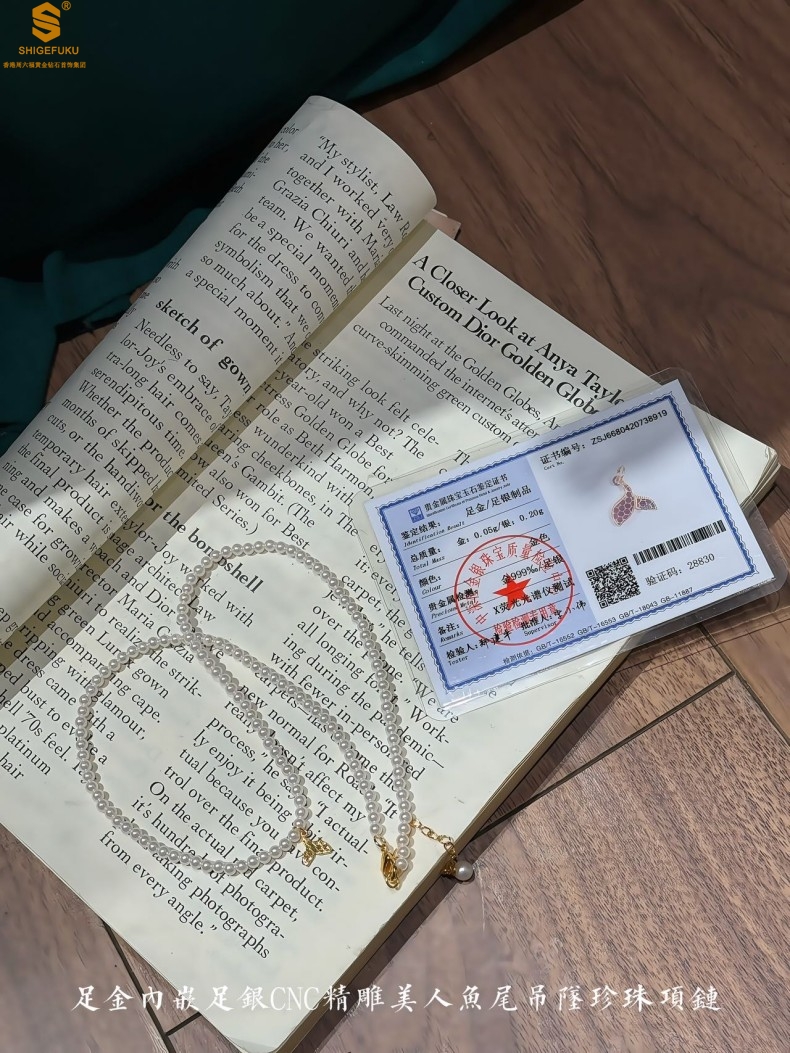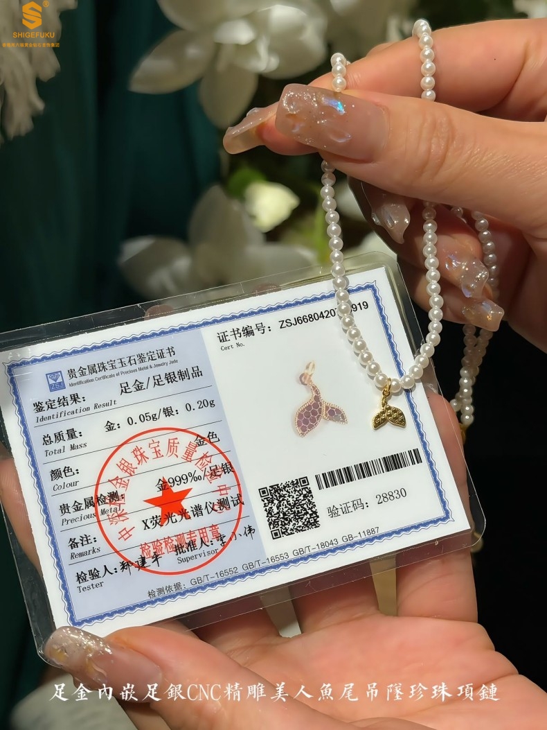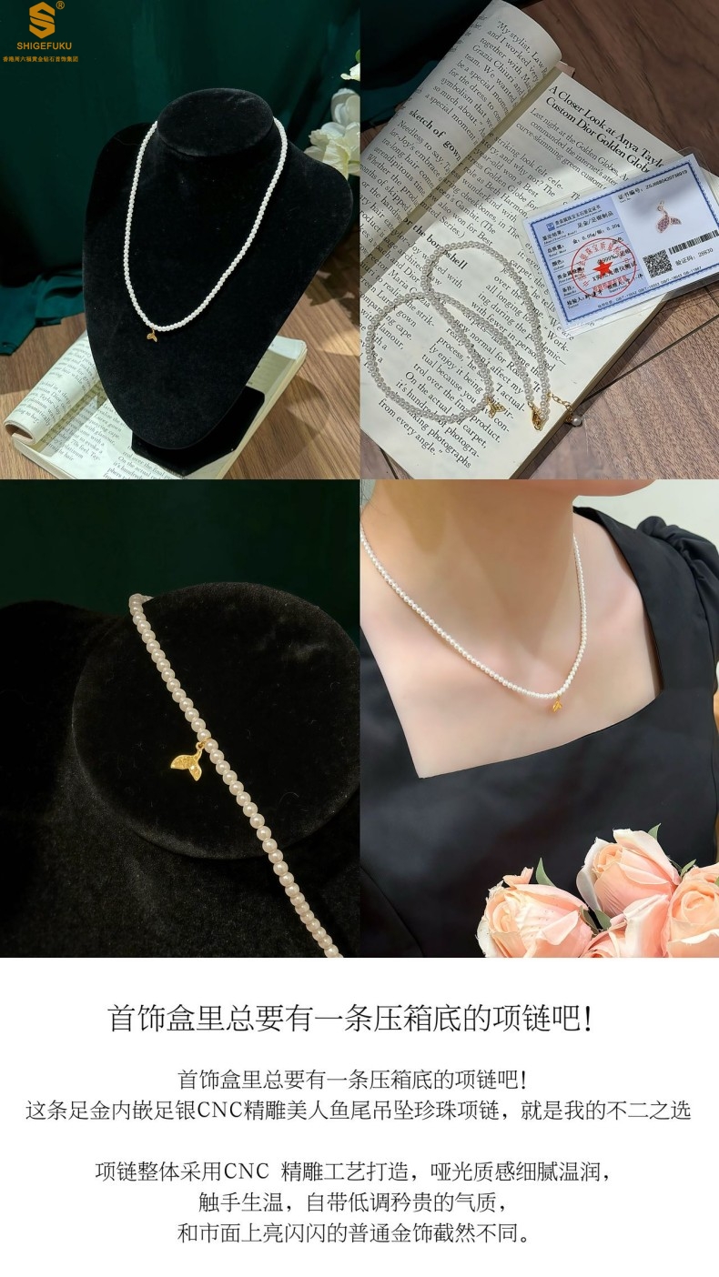 【品名】足金内嵌足银CNC精雕美人鱼尾吊坠珍珠项链(高定礼盒)