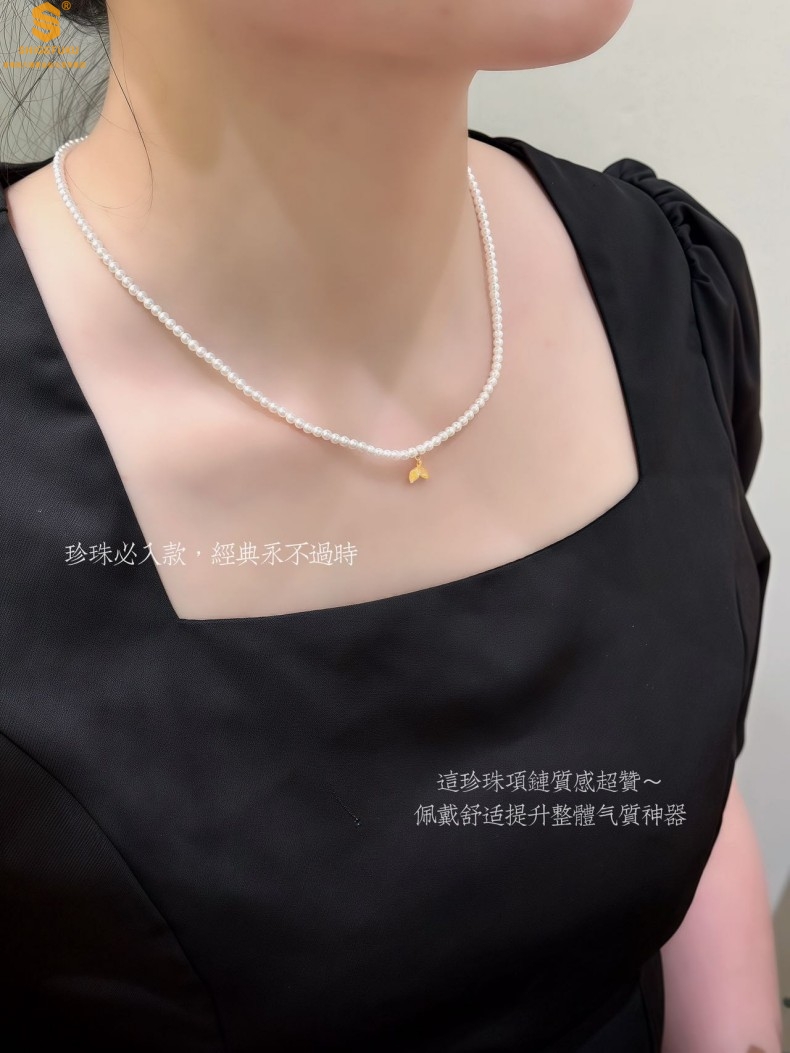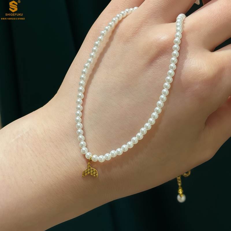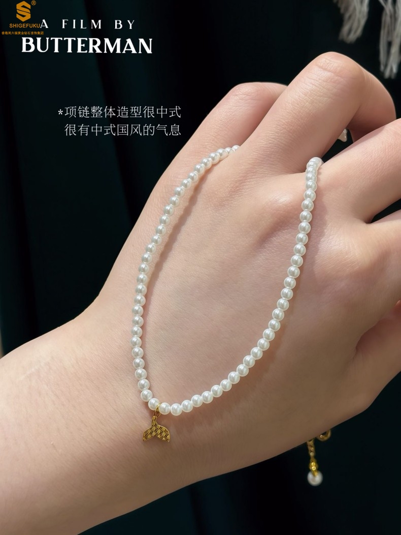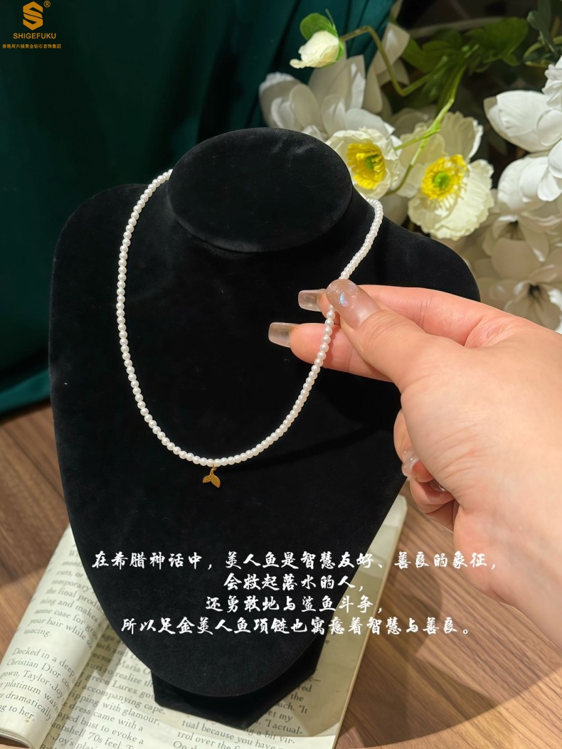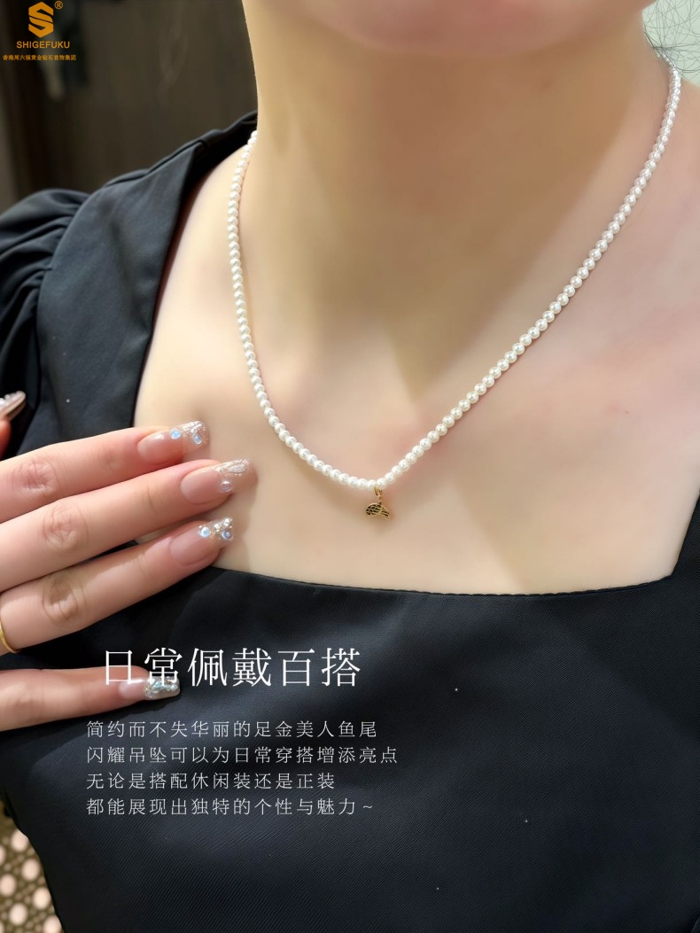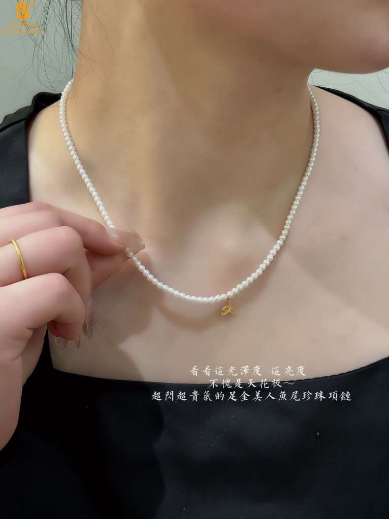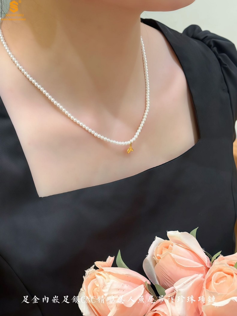 【品名】足金内嵌足银CNC精雕美人鱼尾吊坠珍珠项链(高定礼盒)