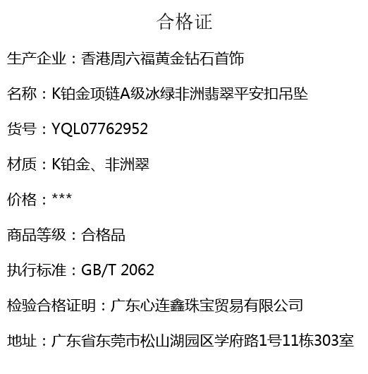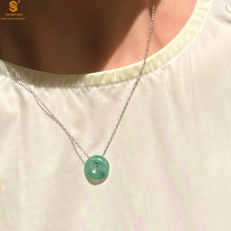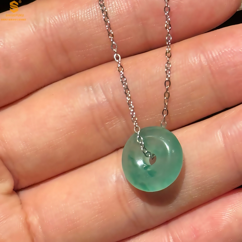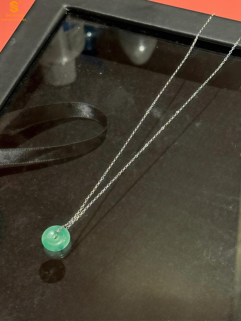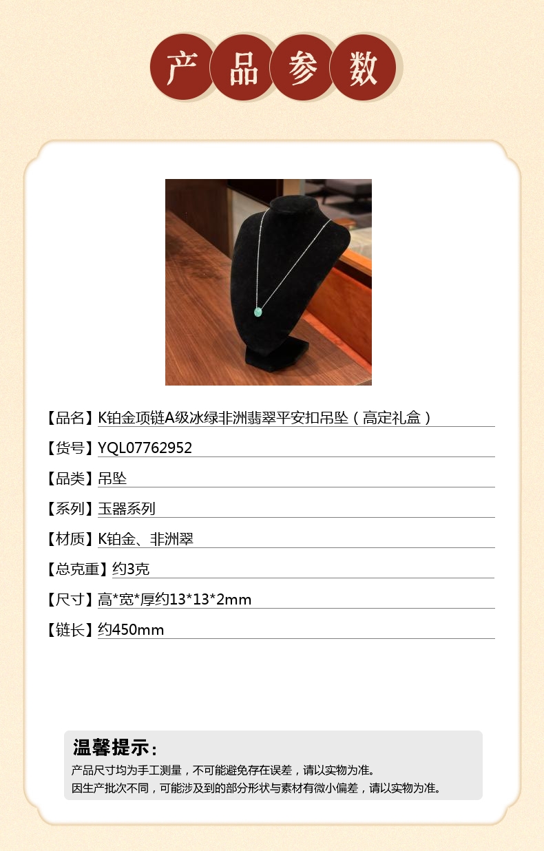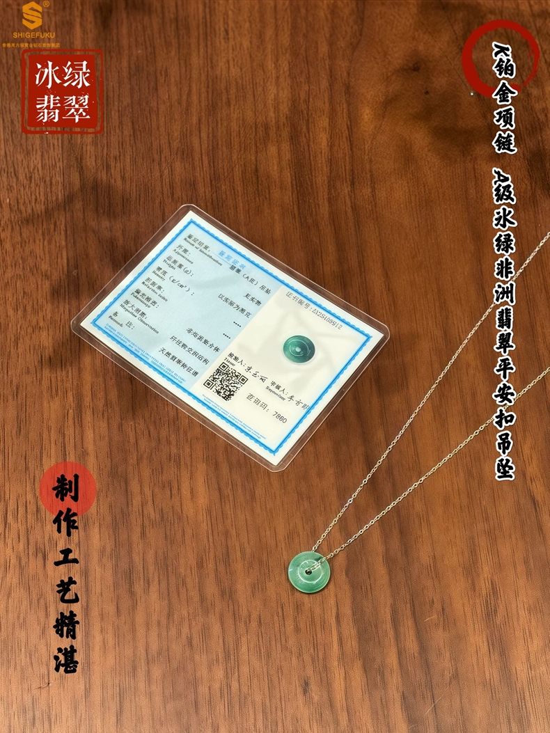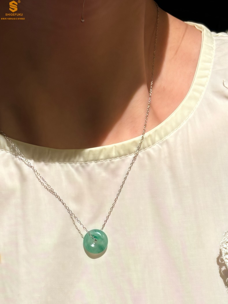 【品名】K铂金项链A级冰绿非洲翡翠平安扣吊坠(高定礼盒)
