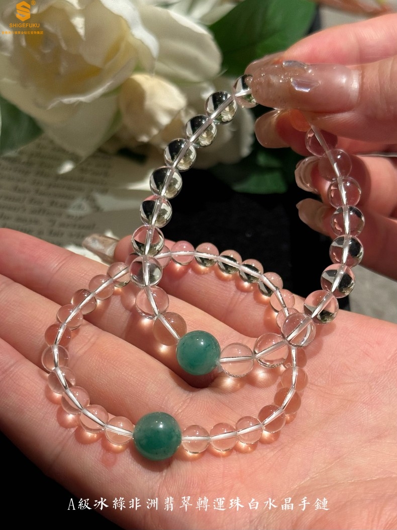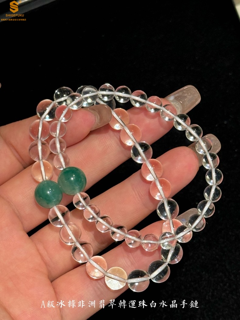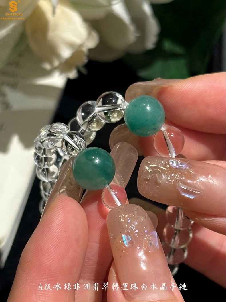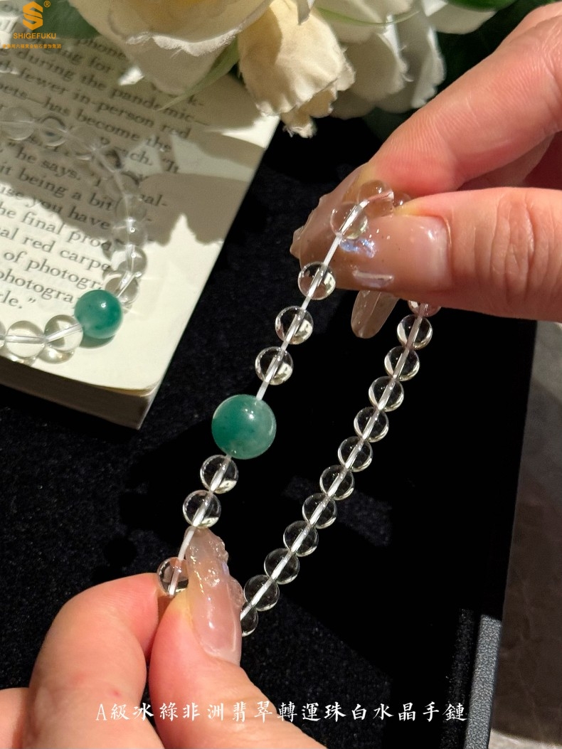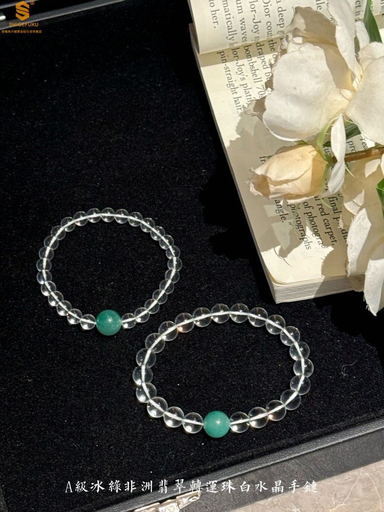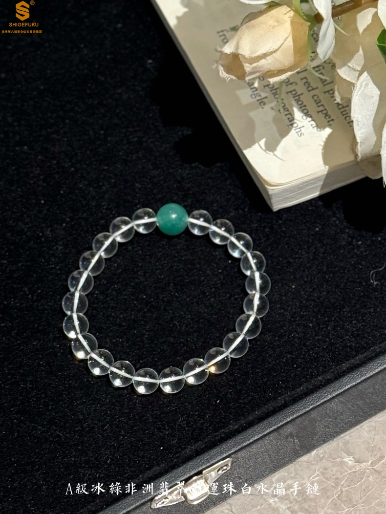 【品名】A级冰绿非洲翡翠转运珠白水晶手链8mm(高定礼盒)