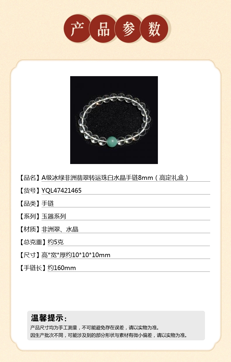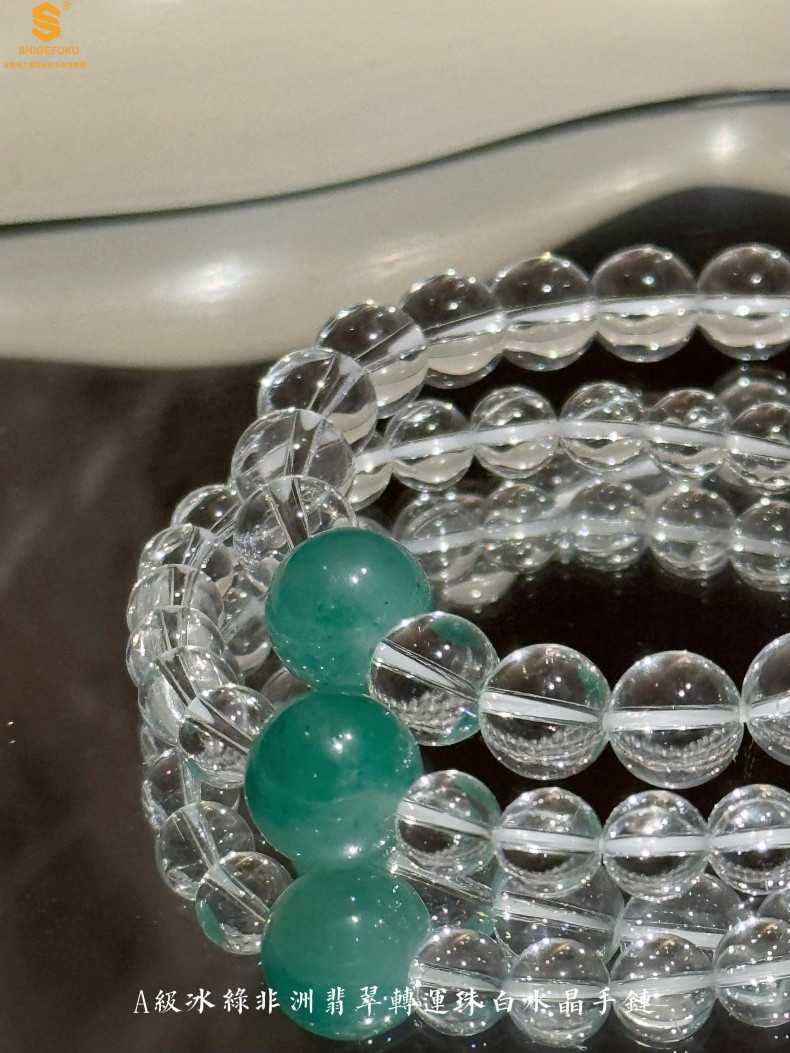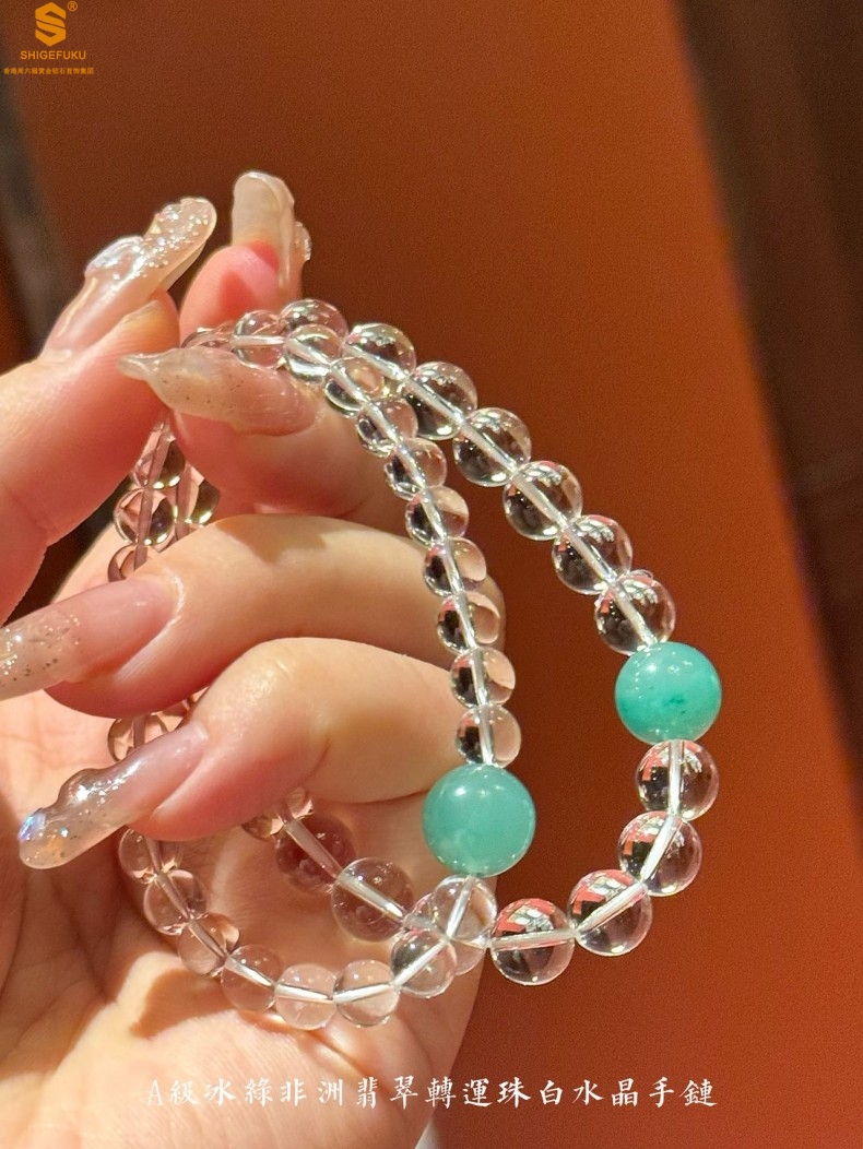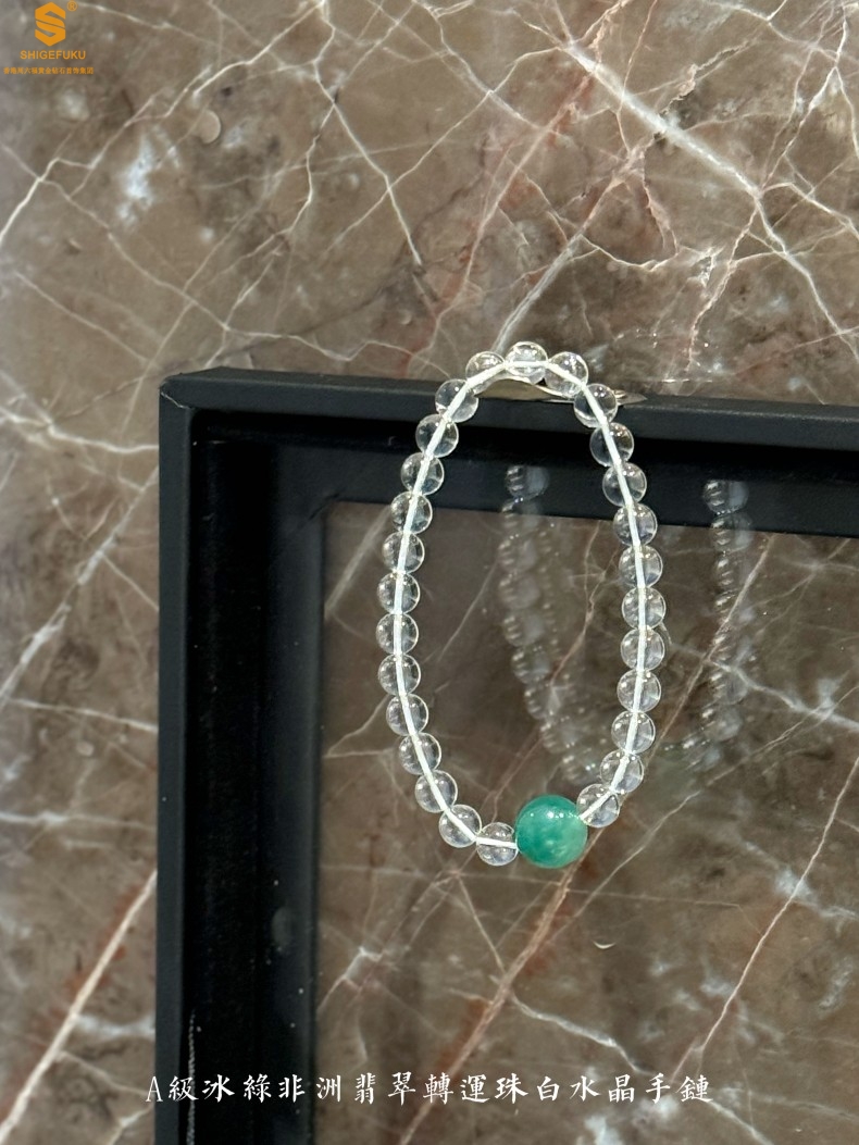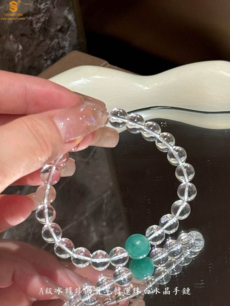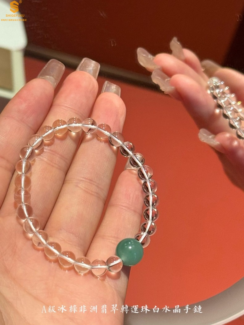 【品名】A级冰绿非洲翡翠转运珠白水晶手链8mm(高定礼盒)