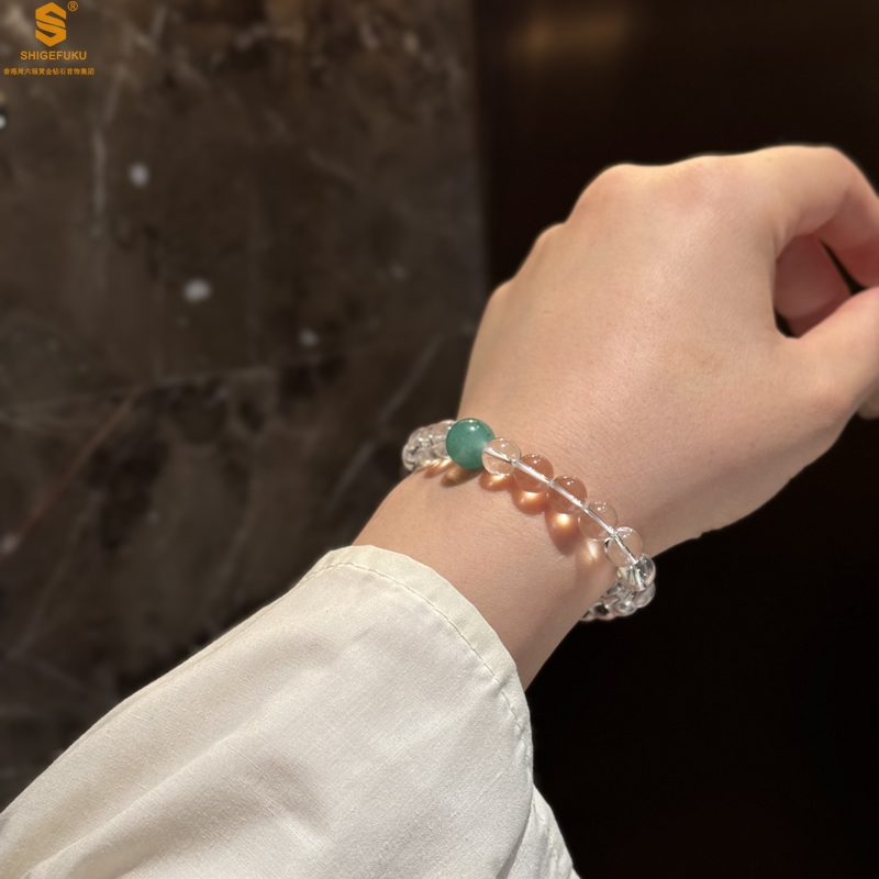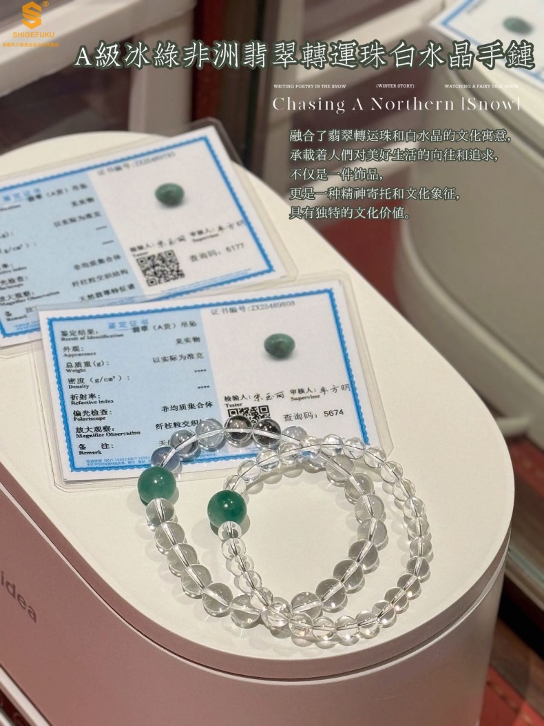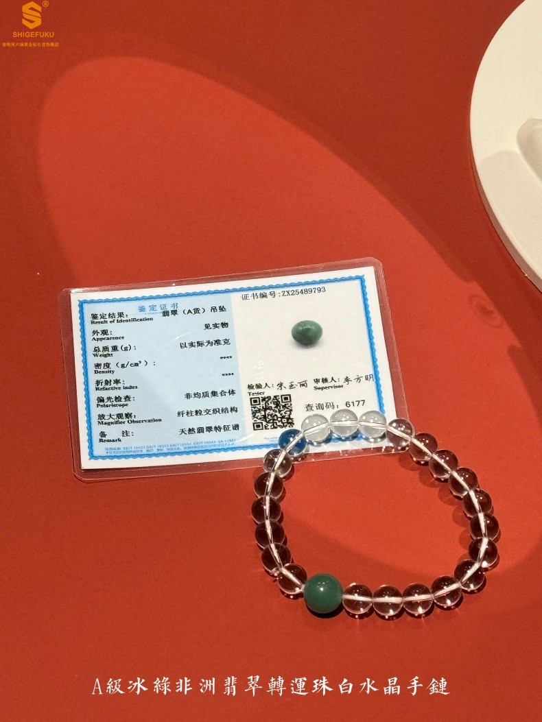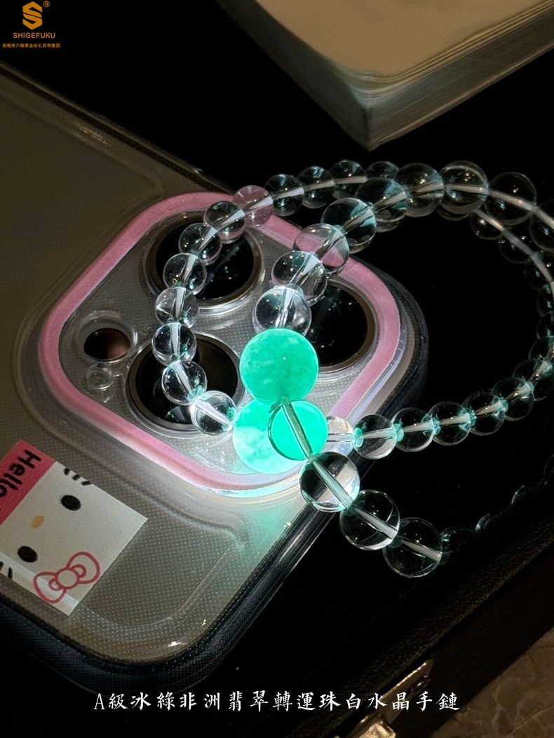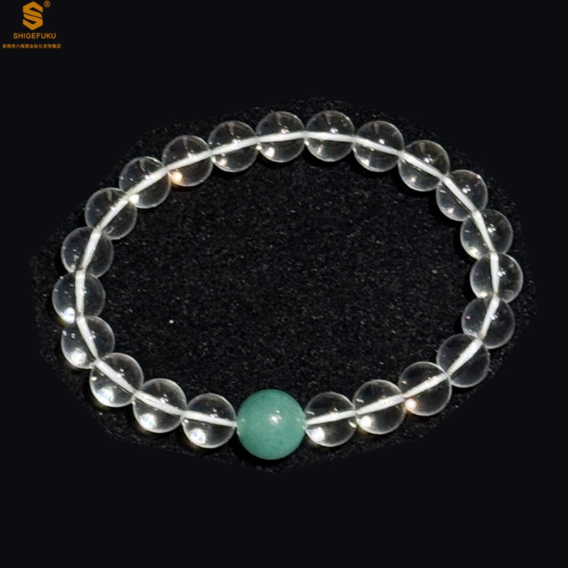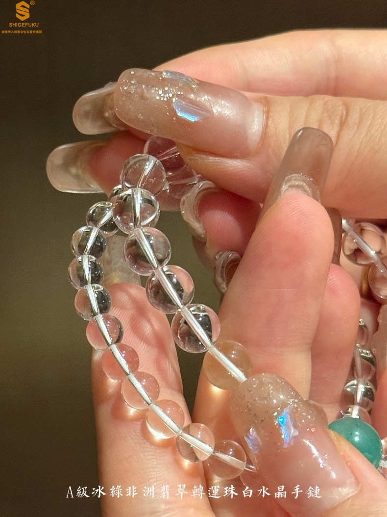 【品名】A级冰绿非洲翡翠转运珠白水晶手链8mm(高定礼盒)