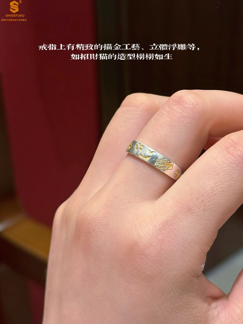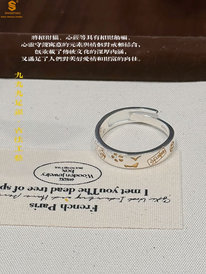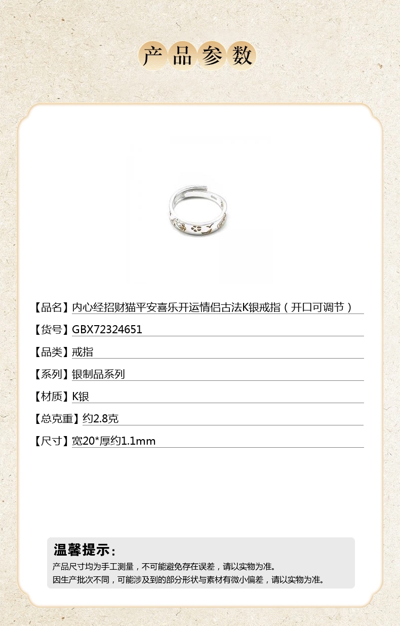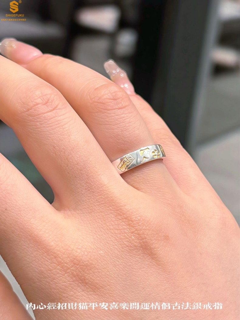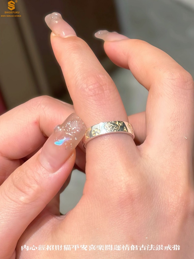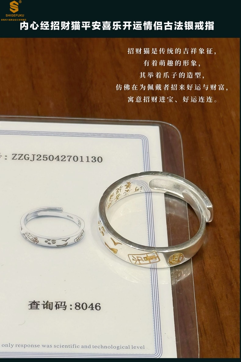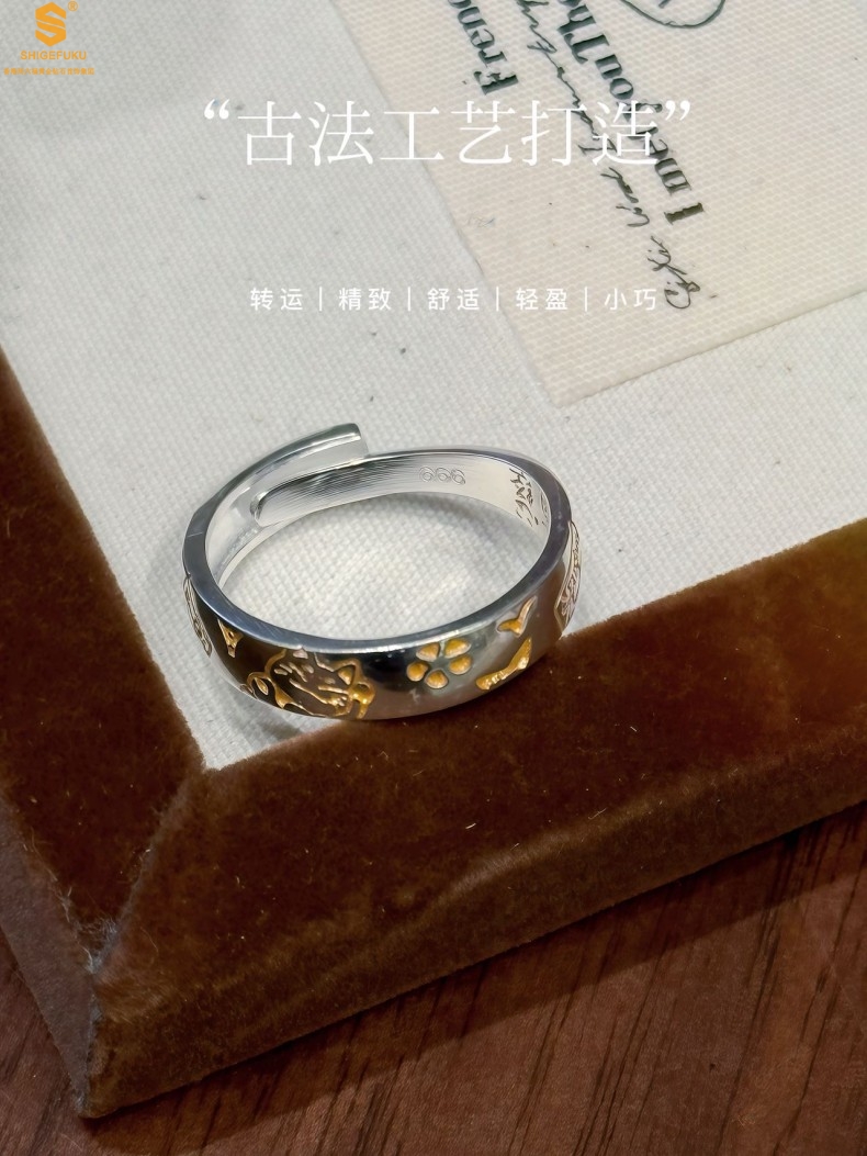 【品名】内心经招财猫平安喜乐开运情侣古法K银戒指(开口可调节)