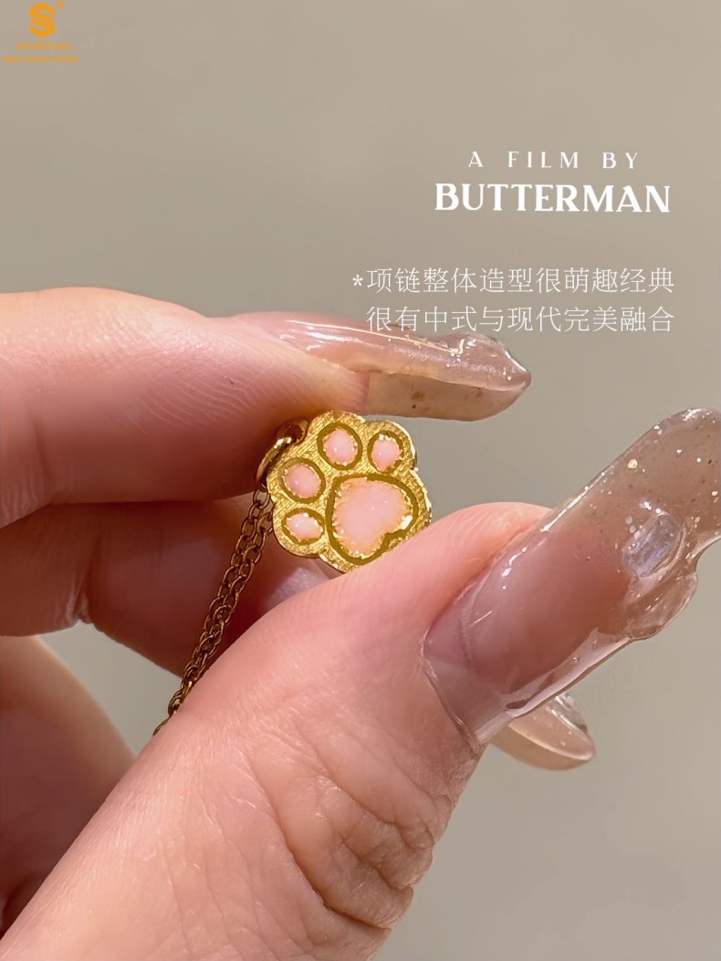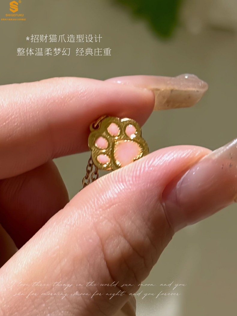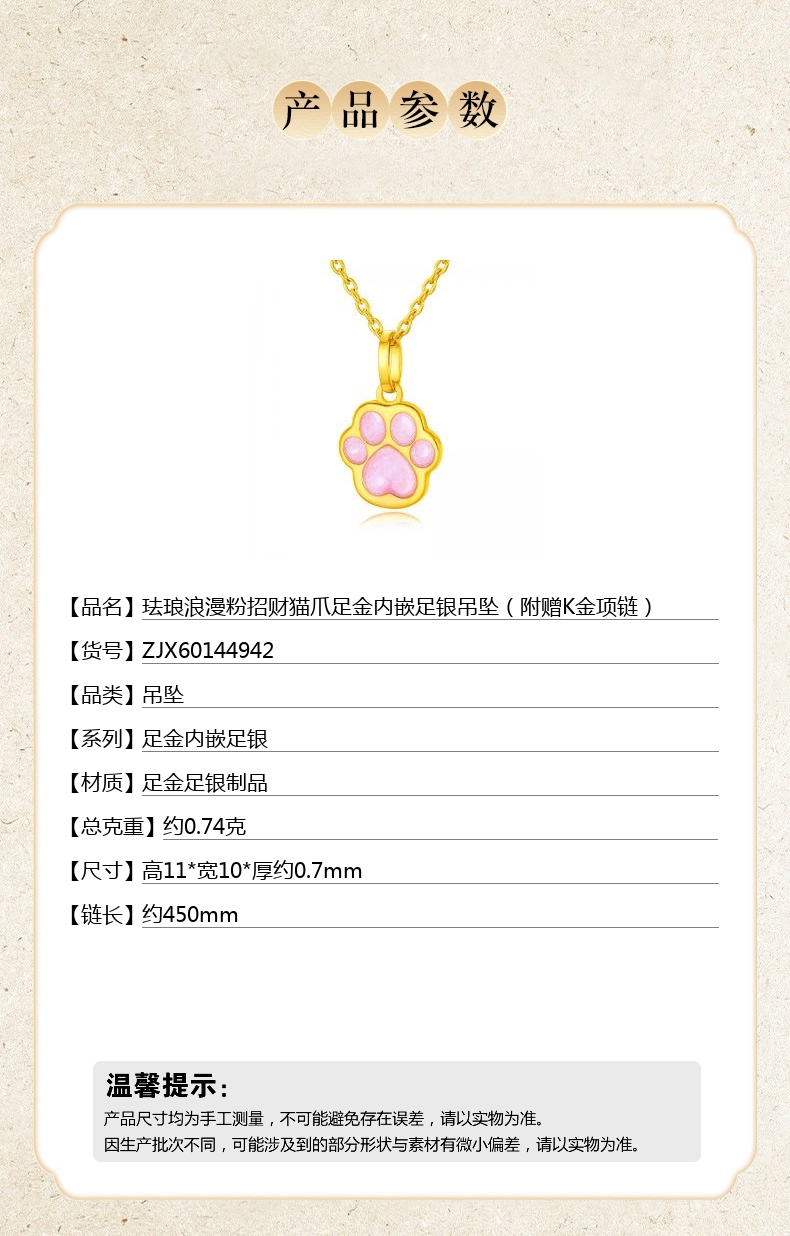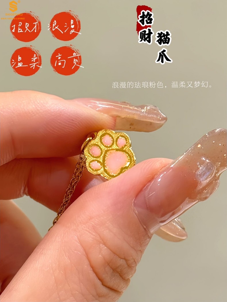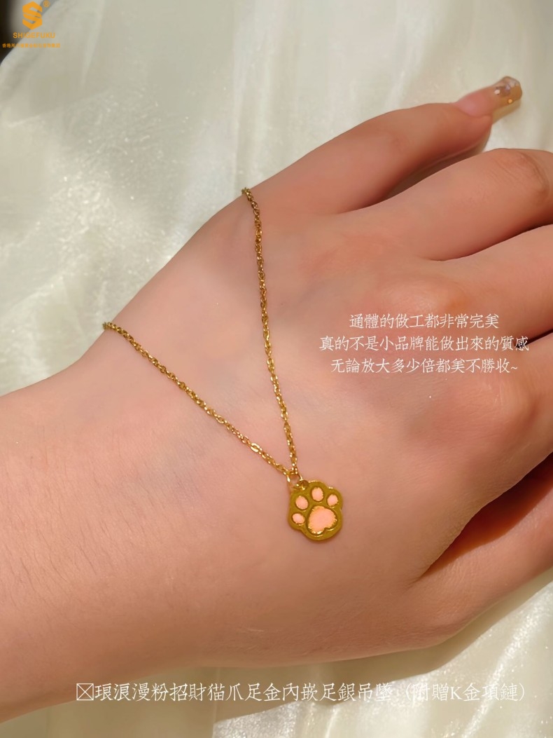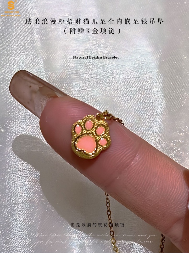 【品名】珐琅浪漫粉招财猫爪足金内嵌足银吊坠(附赠K金项链)