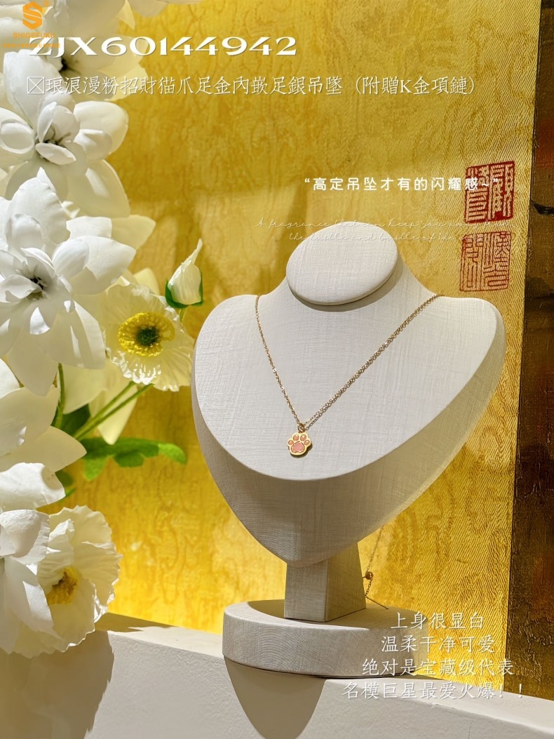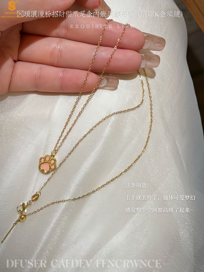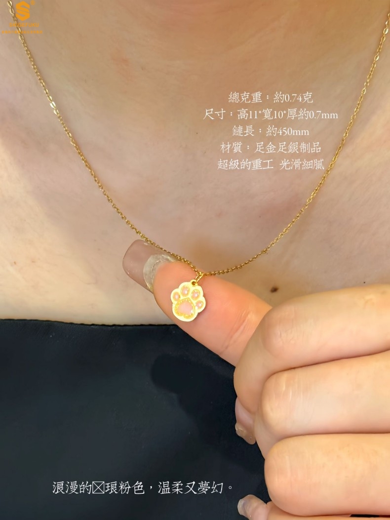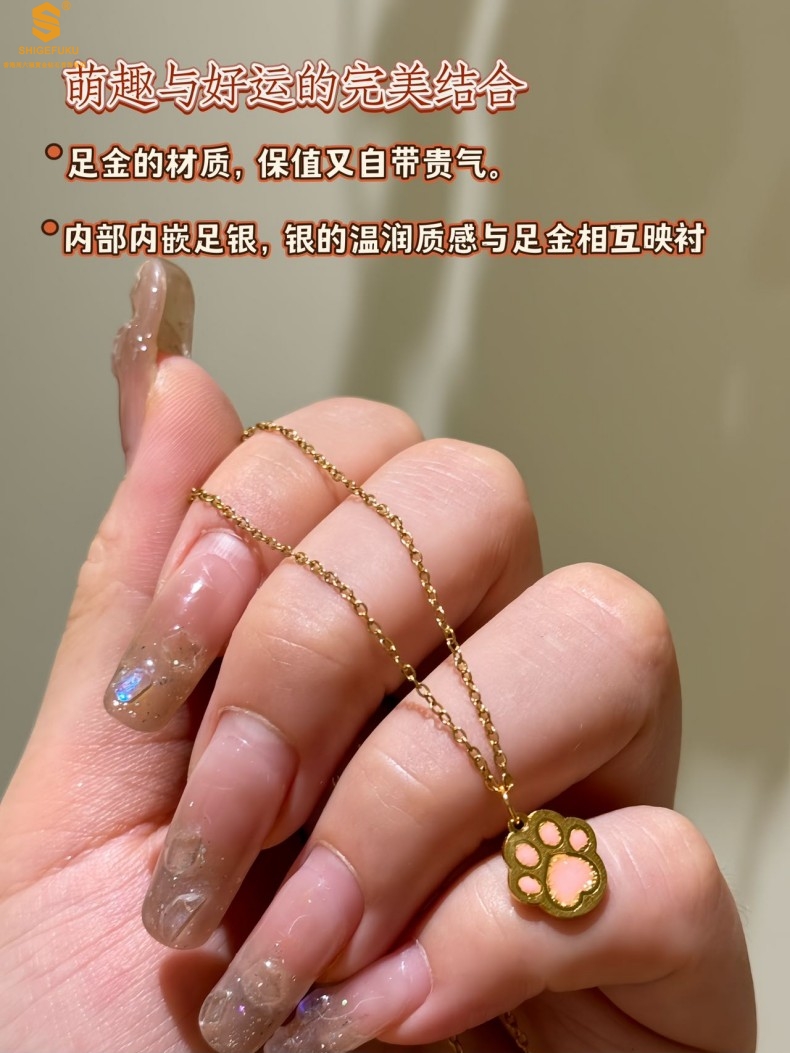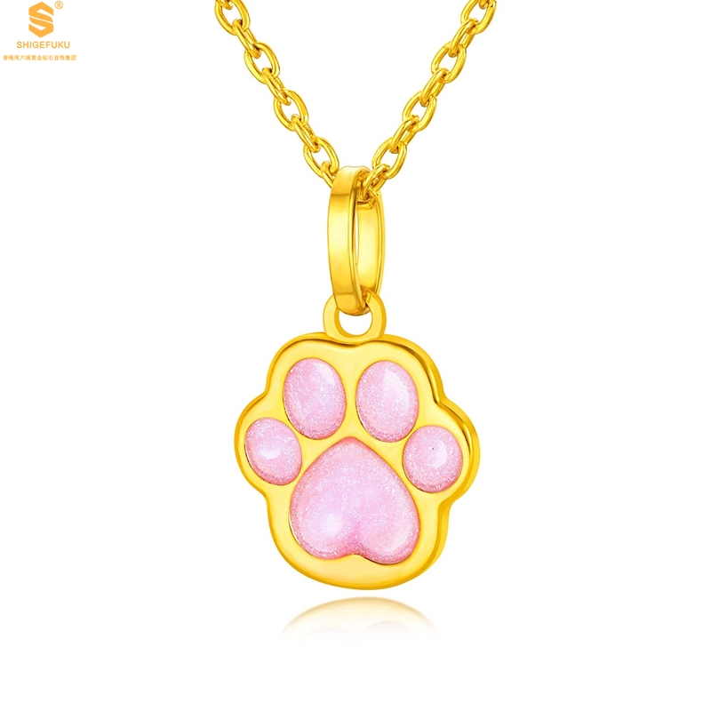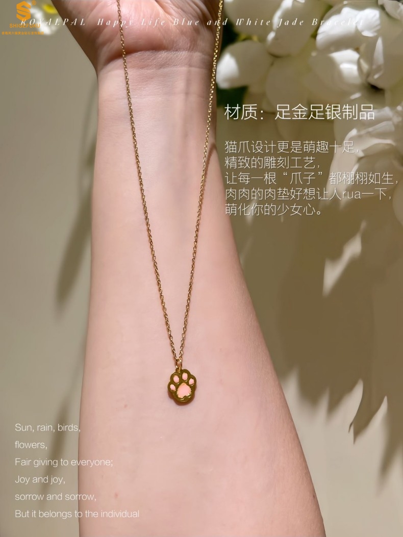 【品名】珐琅浪漫粉招财猫爪足金内嵌足银吊坠(附赠K金项链)