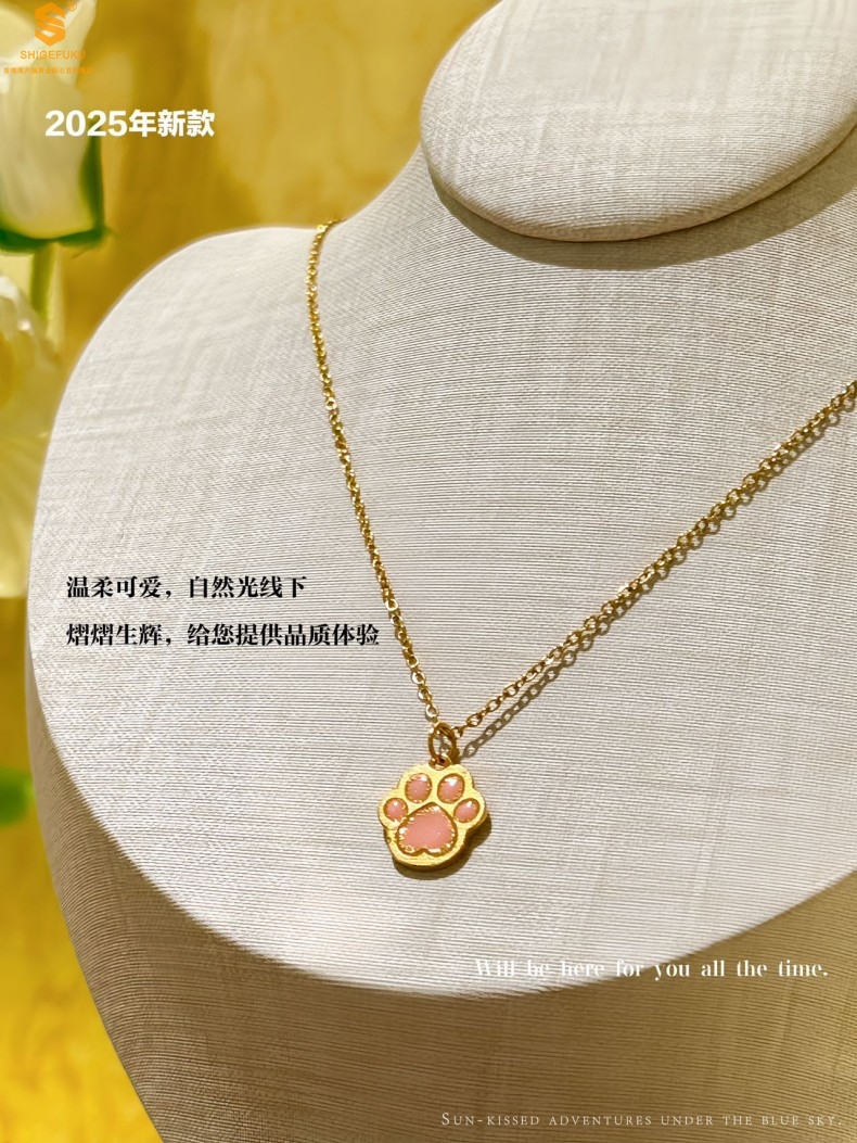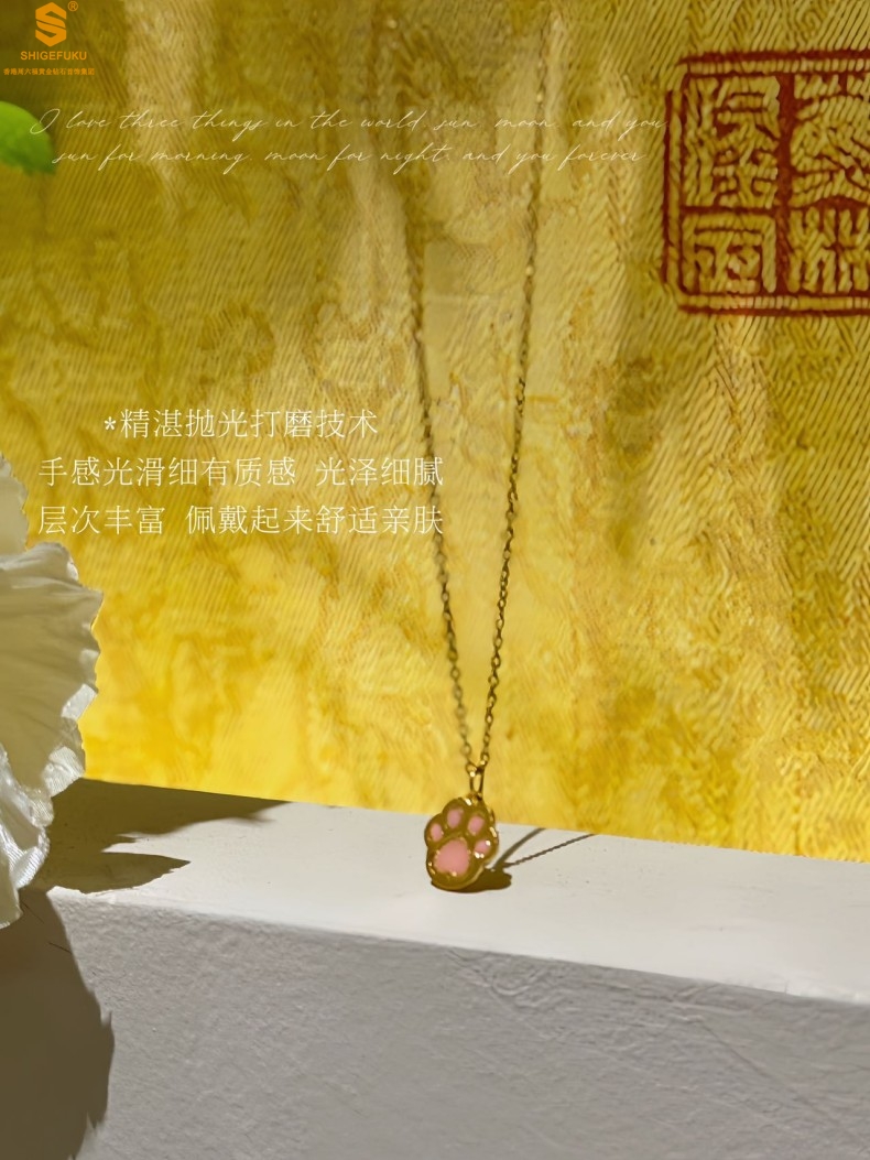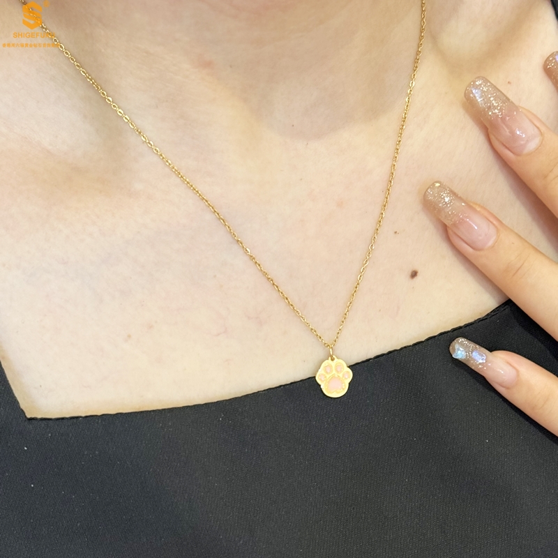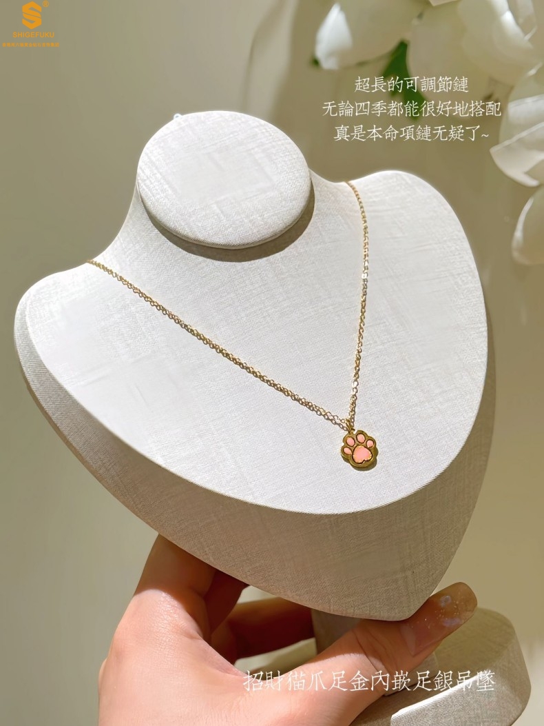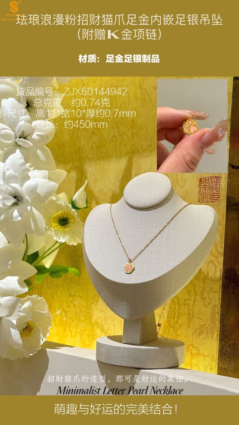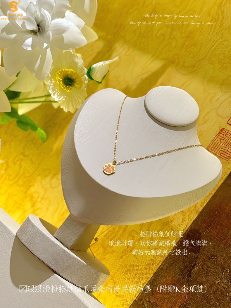 【品名】珐琅浪漫粉招财猫爪足金内嵌足银吊坠(附赠K金项链)