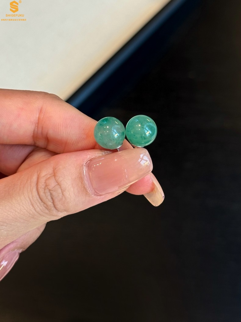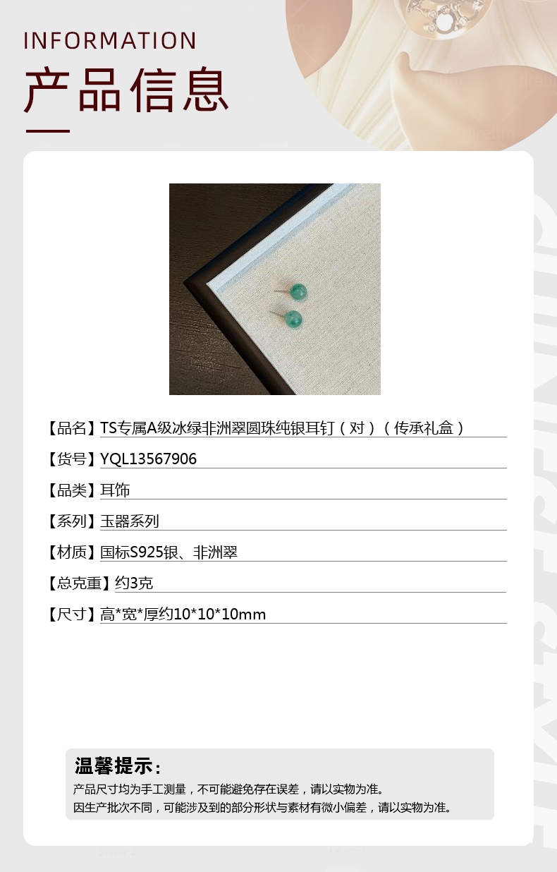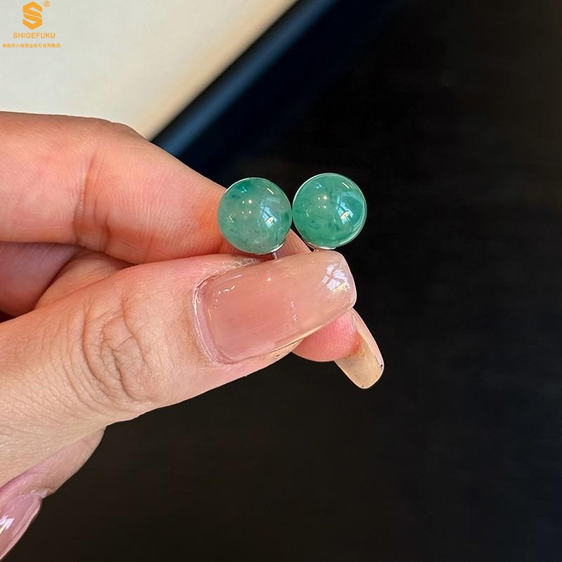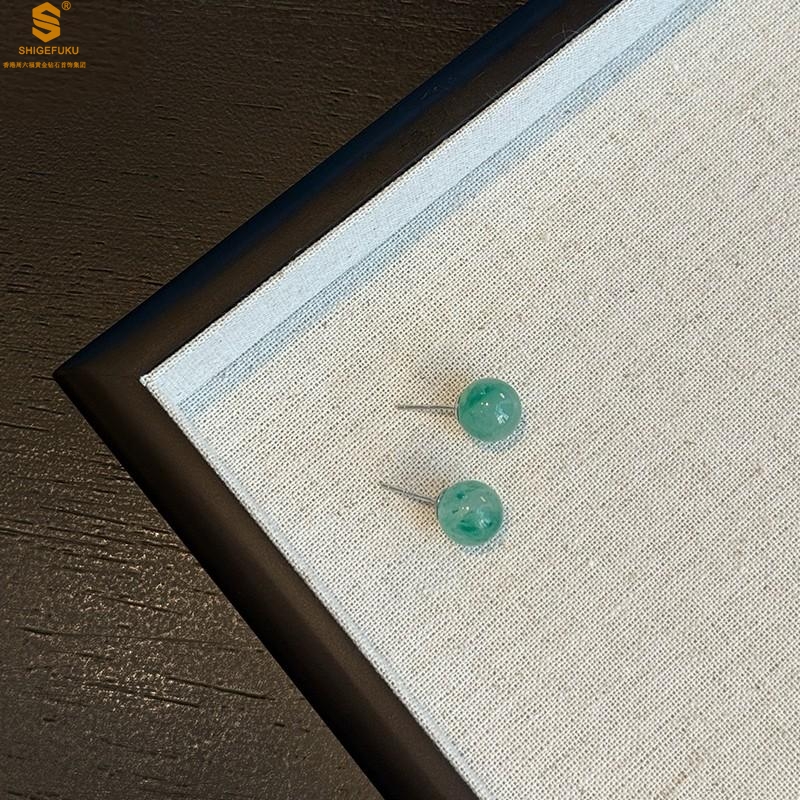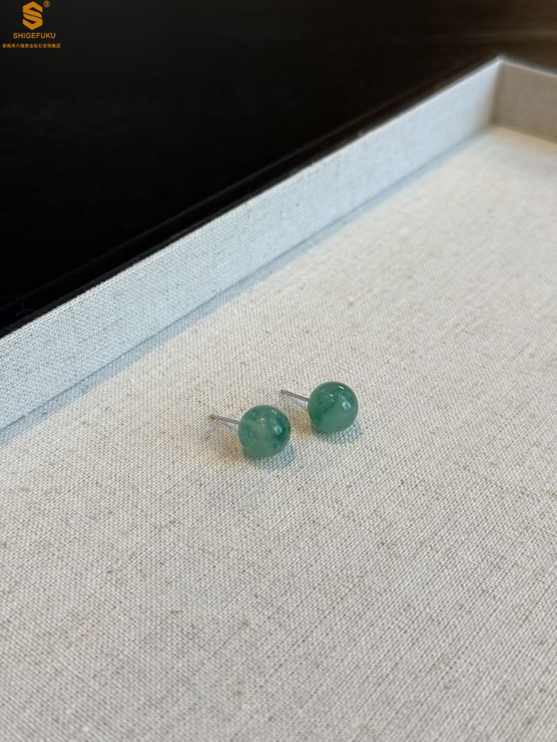 【品名】TS专属A级冰绿非洲翠圆珠纯银耳钉(对)(传承礼盒)