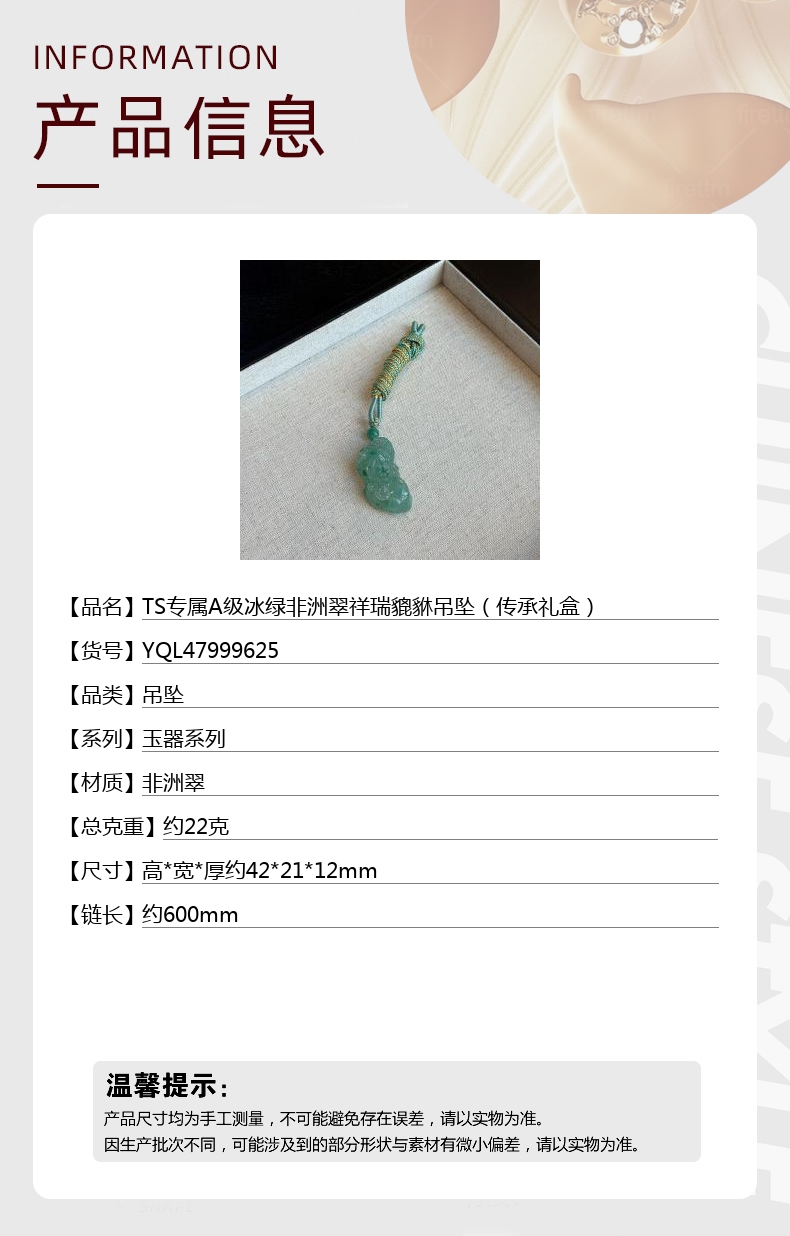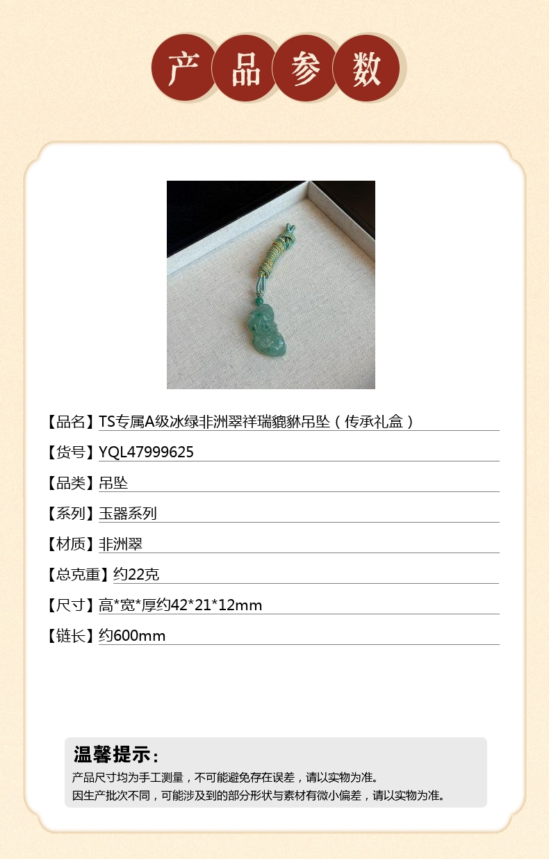 【品名】TS专属A级冰绿非洲翠祥瑞貔貅吊坠(传承礼盒)