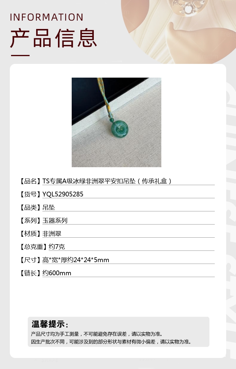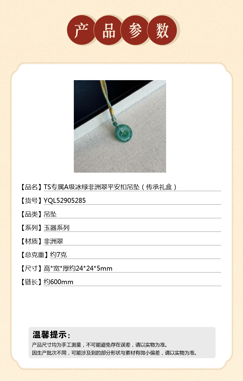 【品名】TS专属A级冰绿非洲翠平安扣吊坠(传承礼盒)