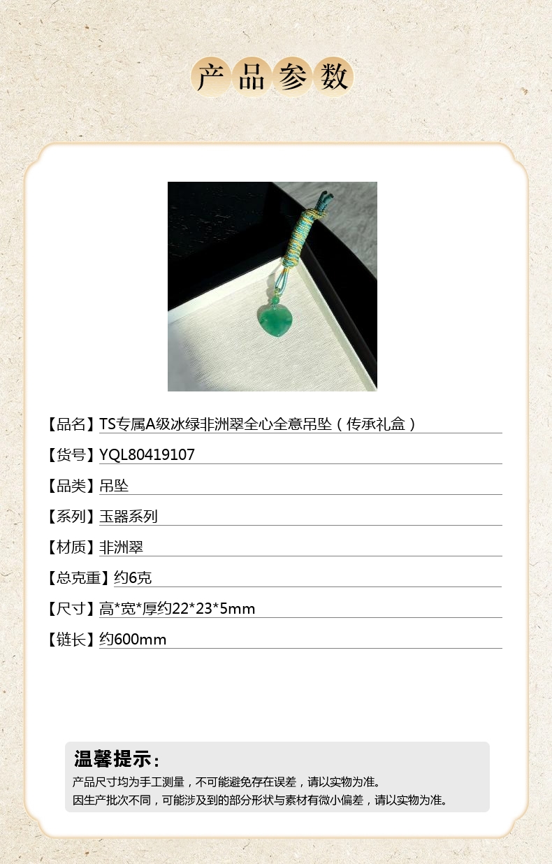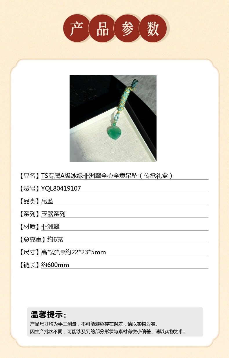 【品名】TS专属A级冰绿非洲翠全心全意吊坠(传承礼盒)