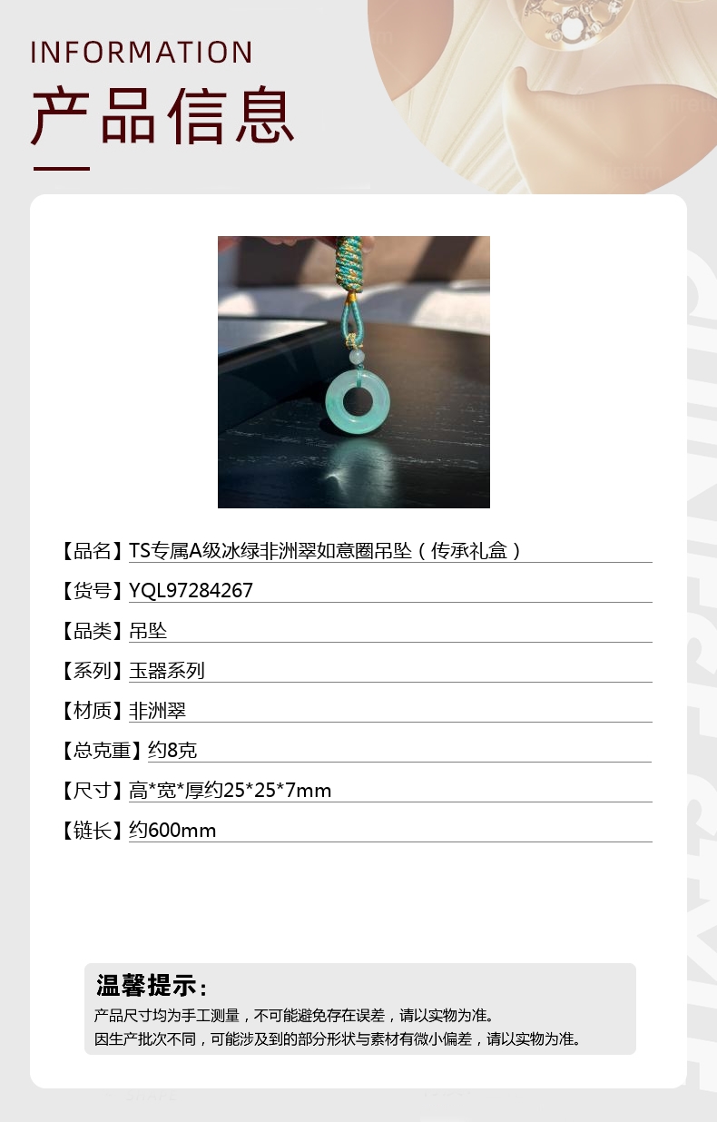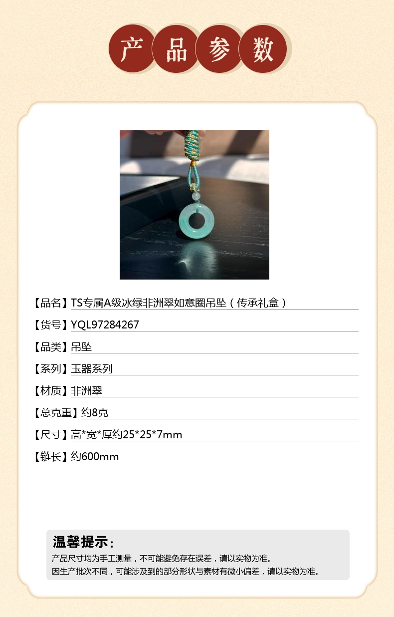 【品名】TS专属A级冰绿非洲翠如意圈吊坠(传承礼盒)