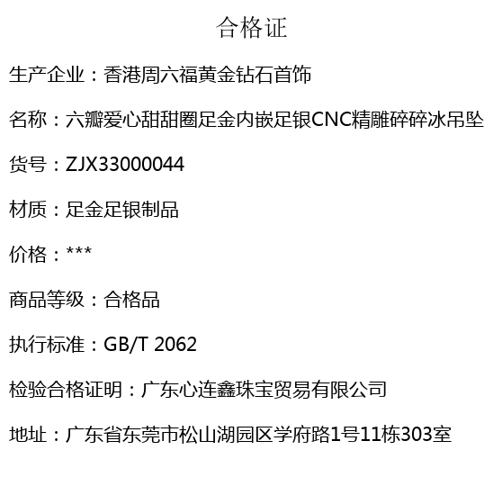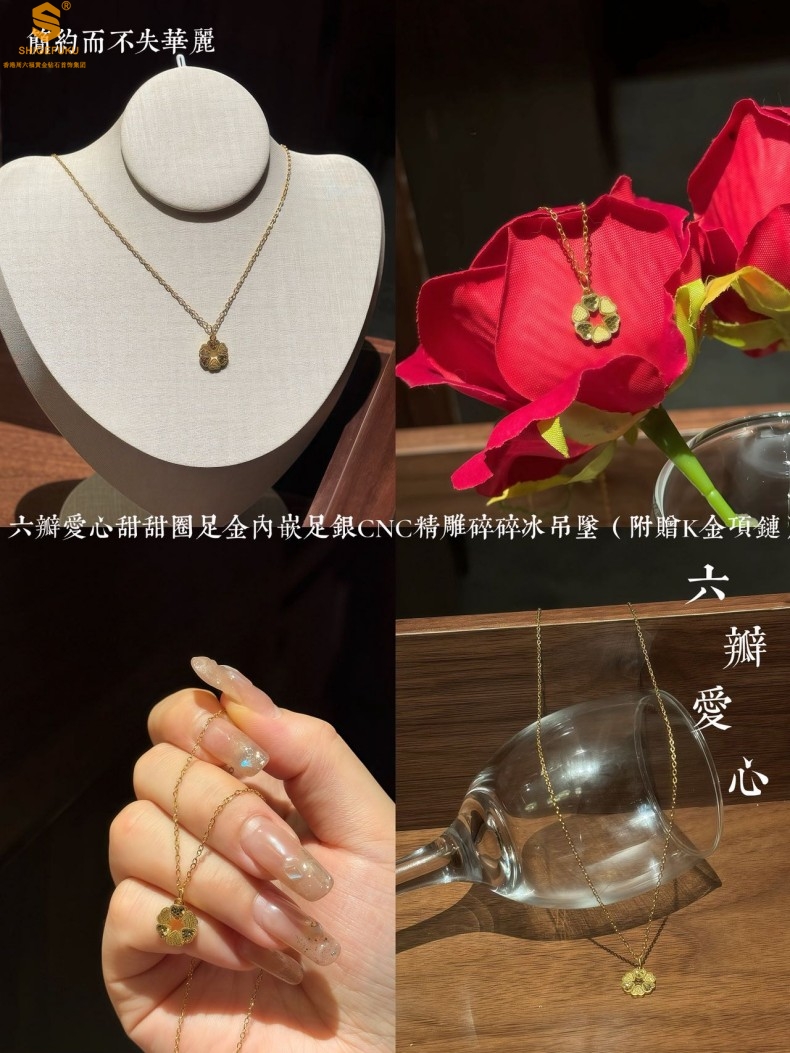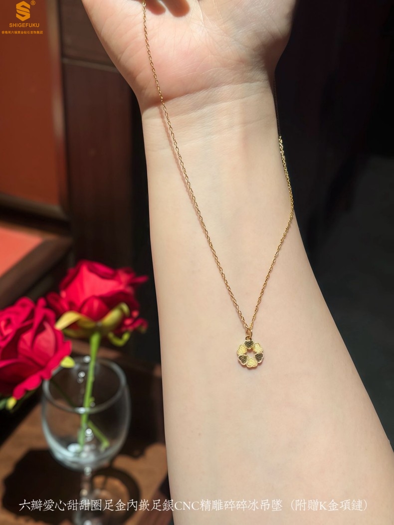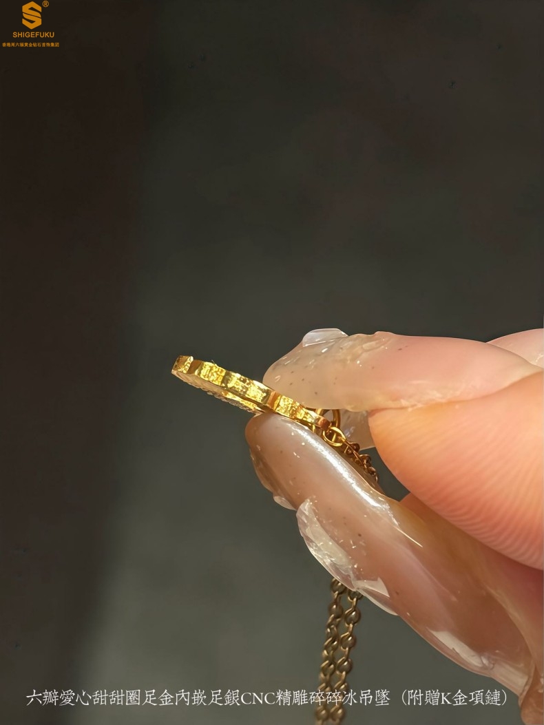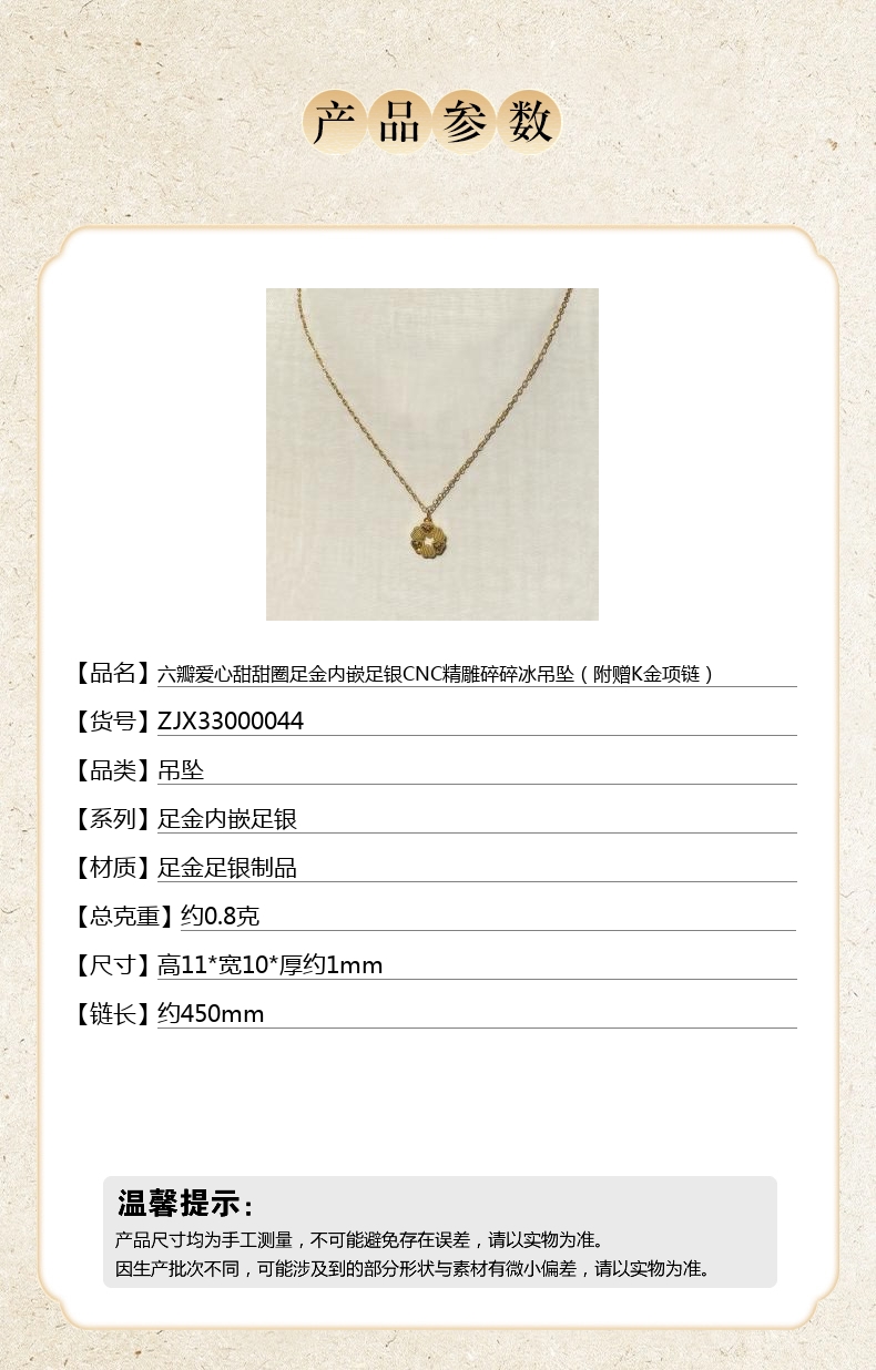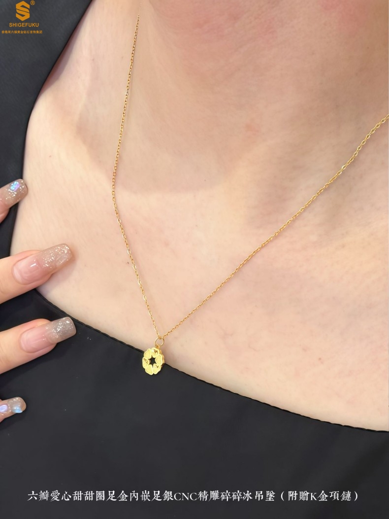 【品名】六瓣爱心甜甜圈足金内嵌足银CNC精雕碎碎冰吊坠(附赠K金项链)