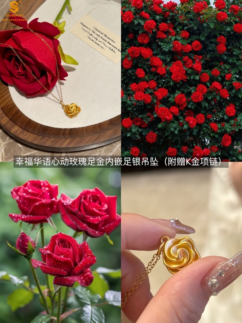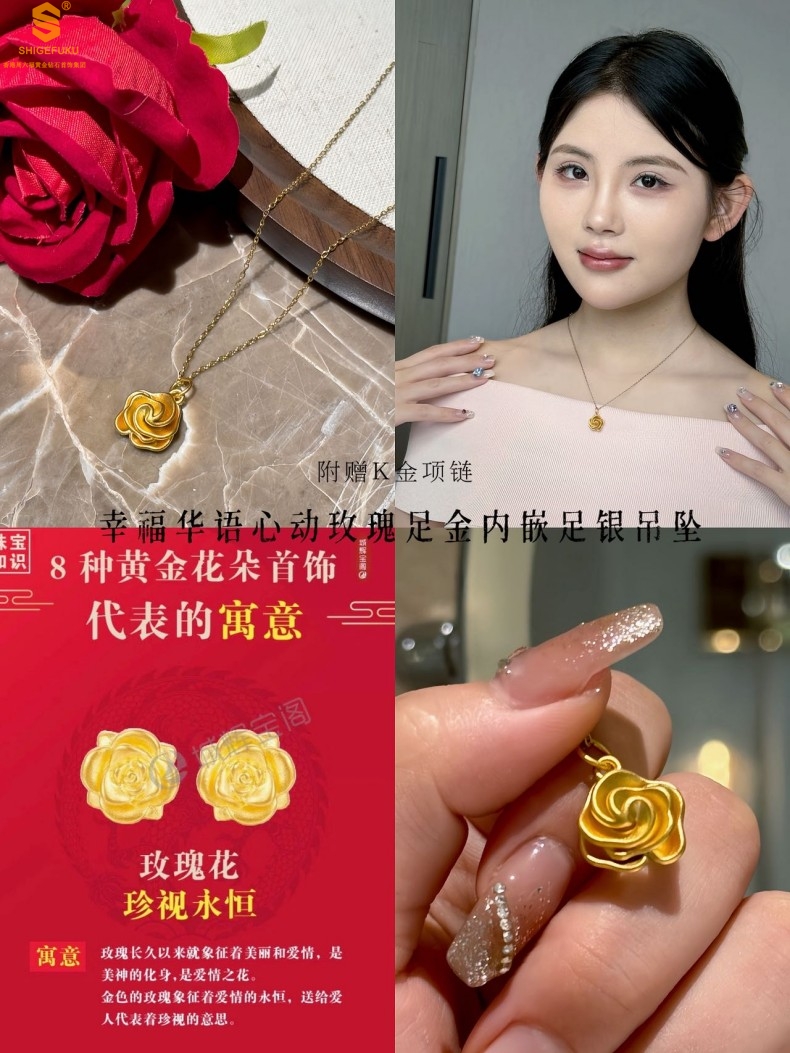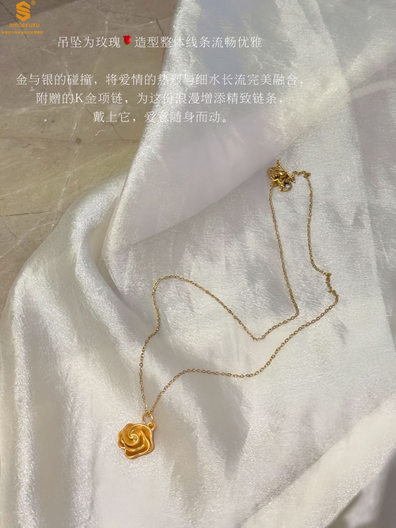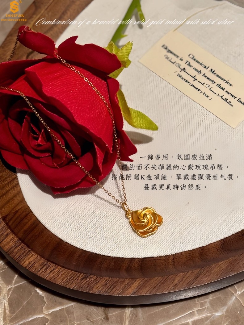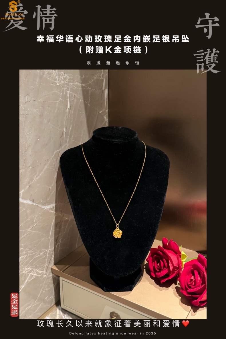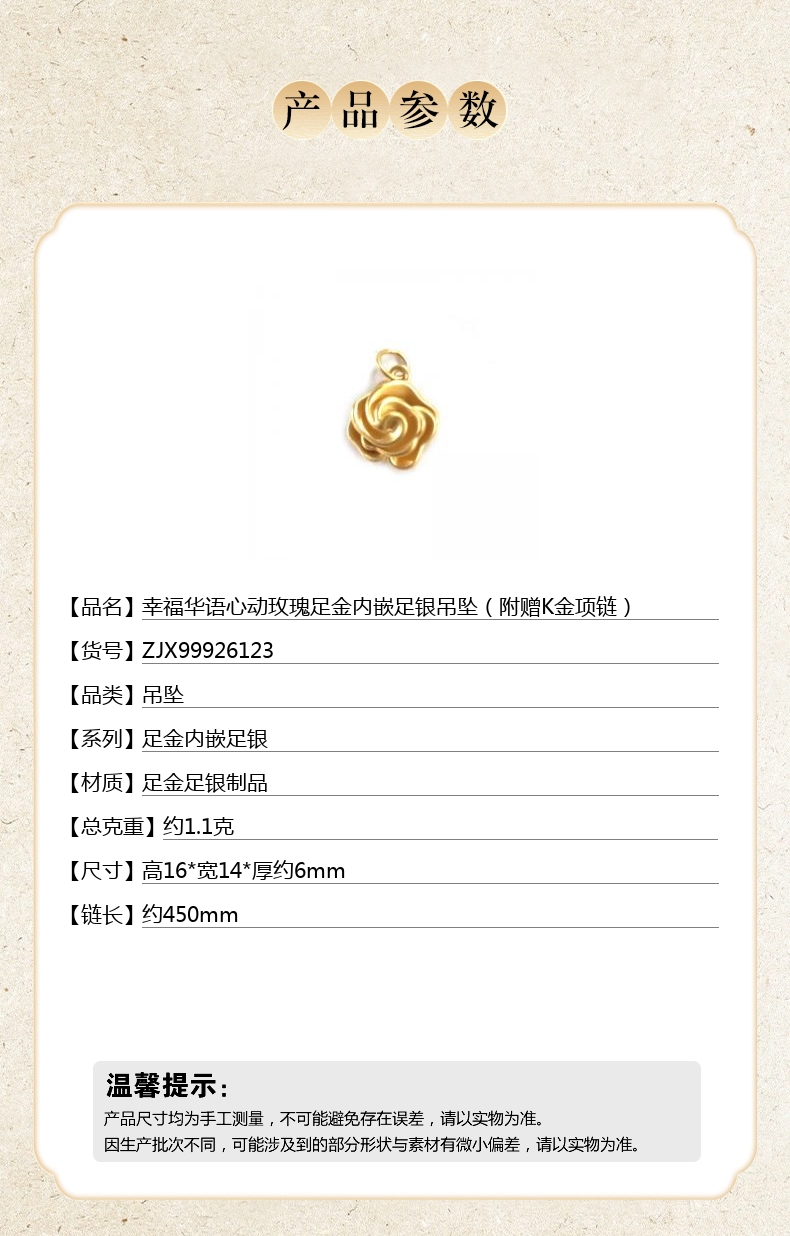 【品名】幸福华语心动玫瑰足金内嵌足银吊坠(附赠K金项链)