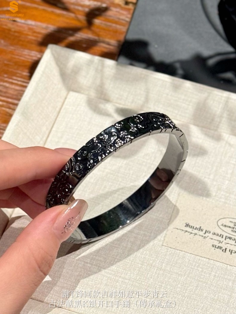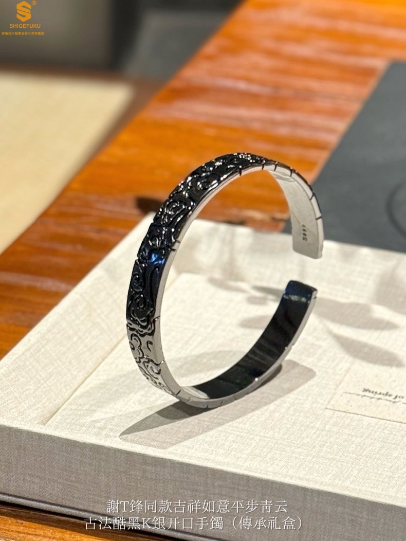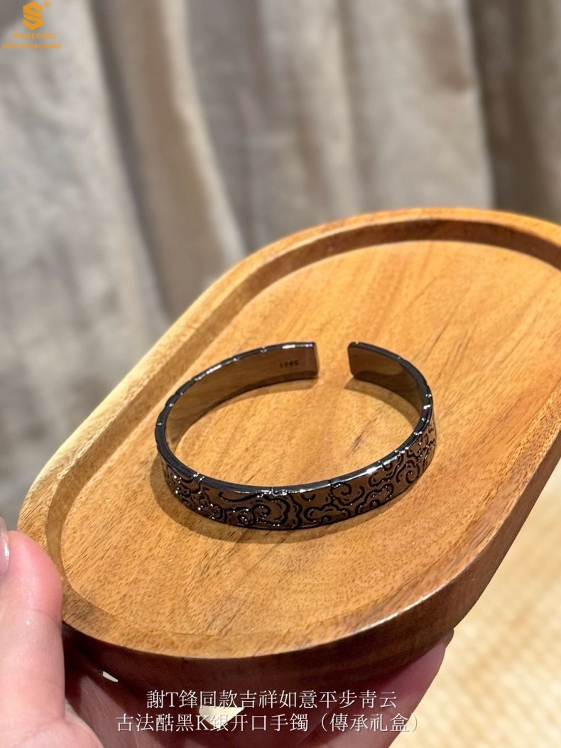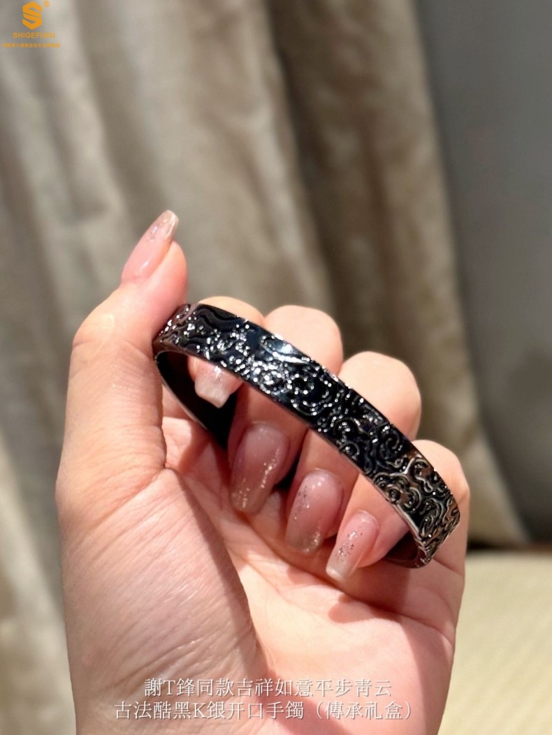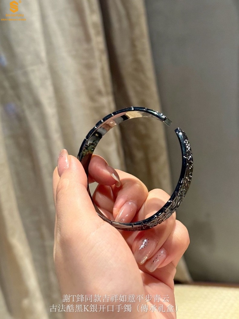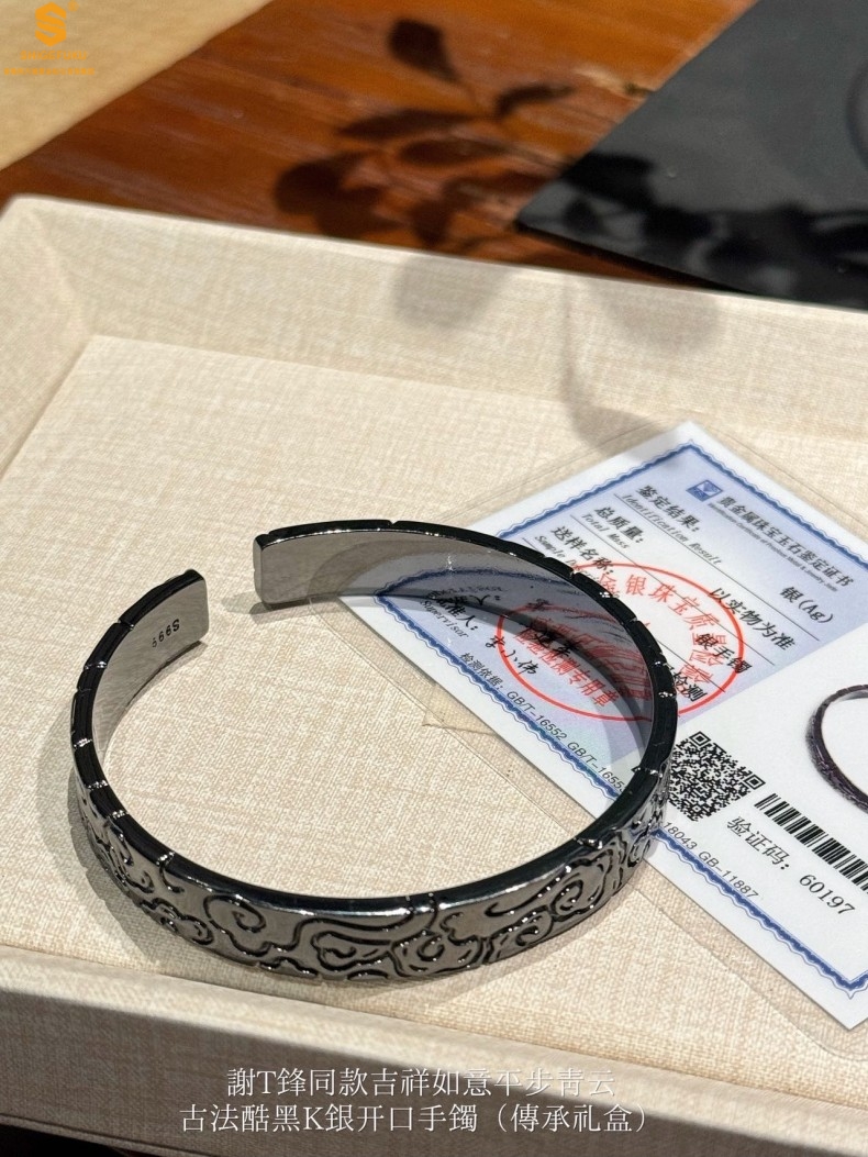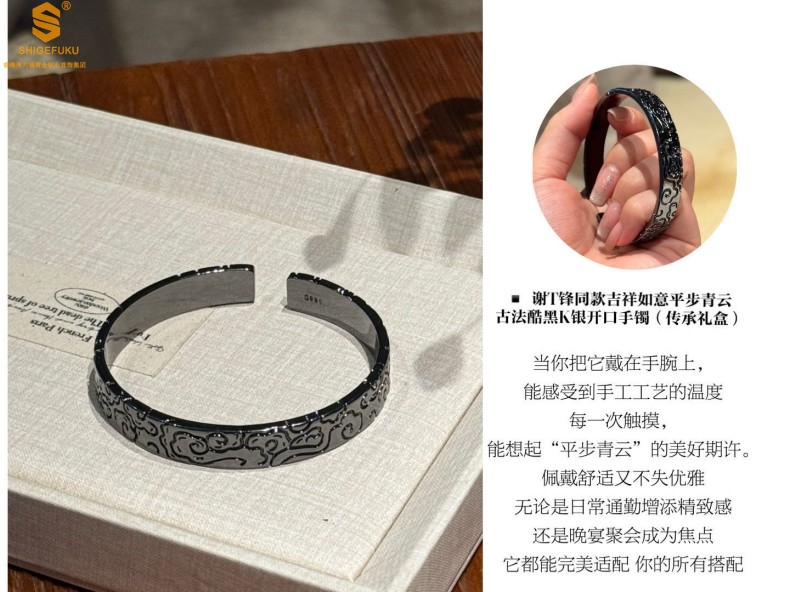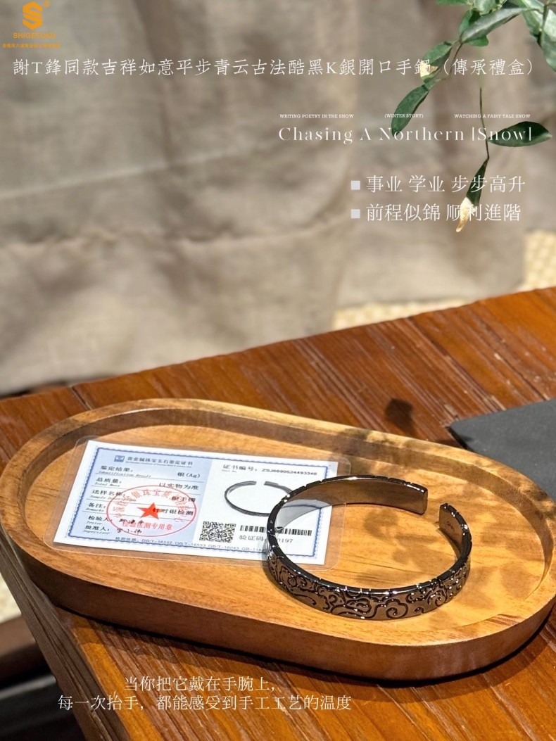 【品名】谢T锋同款吉祥如意平步青云古法酷黑K银开口手镯(传承礼盒)