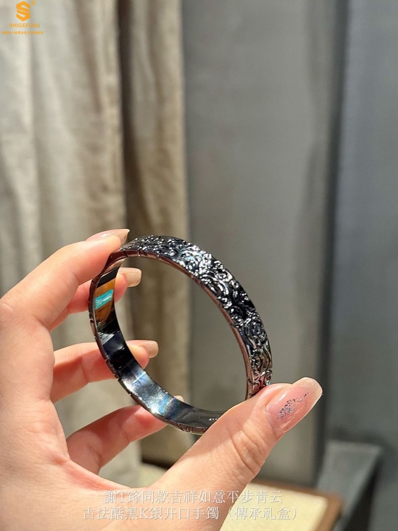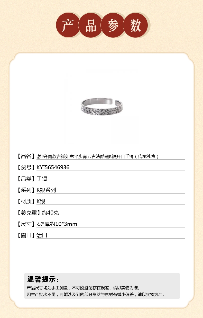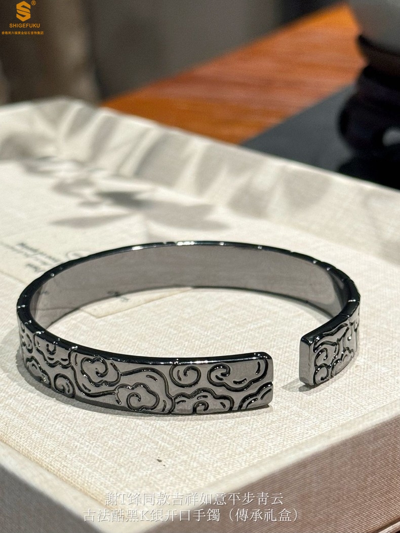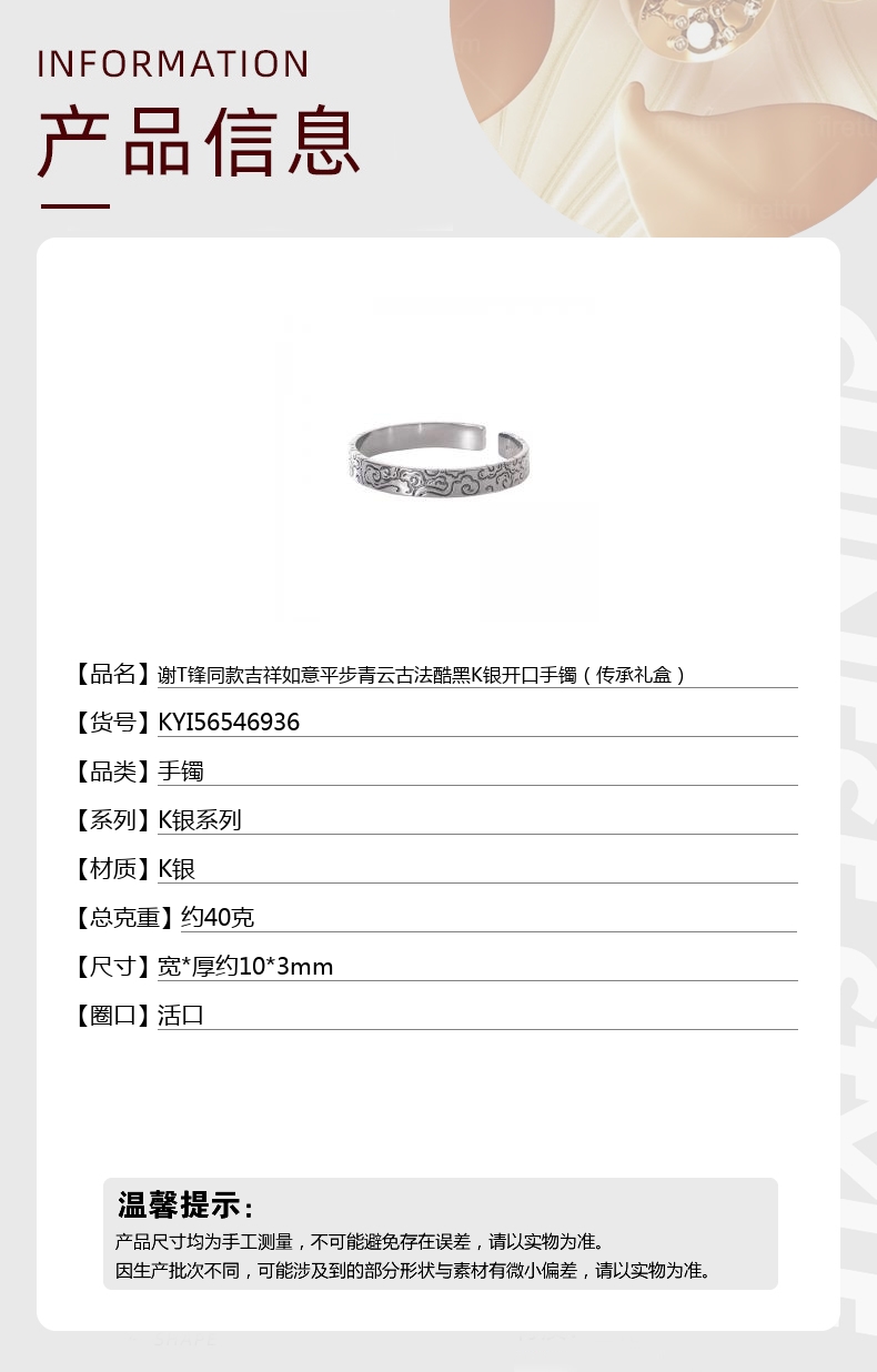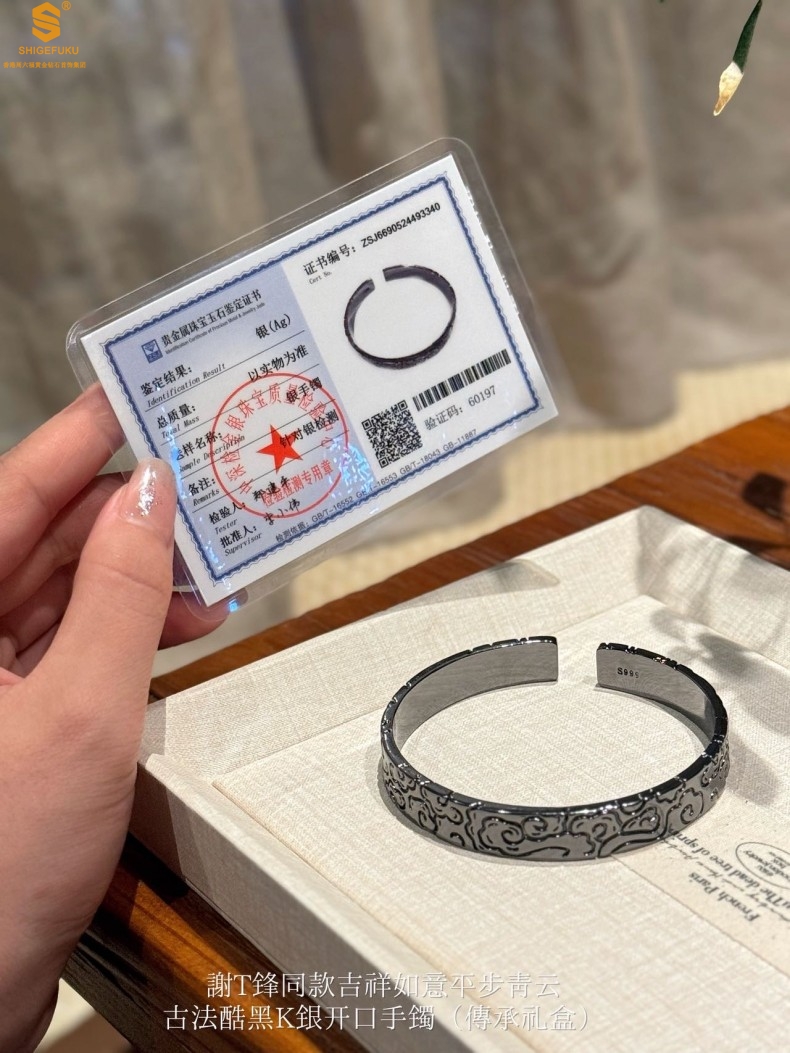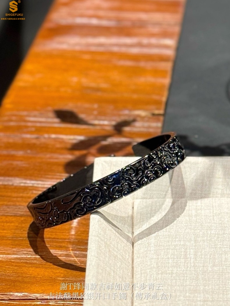 【品名】谢T锋同款吉祥如意平步青云古法酷黑K银开口手镯(传承礼盒)