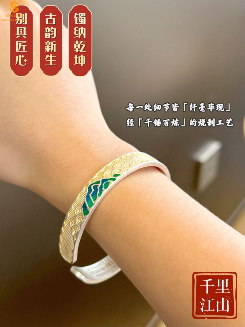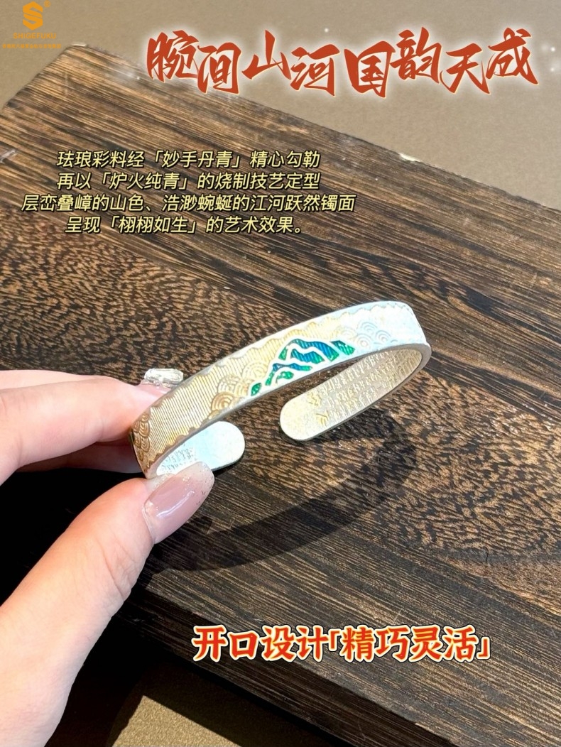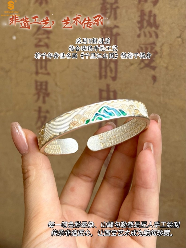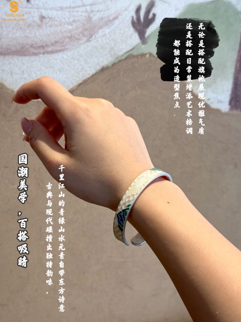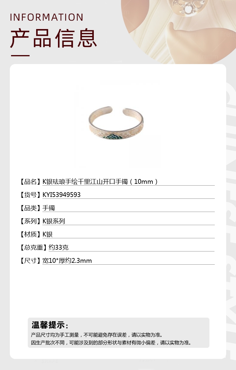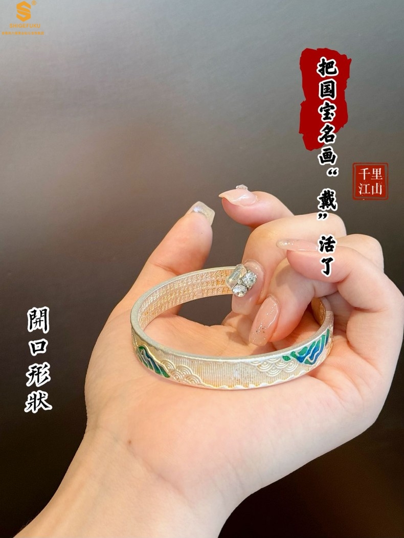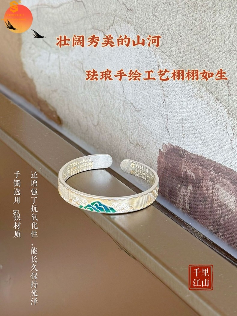 【品名】K银珐琅手绘千里江山开口手镯(10mm)