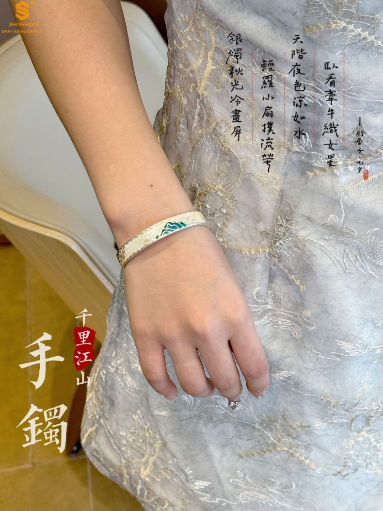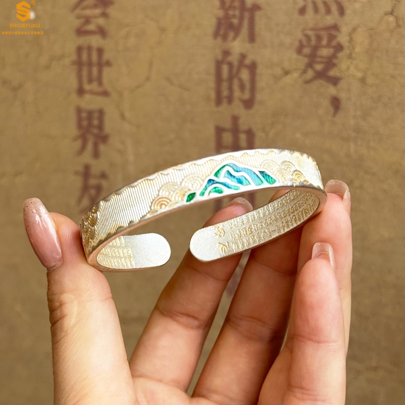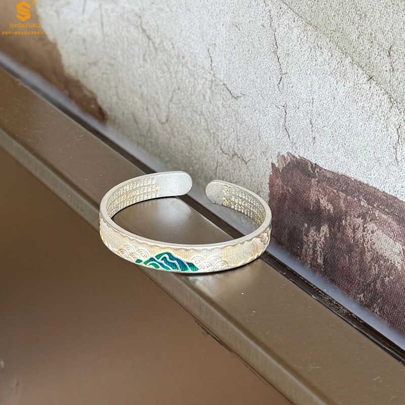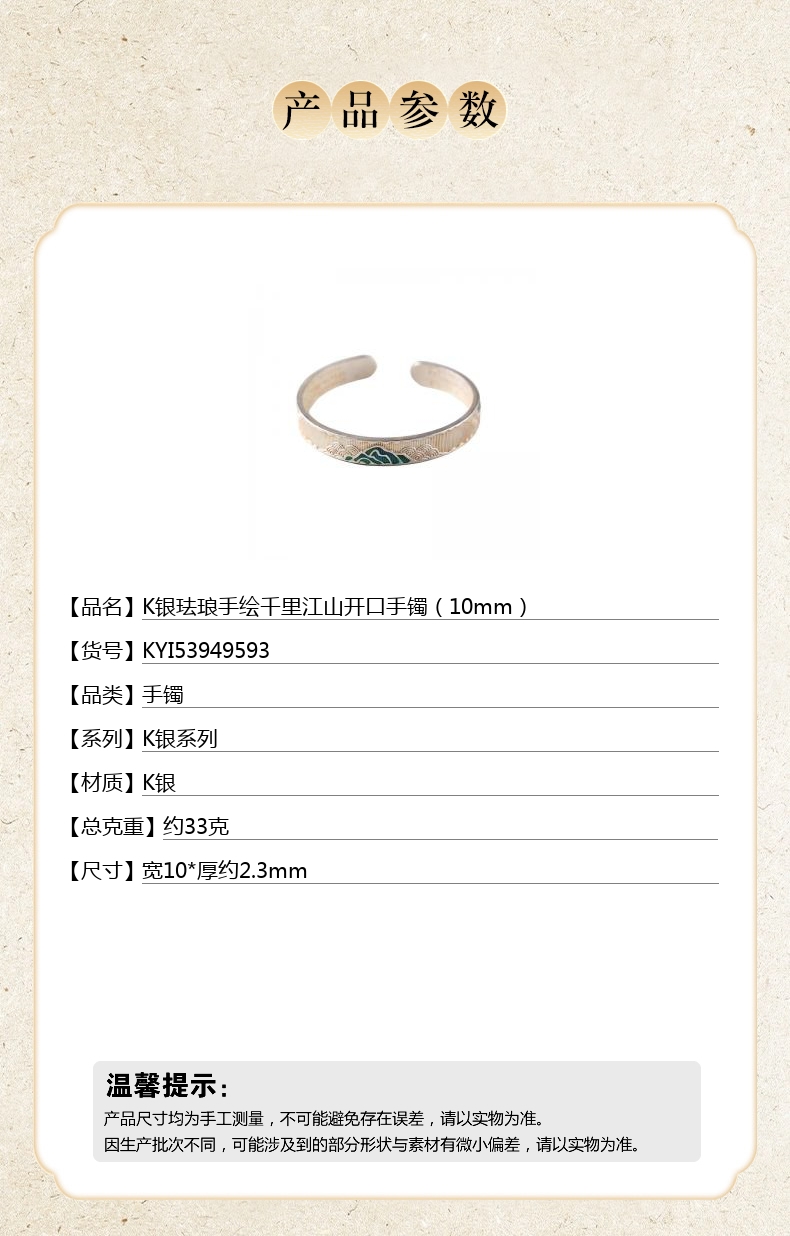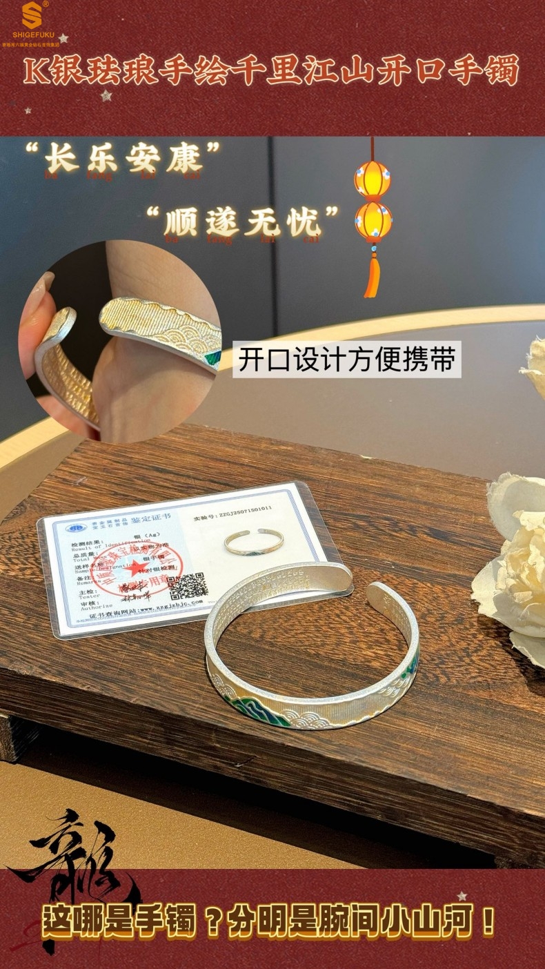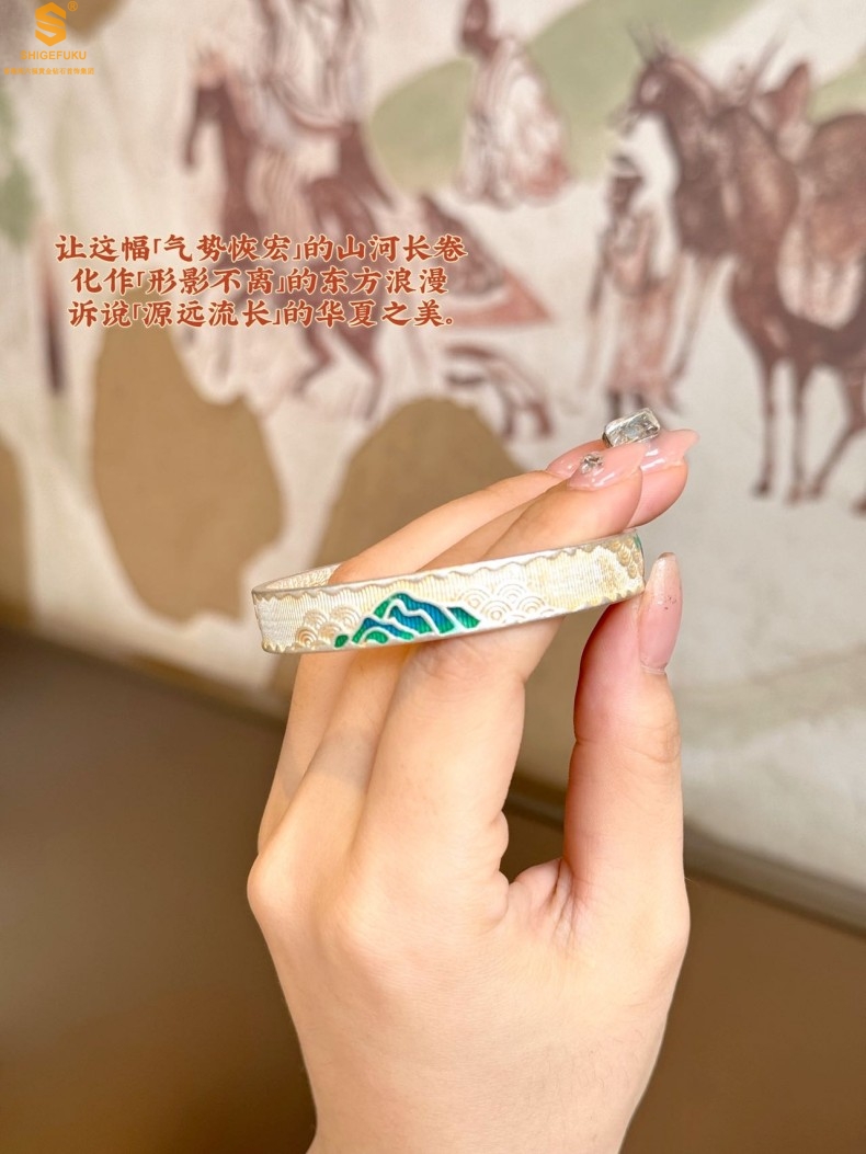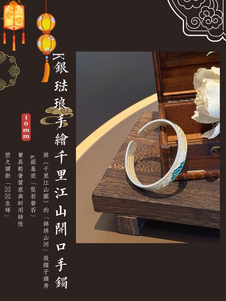 【品名】K银珐琅手绘千里江山开口手镯(10mm)