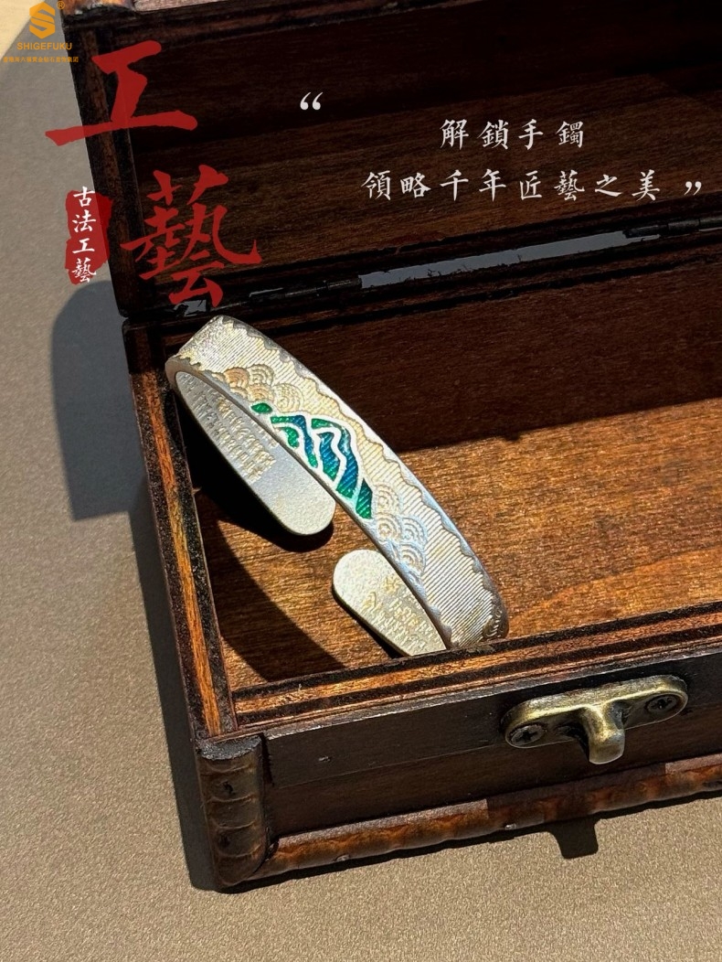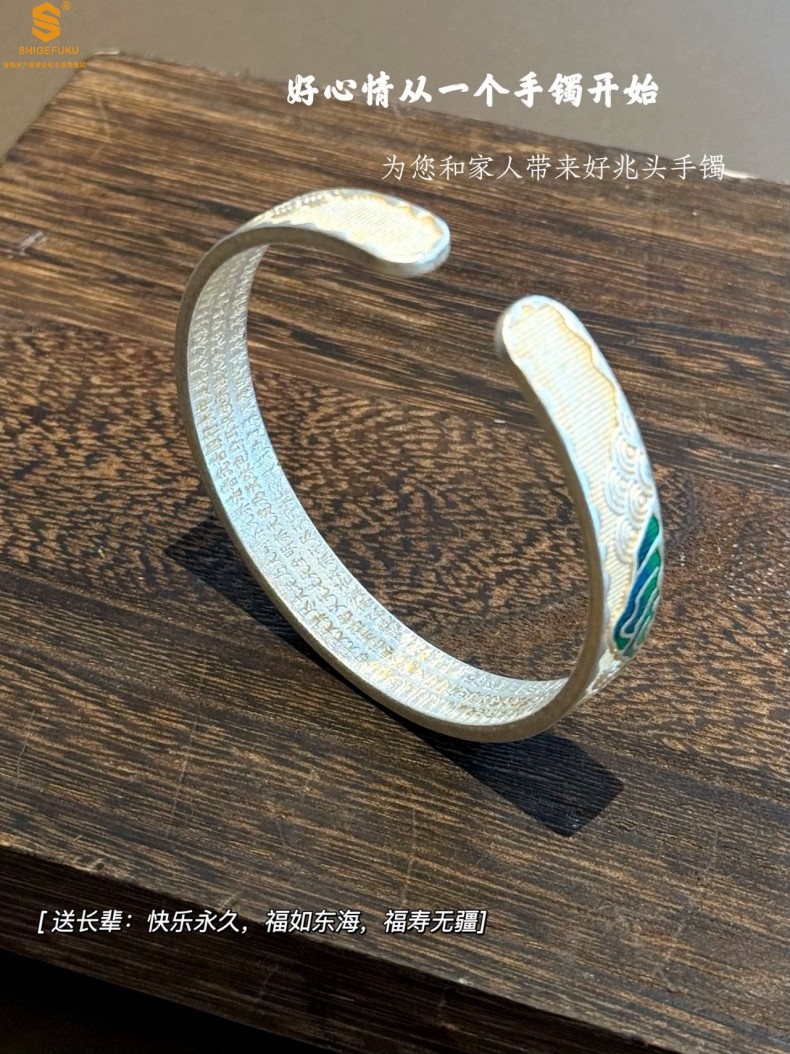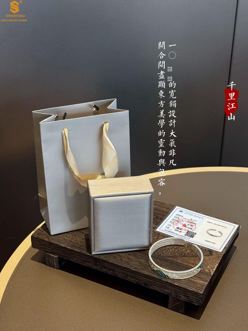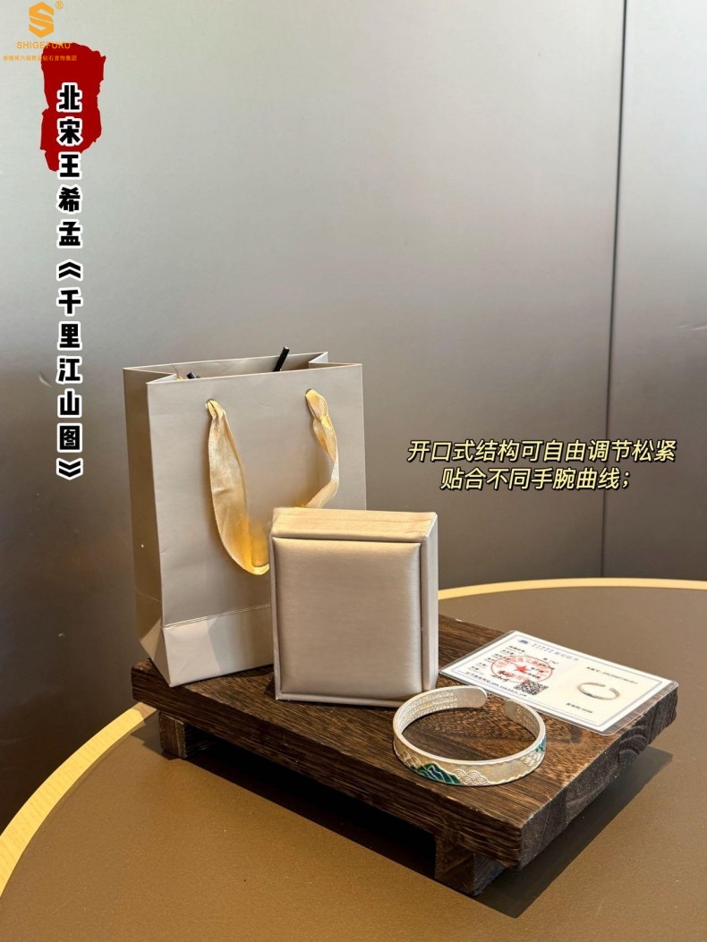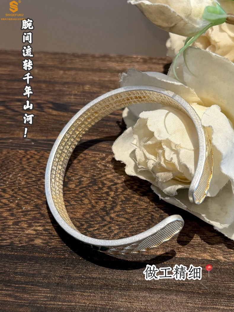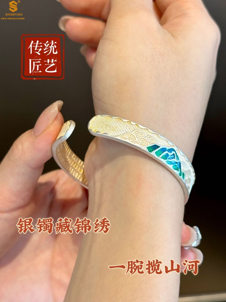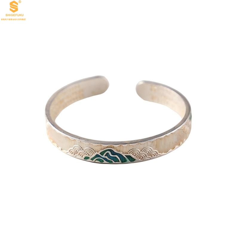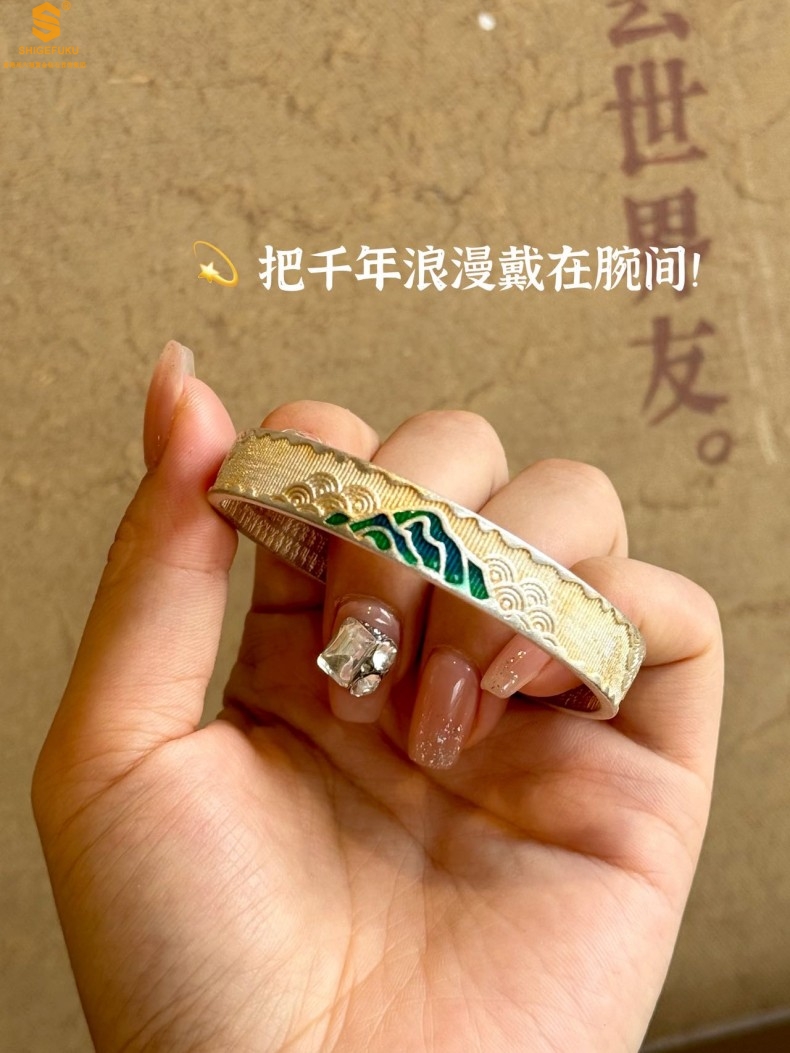 【品名】K银珐琅手绘千里江山开口手镯(10mm)