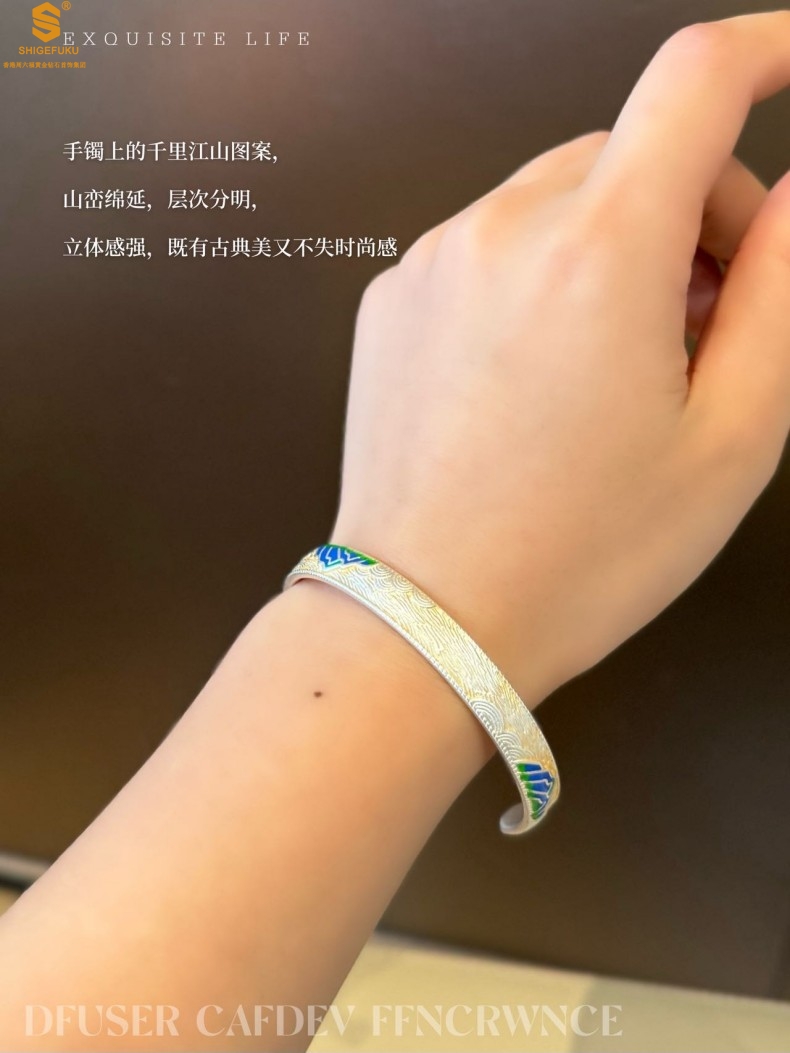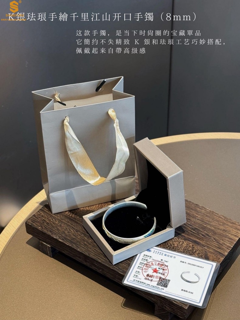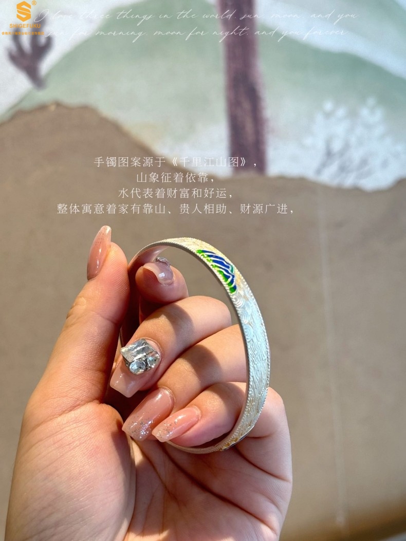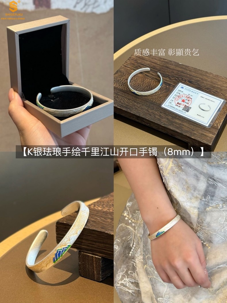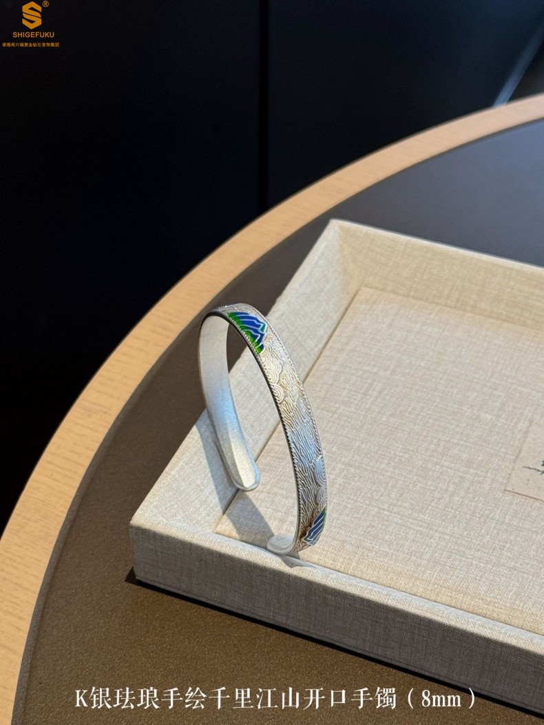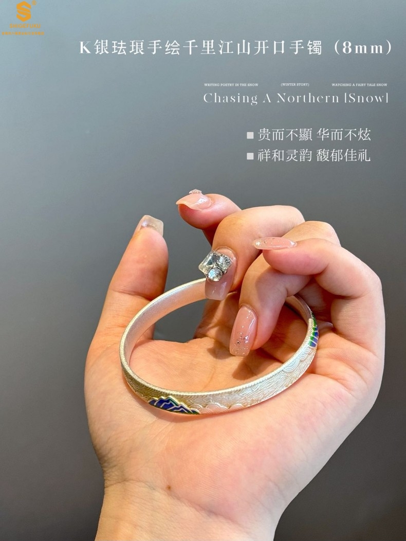 【品名】K银珐琅手绘千里江山开口手镯(8mm)