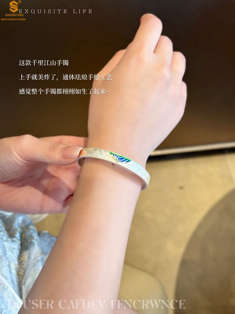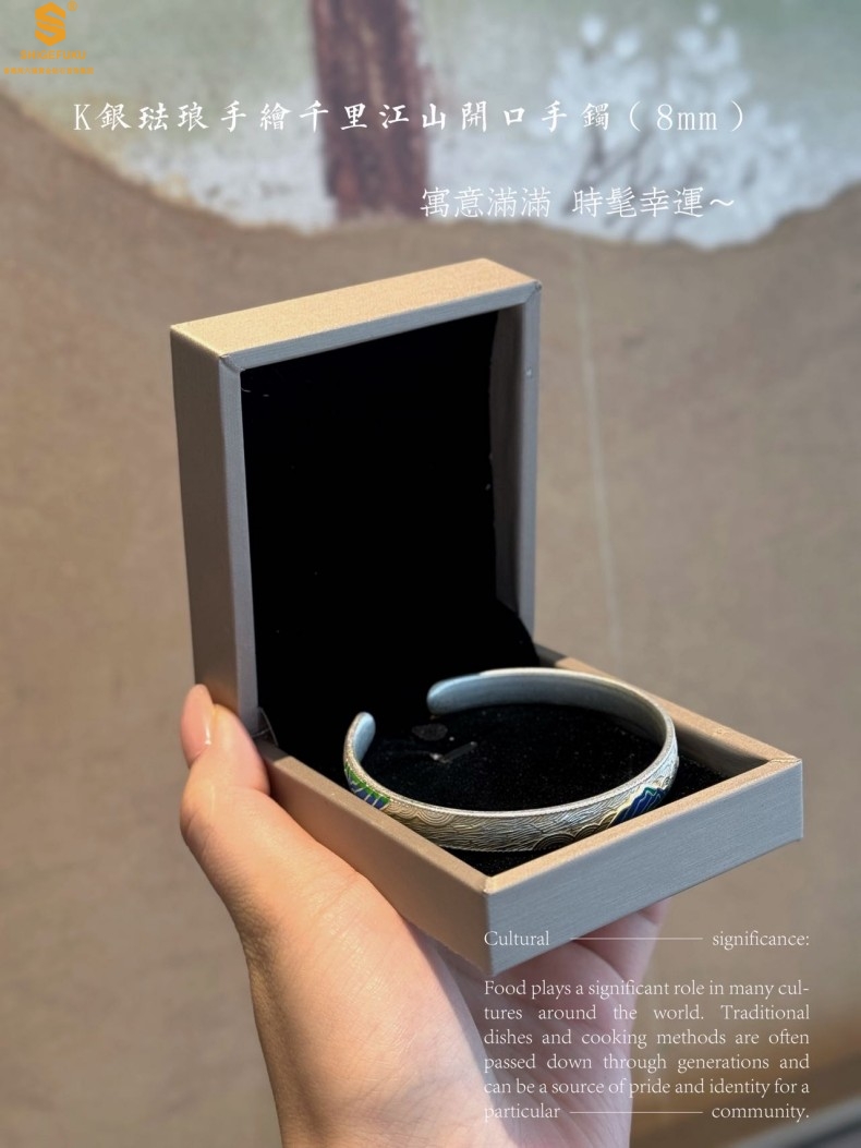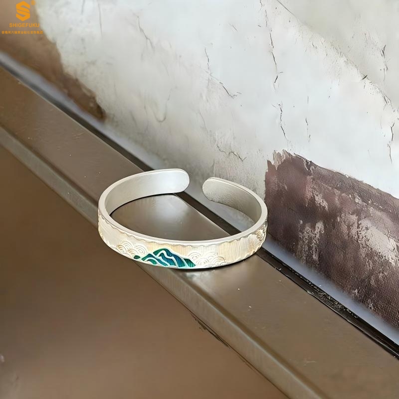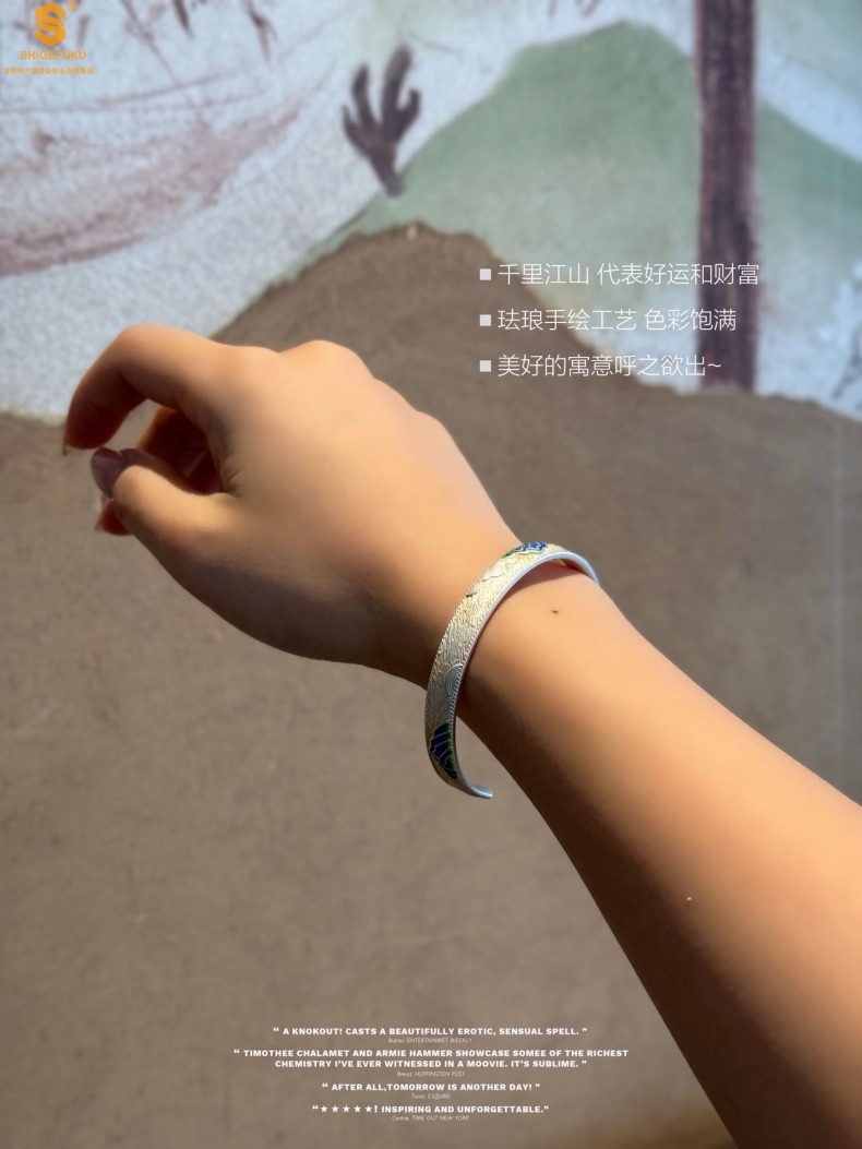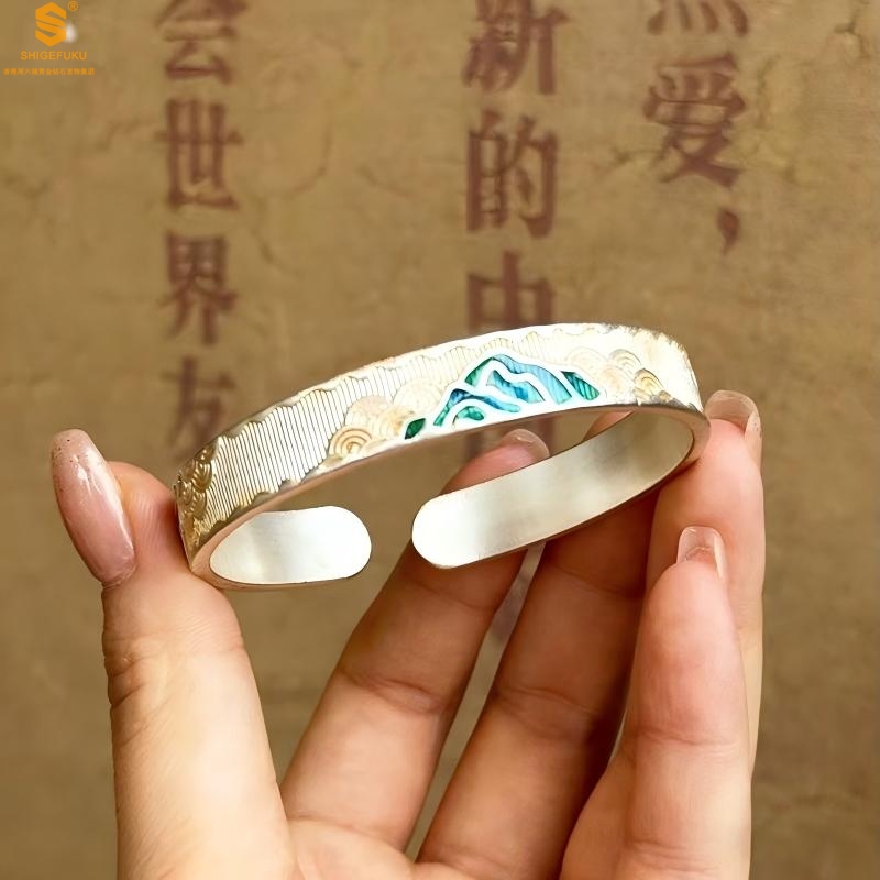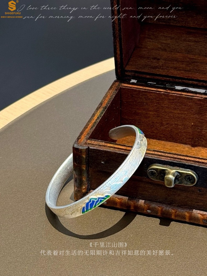 【品名】K银珐琅手绘千里江山开口手镯(8mm)