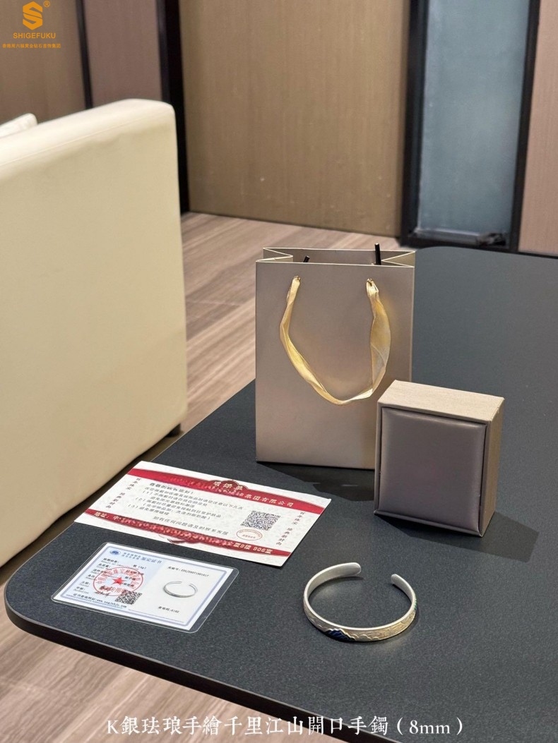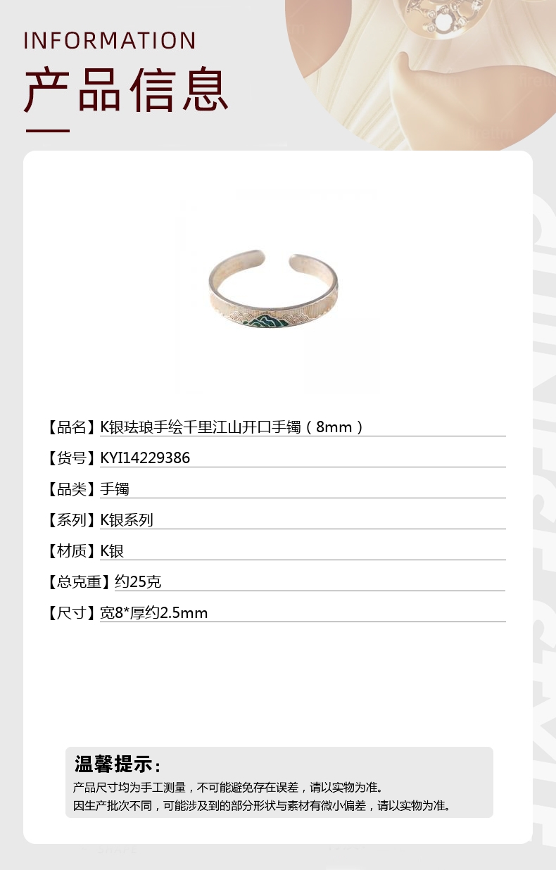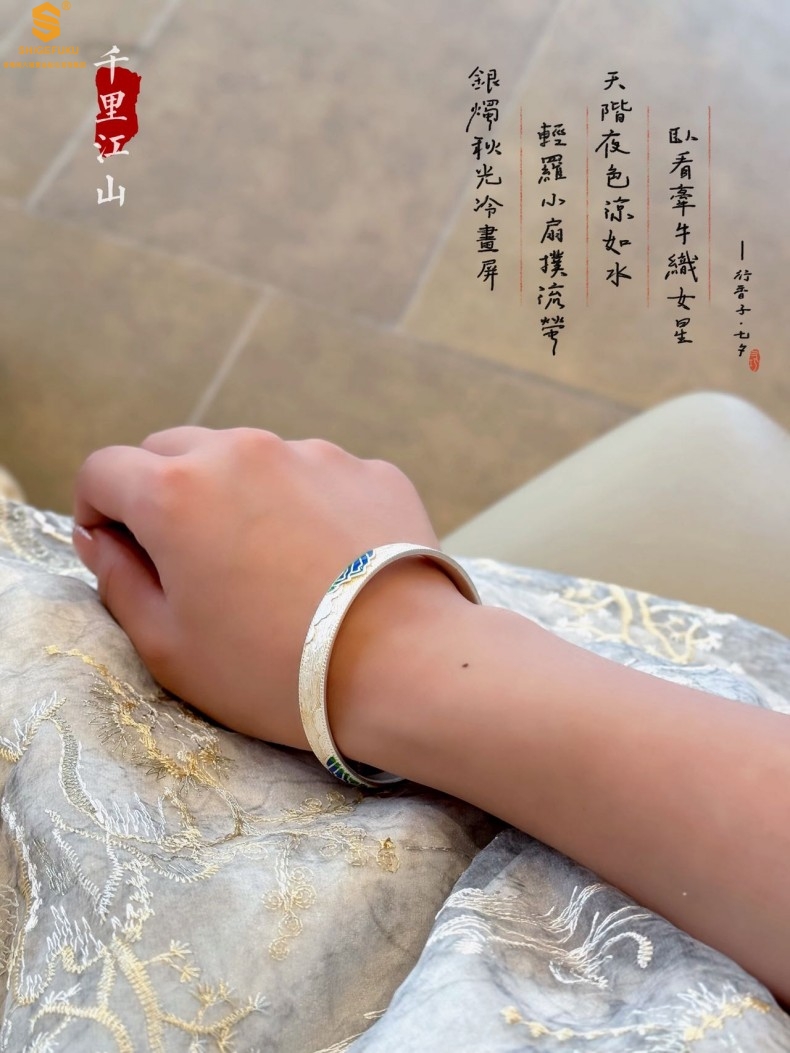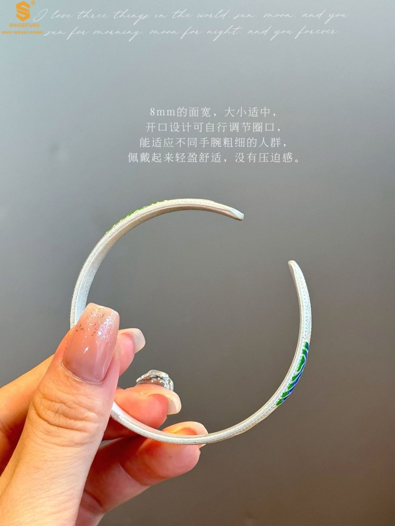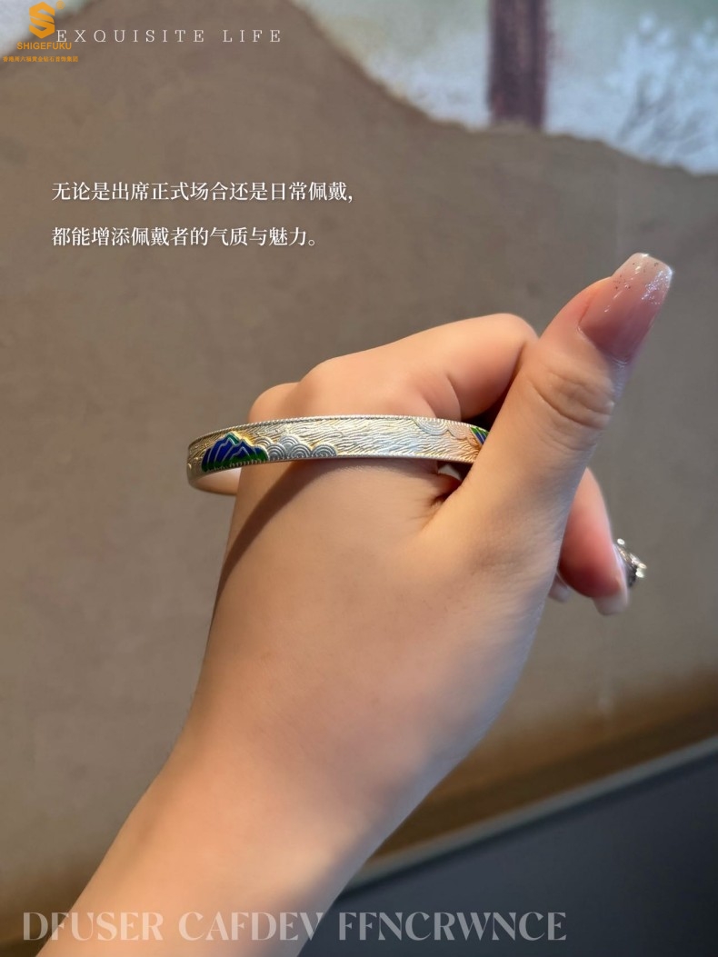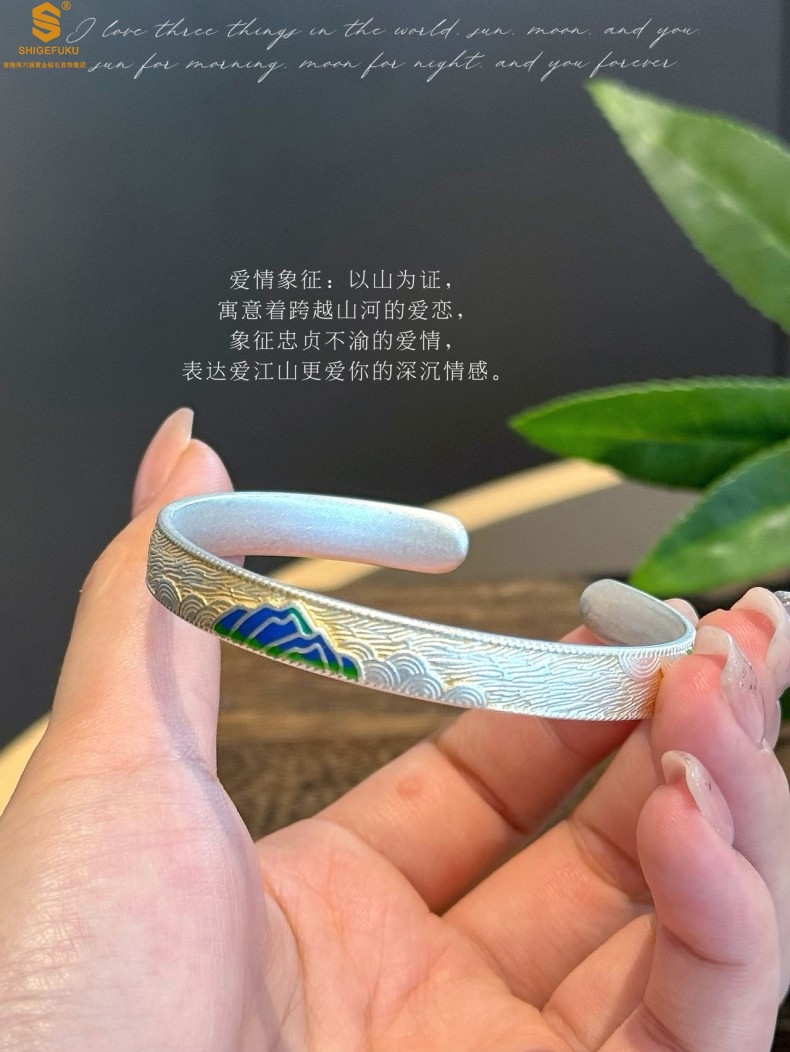 【品名】K银珐琅手绘千里江山开口手镯(8mm)