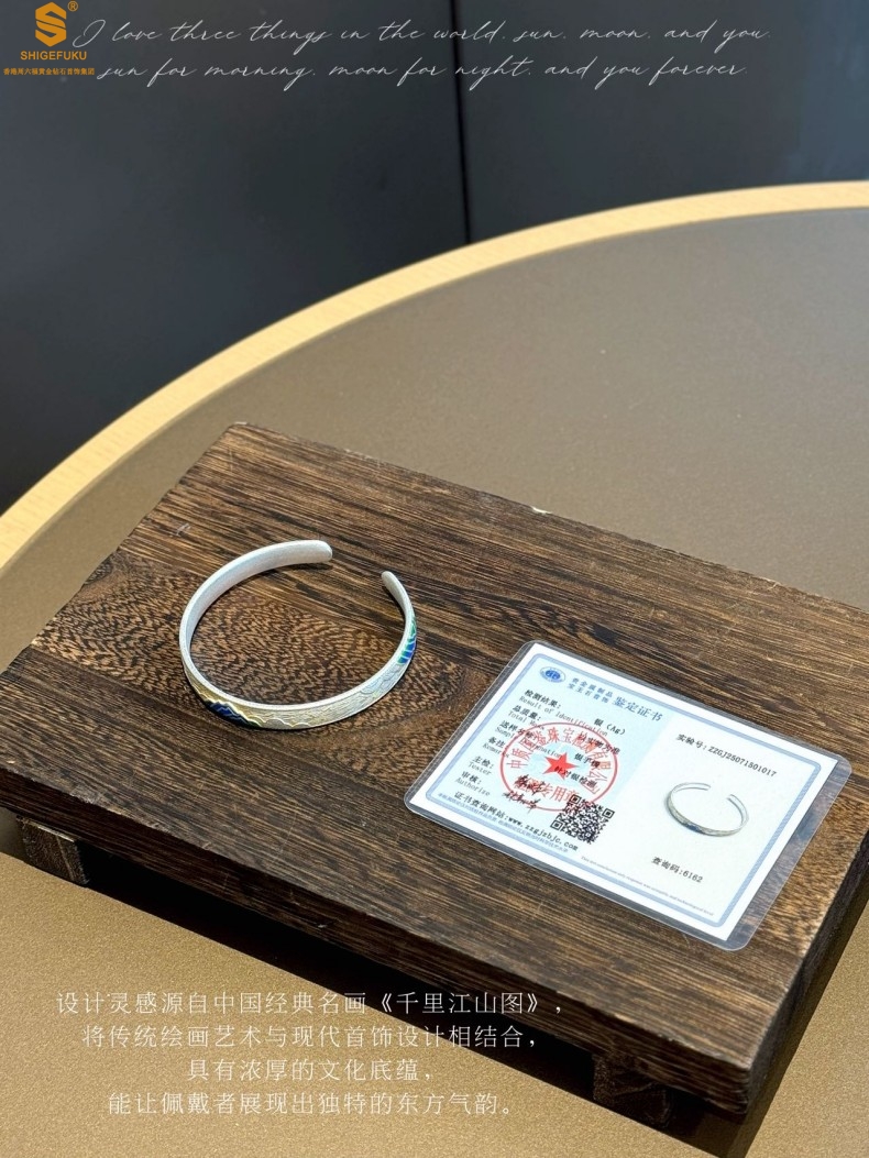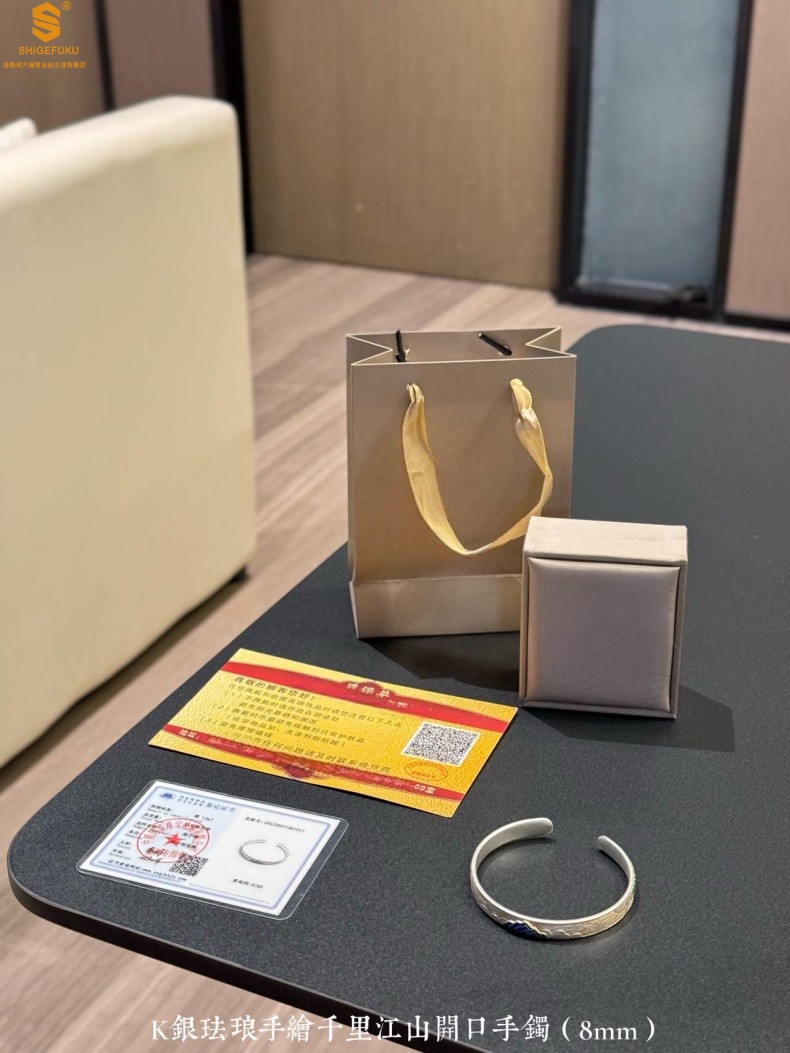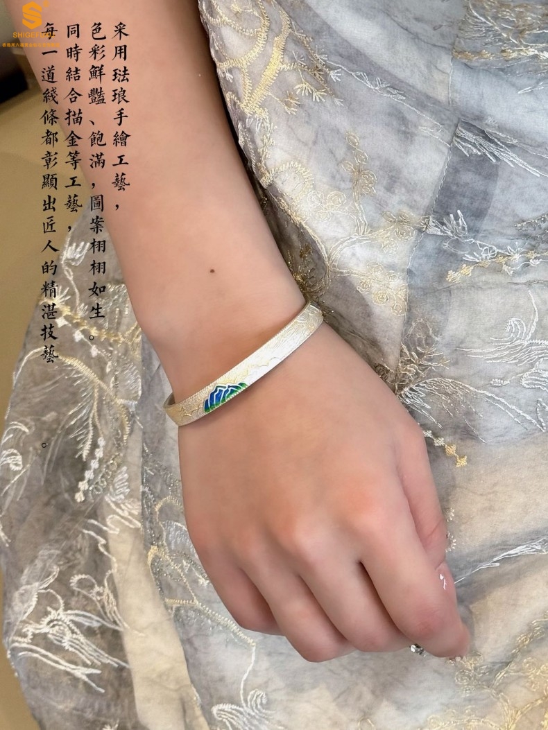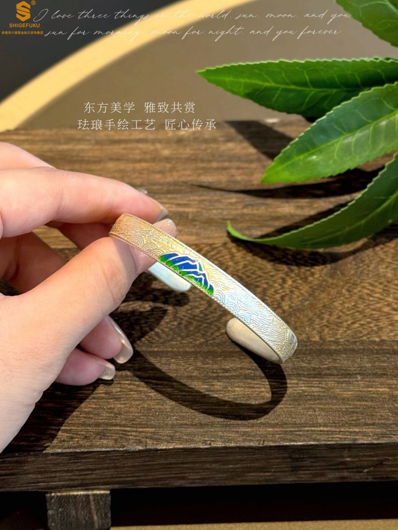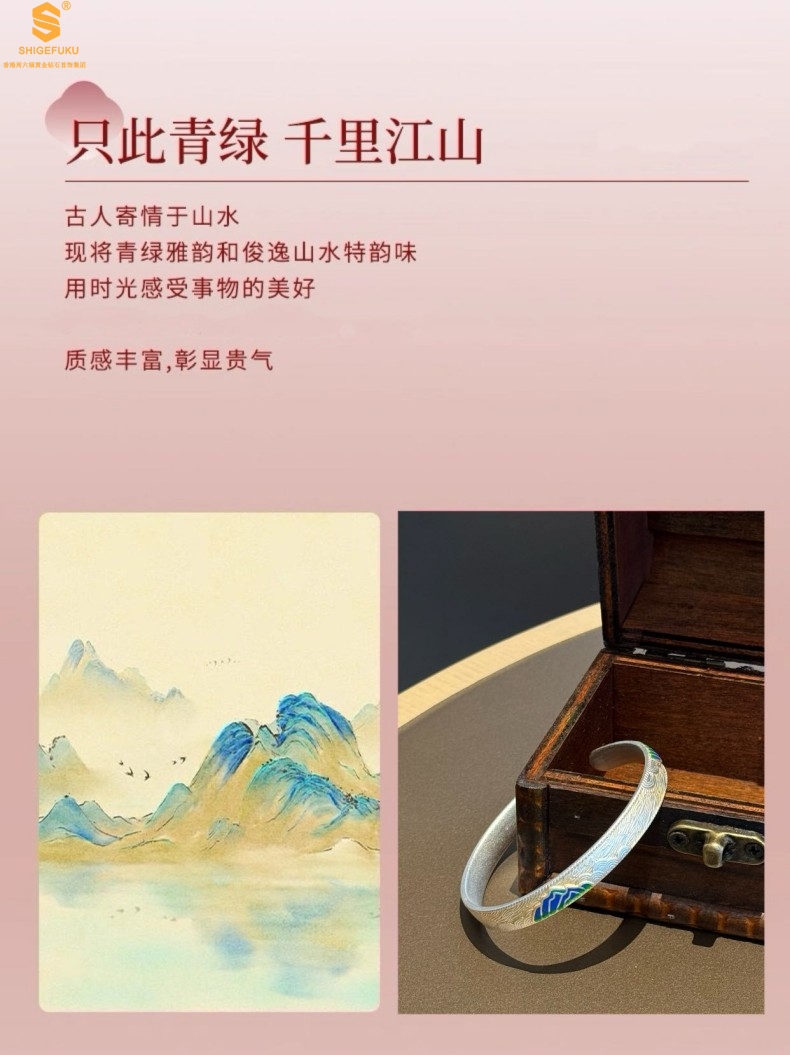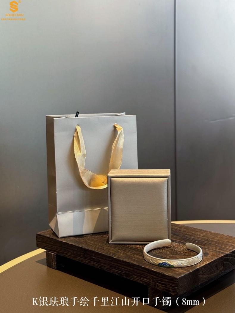 【品名】K银珐琅手绘千里江山开口手镯(8mm)