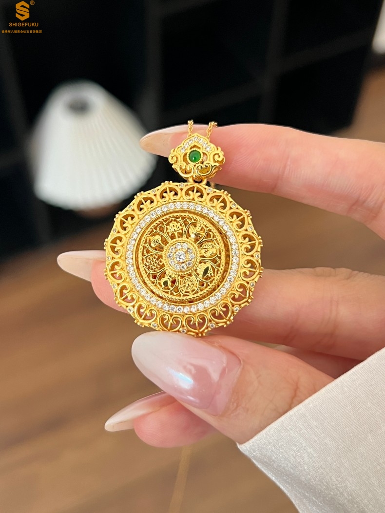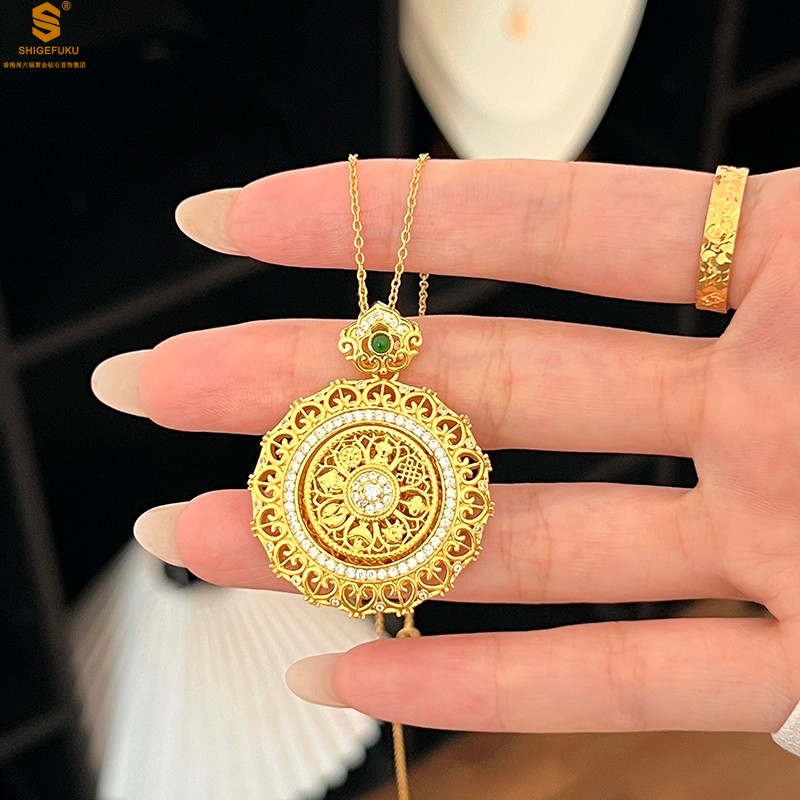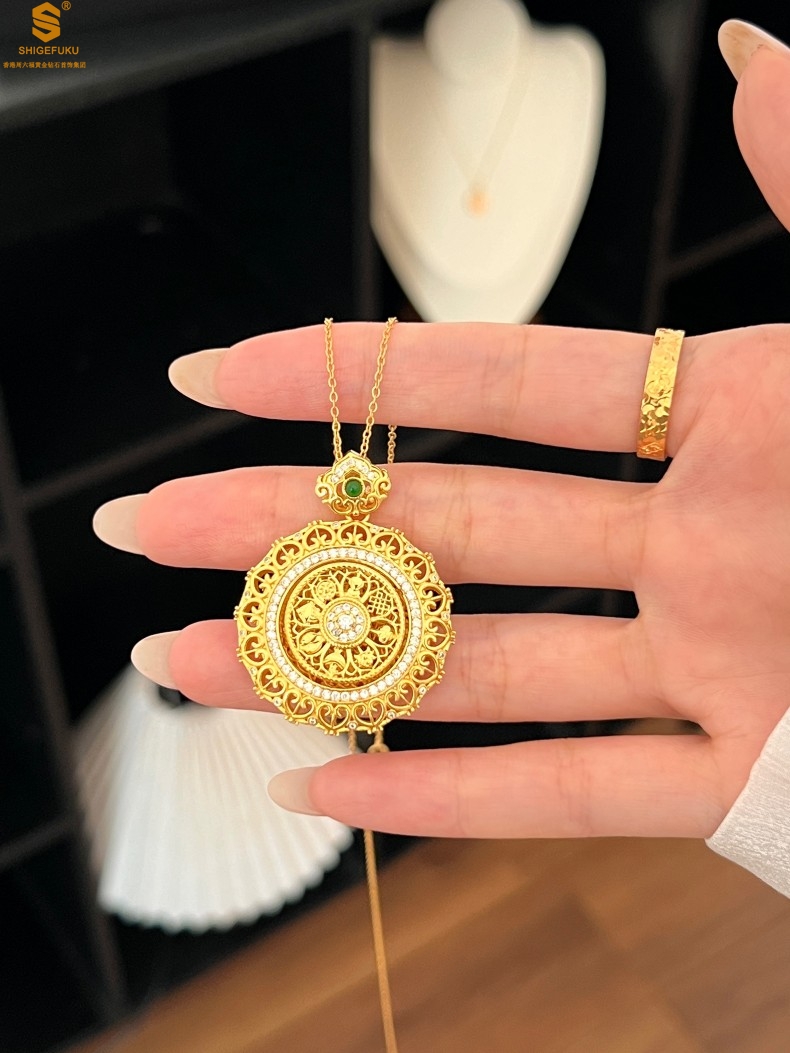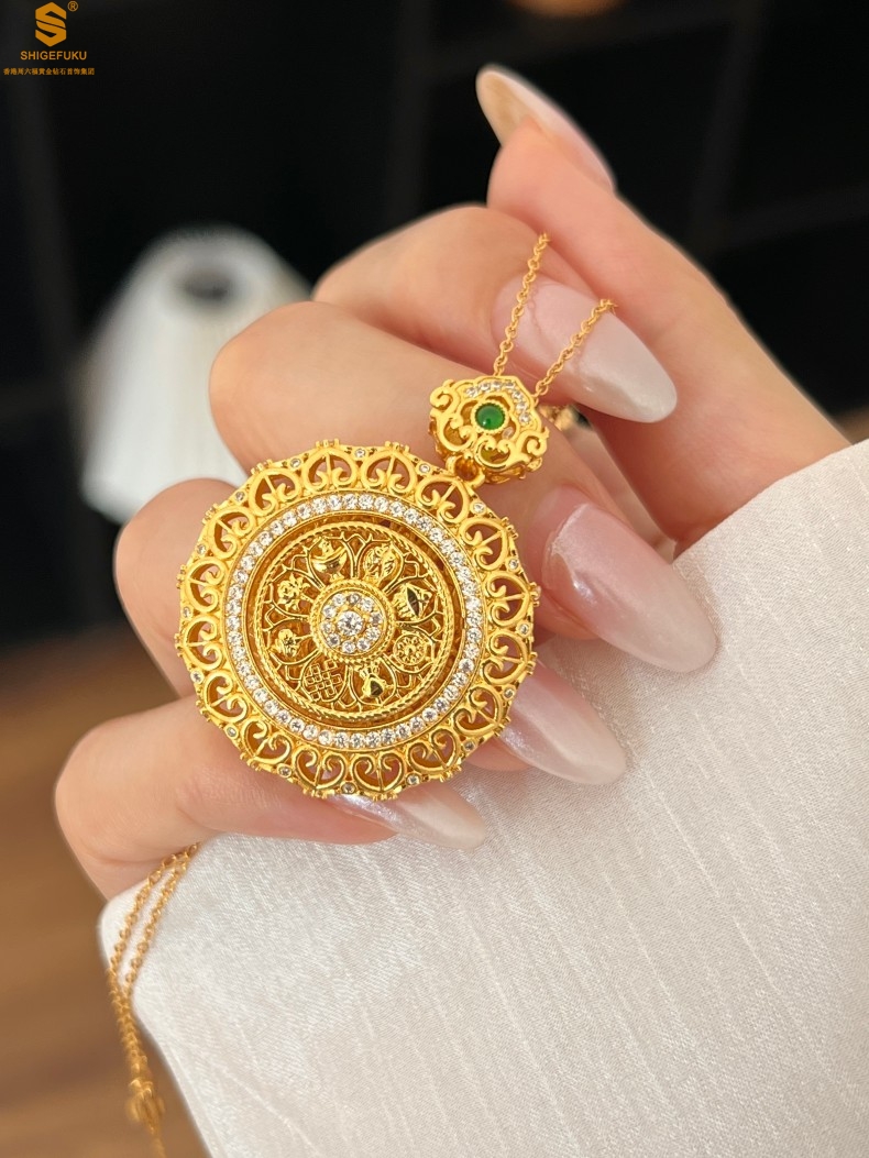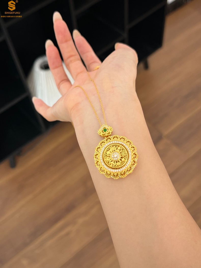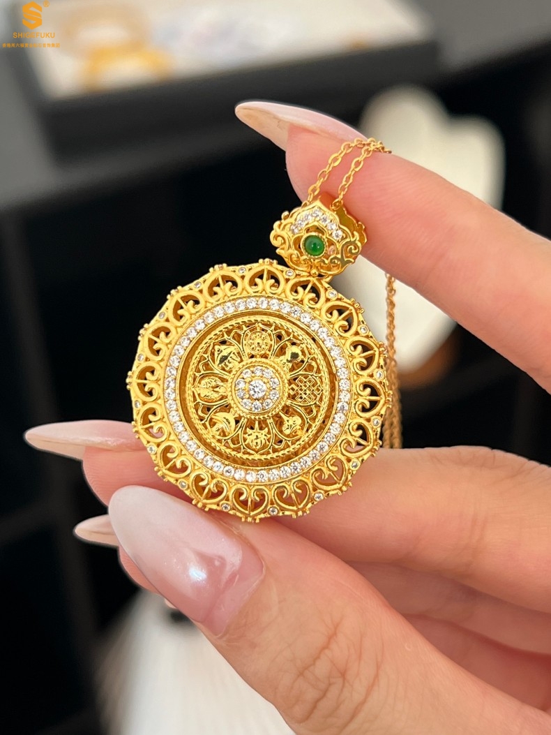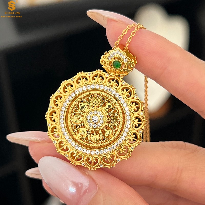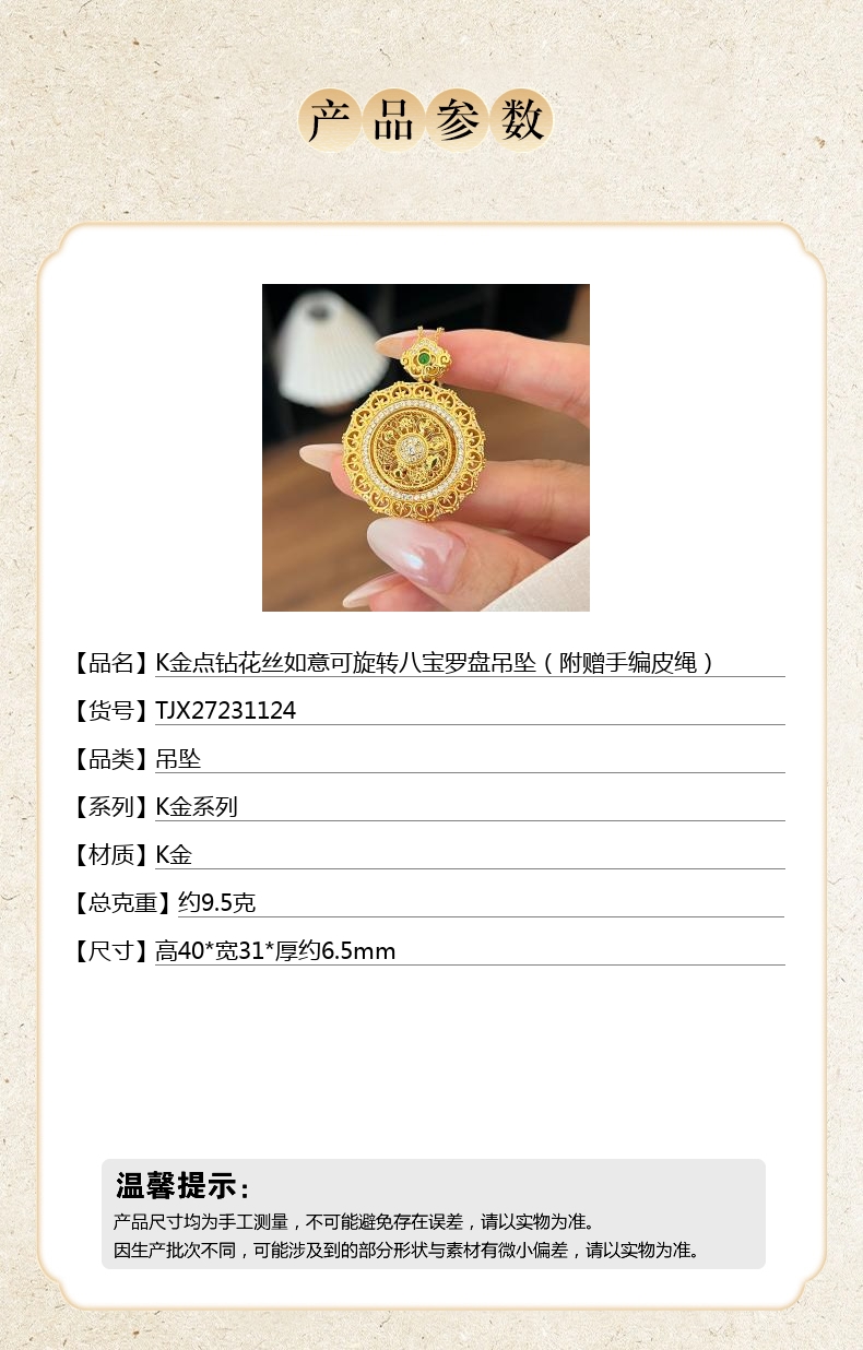 【品名】K金点钻花丝如意可旋转八宝罗盘吊坠(附赠手编皮绳)