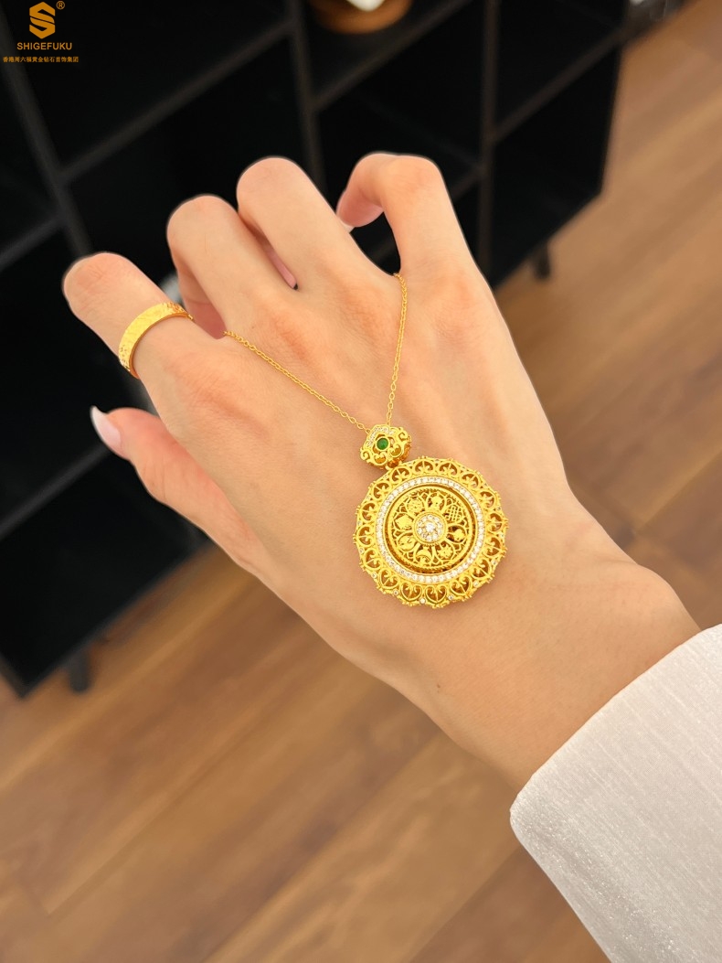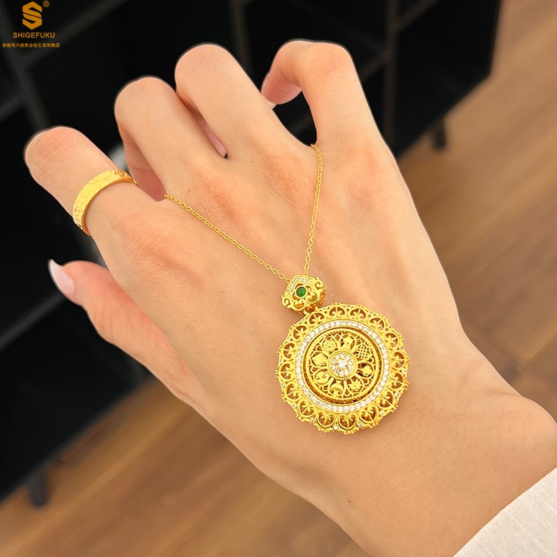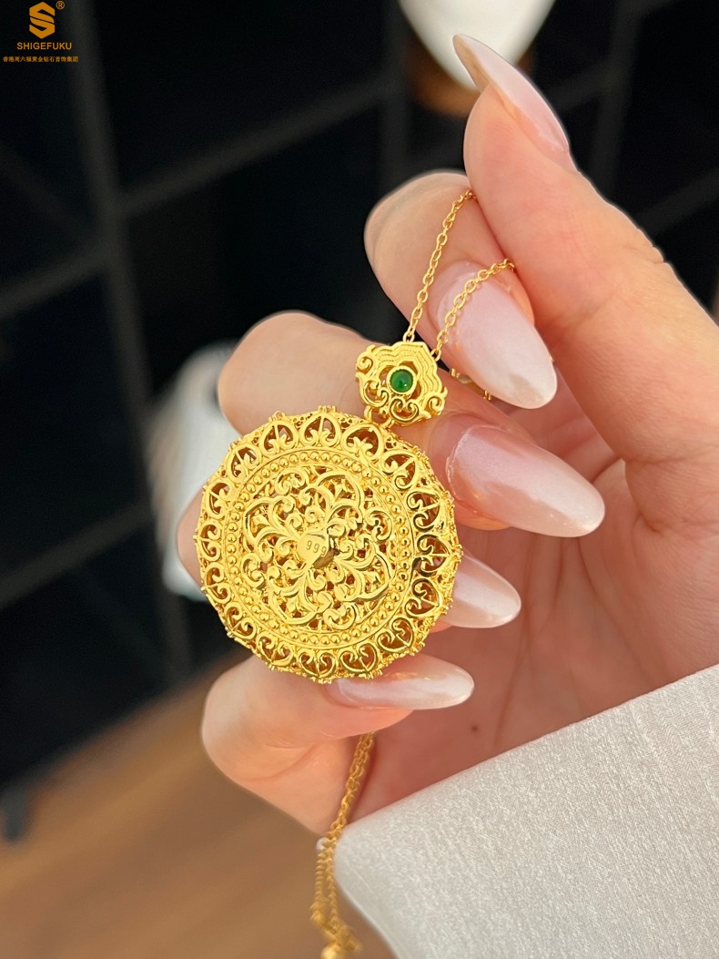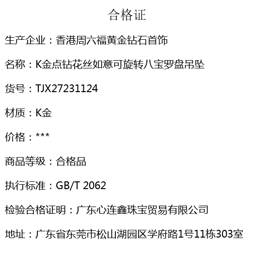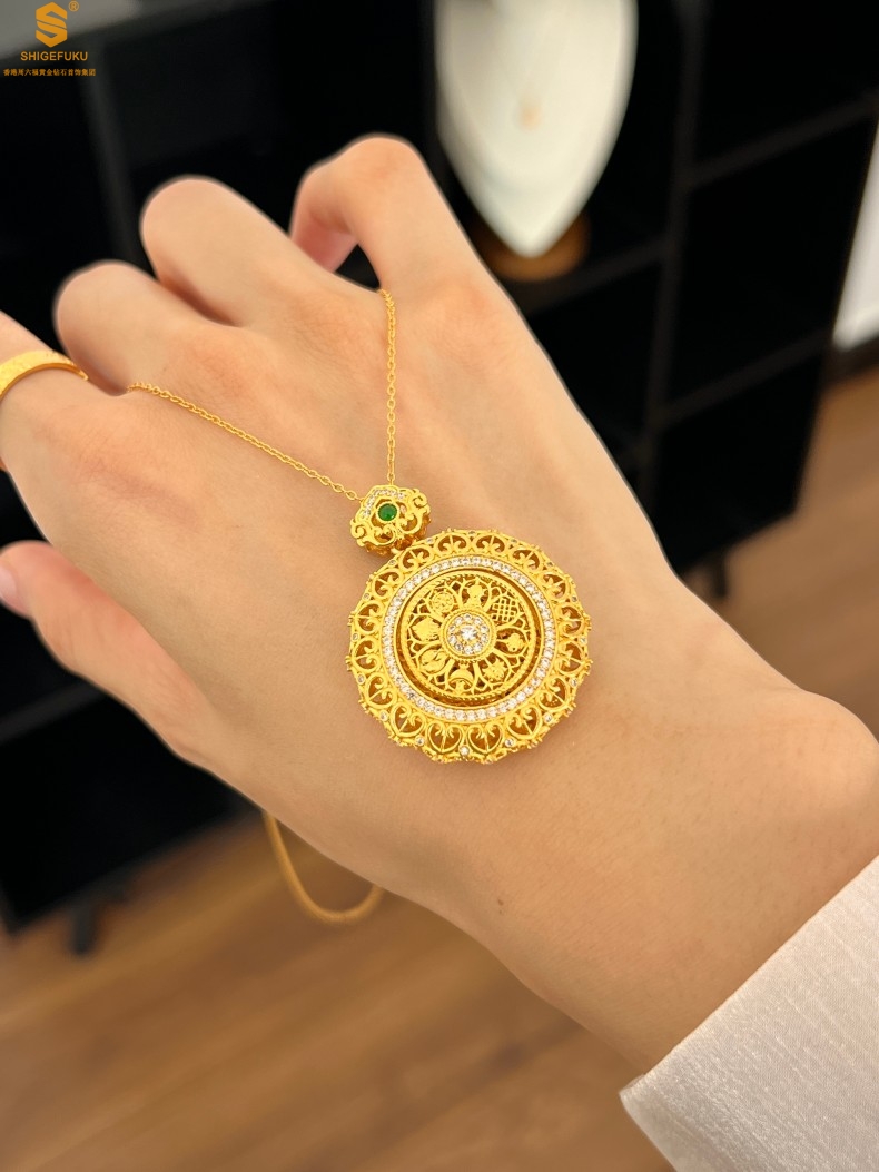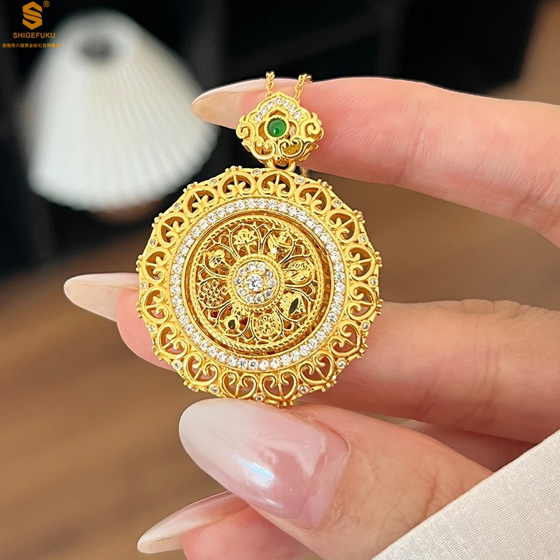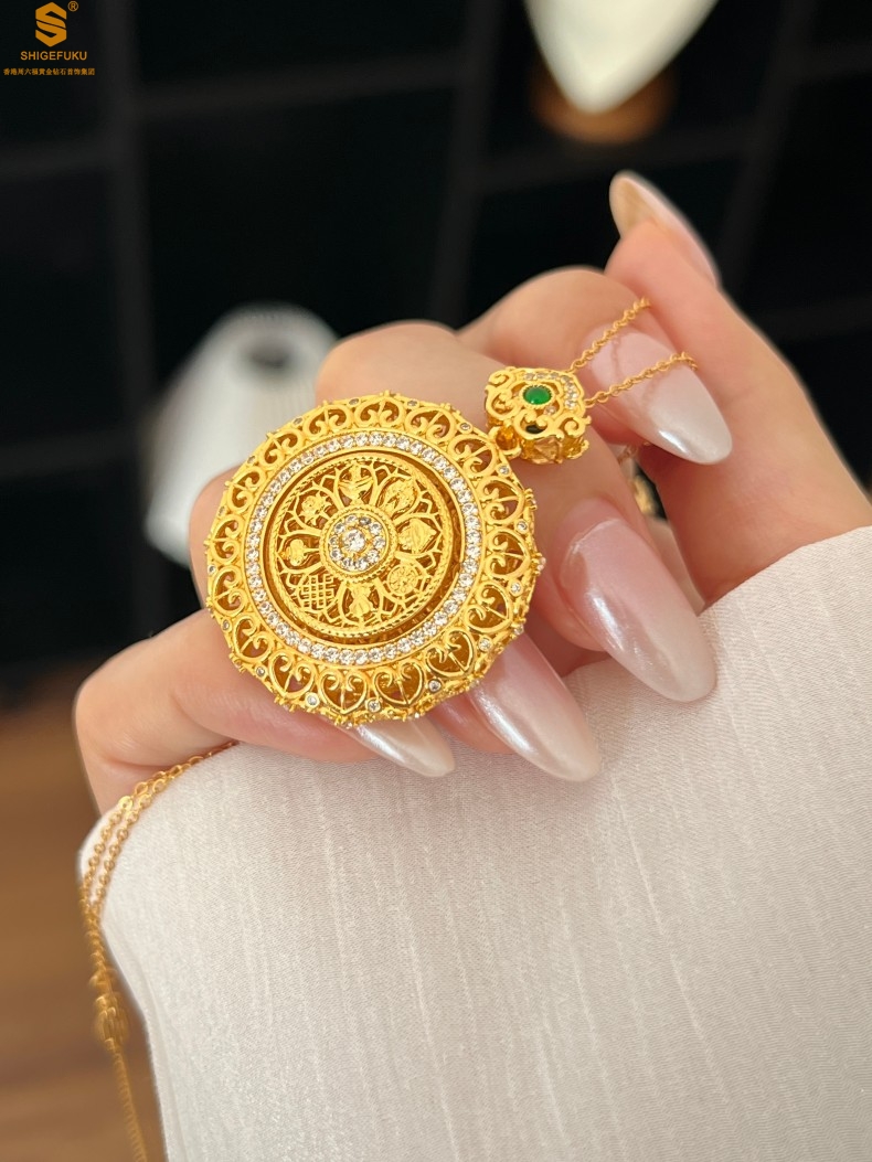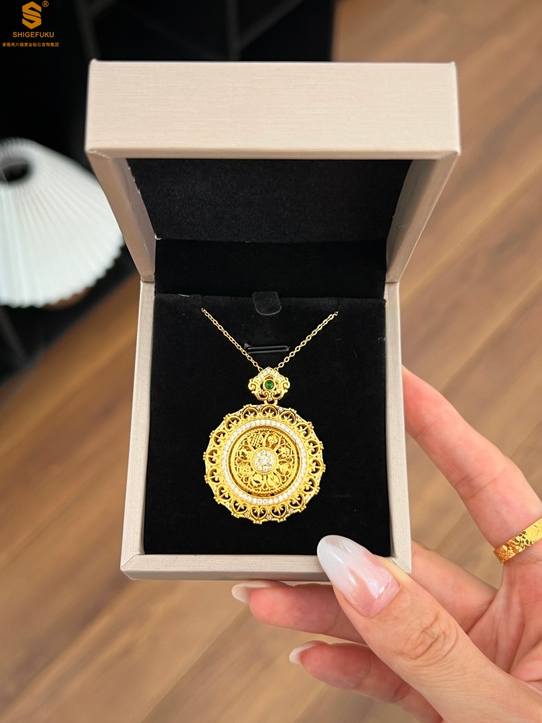 【品名】K金点钻花丝如意可旋转八宝罗盘吊坠(附赠手编皮绳)