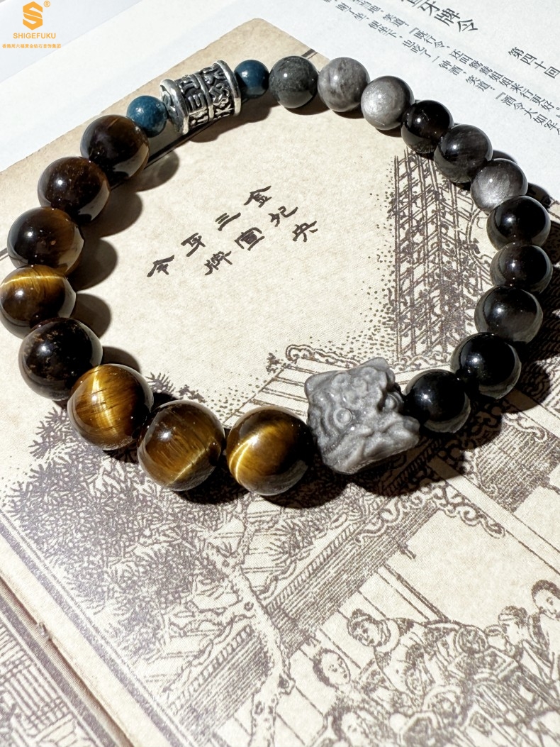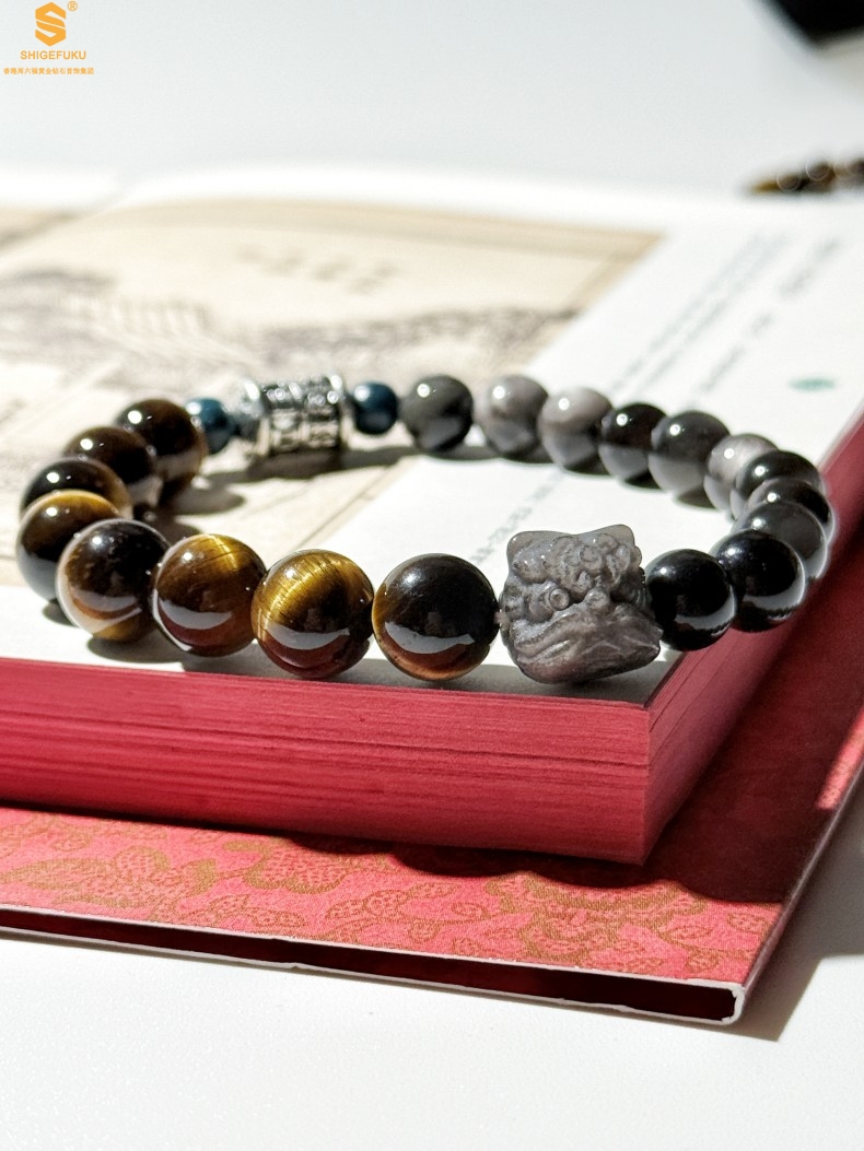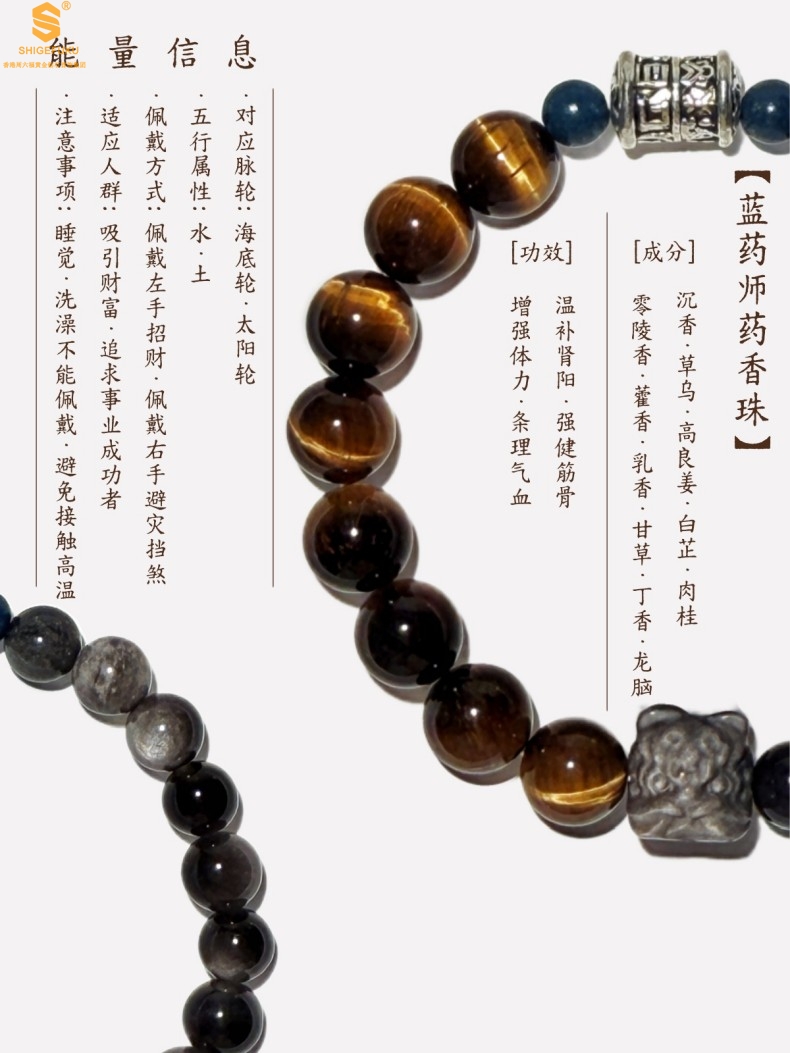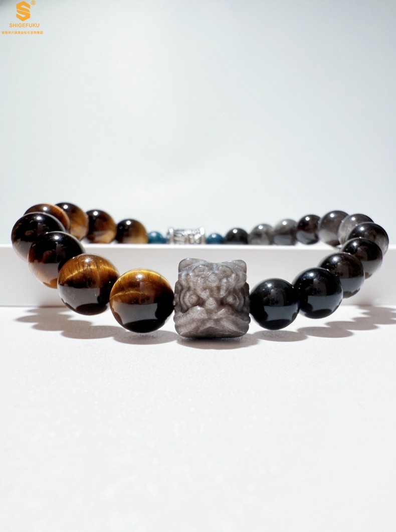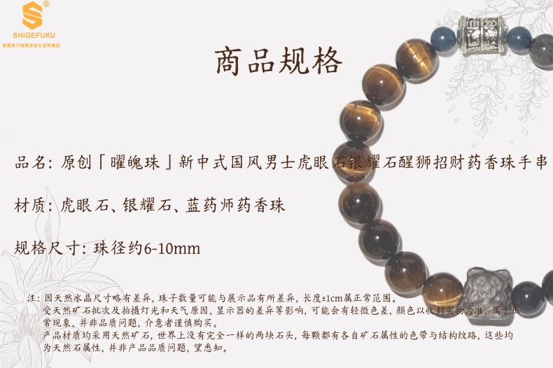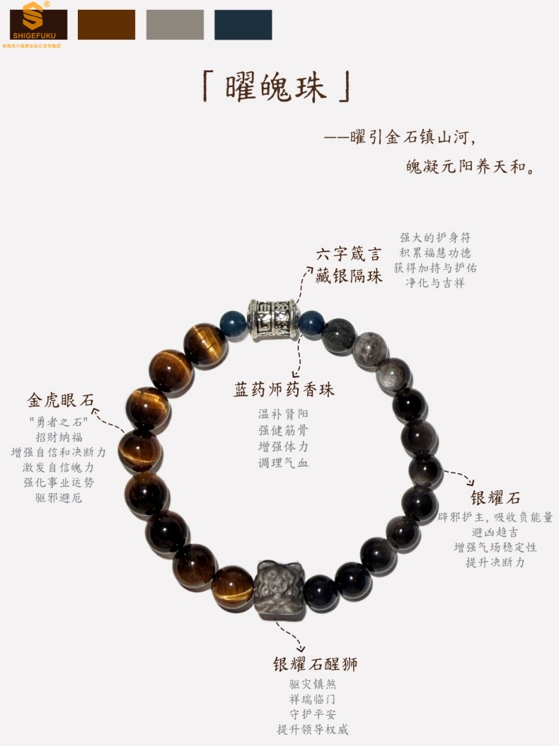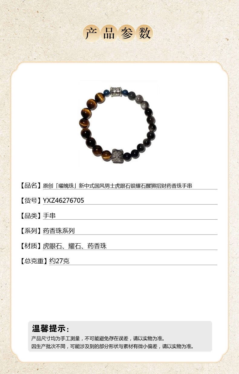 【品名】原创「曜魄珠」新中式国风男士虎眼石银耀石醒狮招财药香珠手串