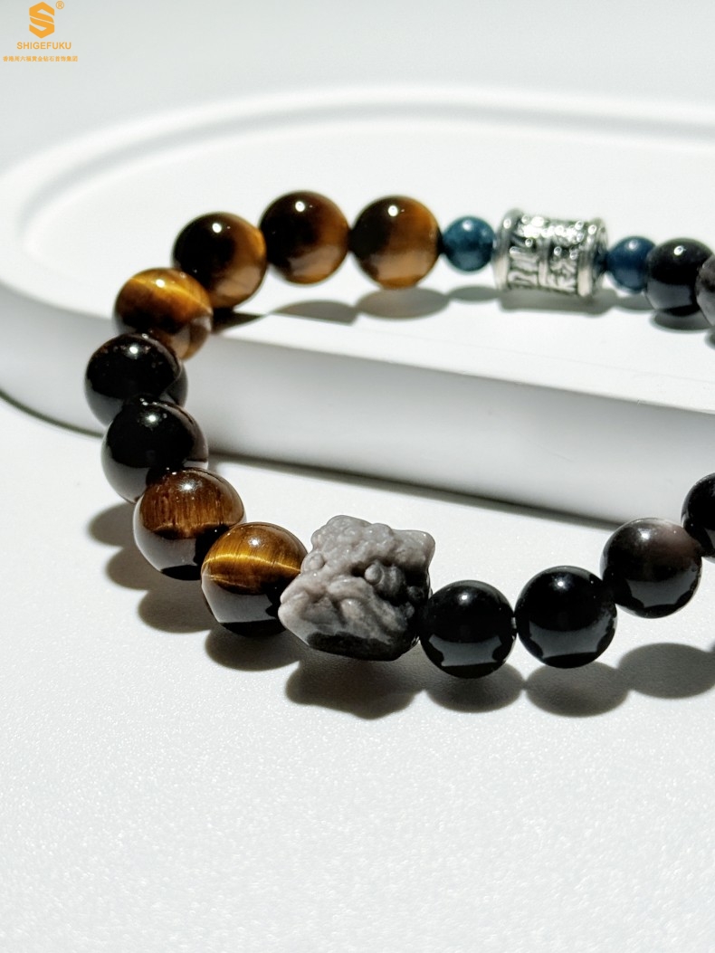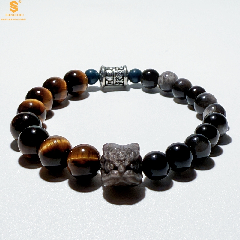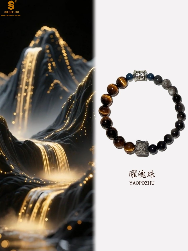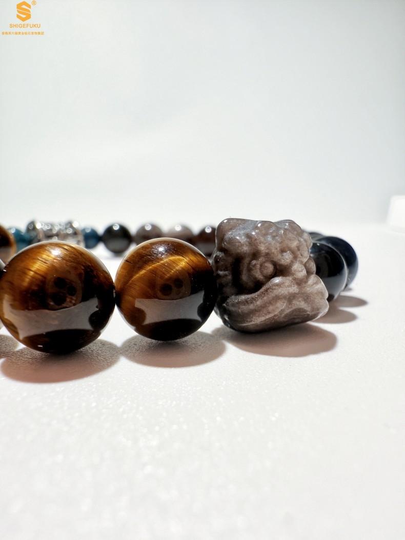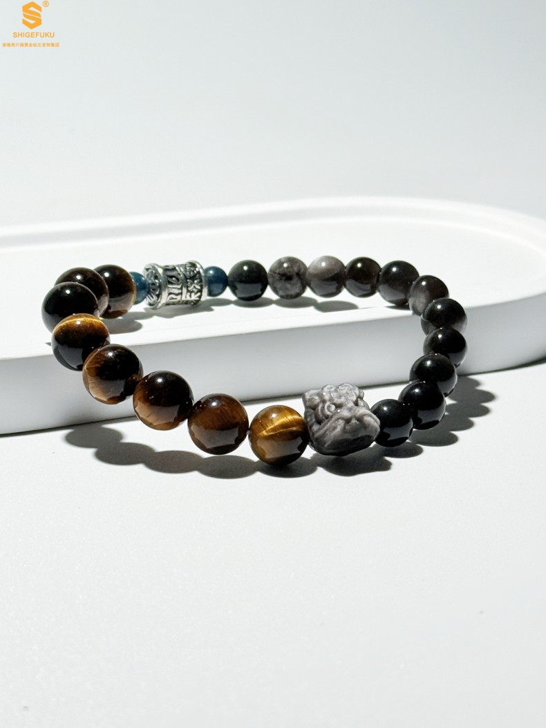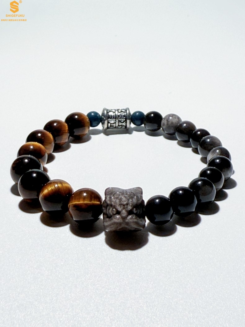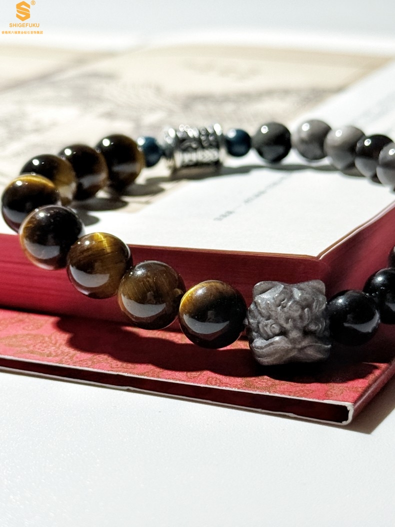 【品名】原创「曜魄珠」新中式国风男士虎眼石银耀石醒狮招财药香珠手串