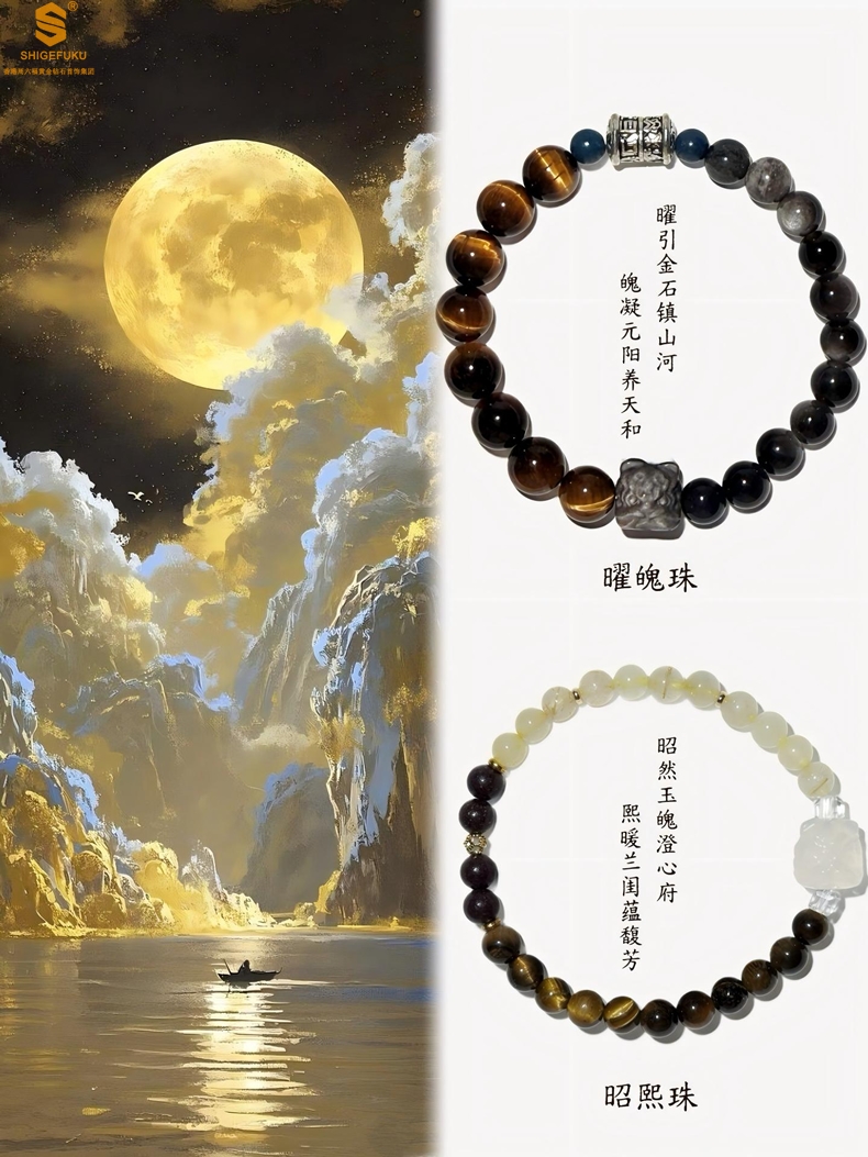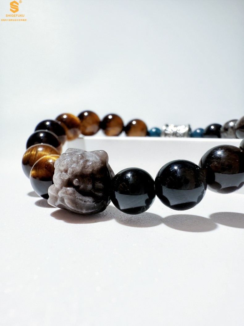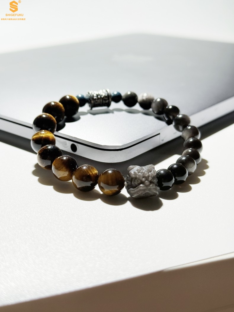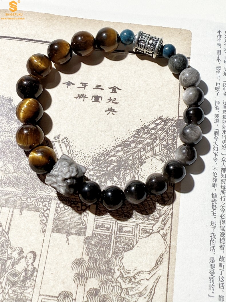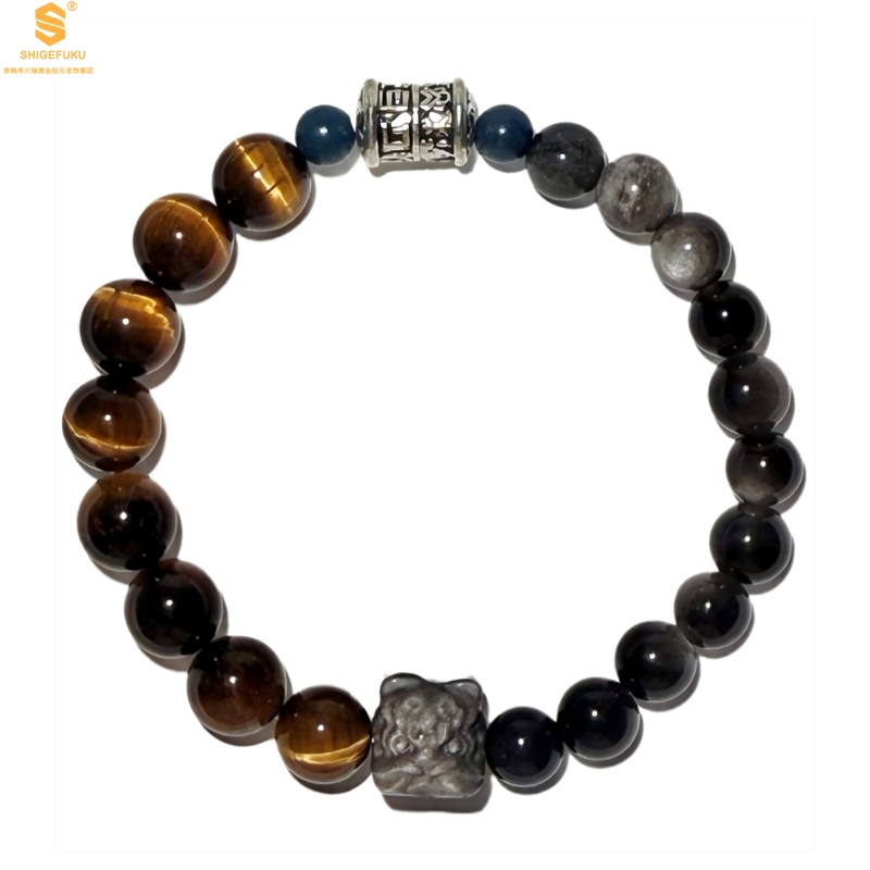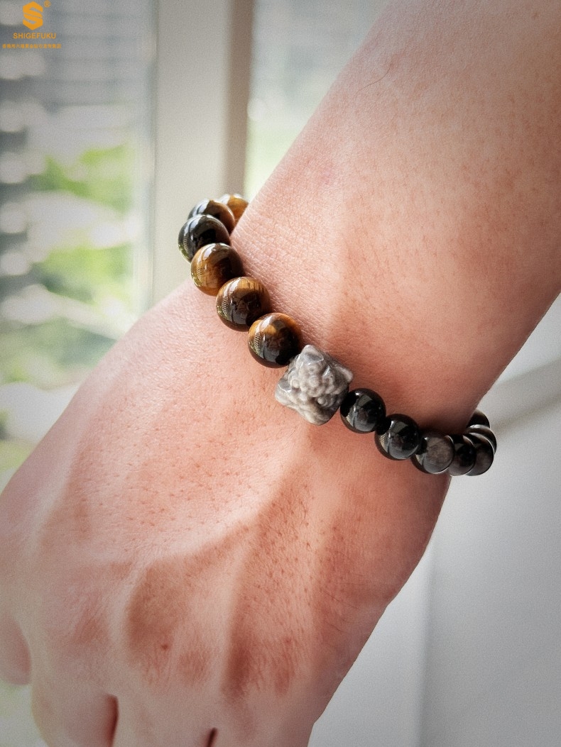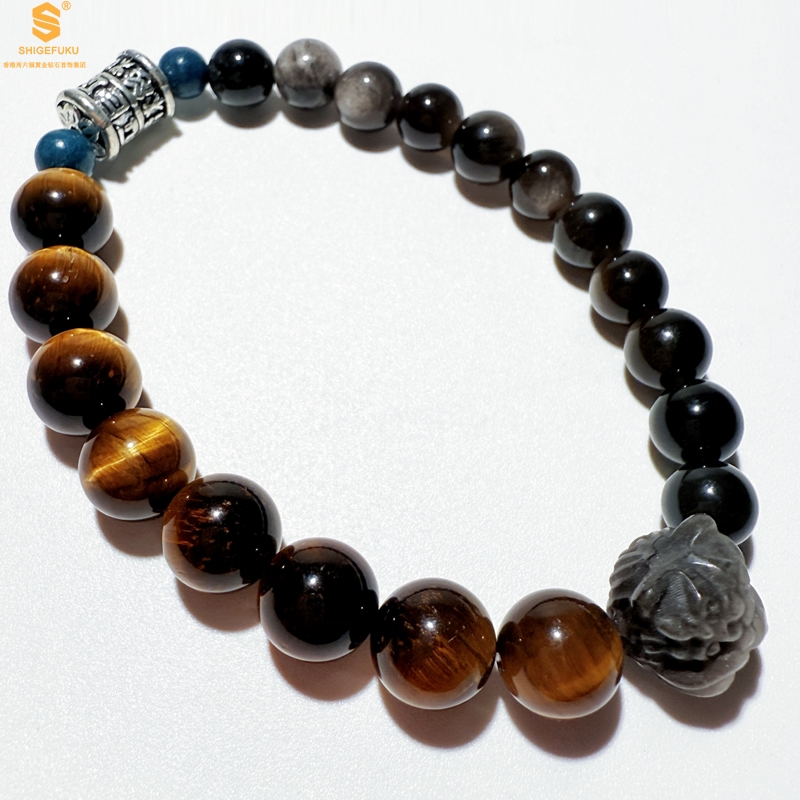 【品名】原创「曜魄珠」新中式国风男士虎眼石银耀石醒狮招财药香珠手串