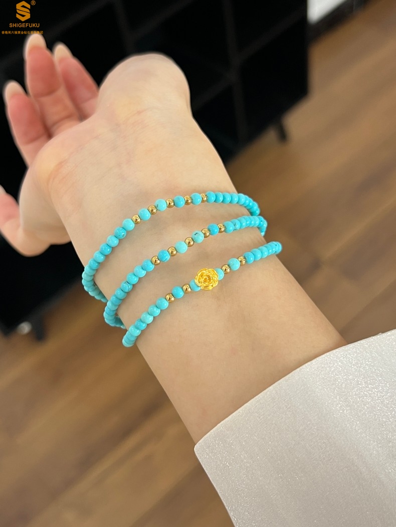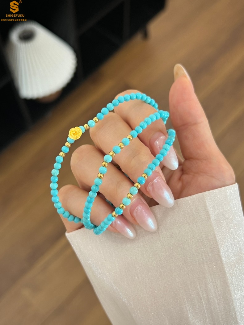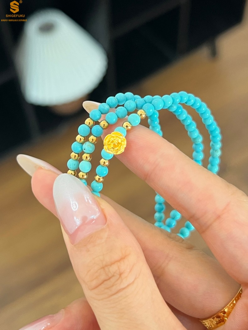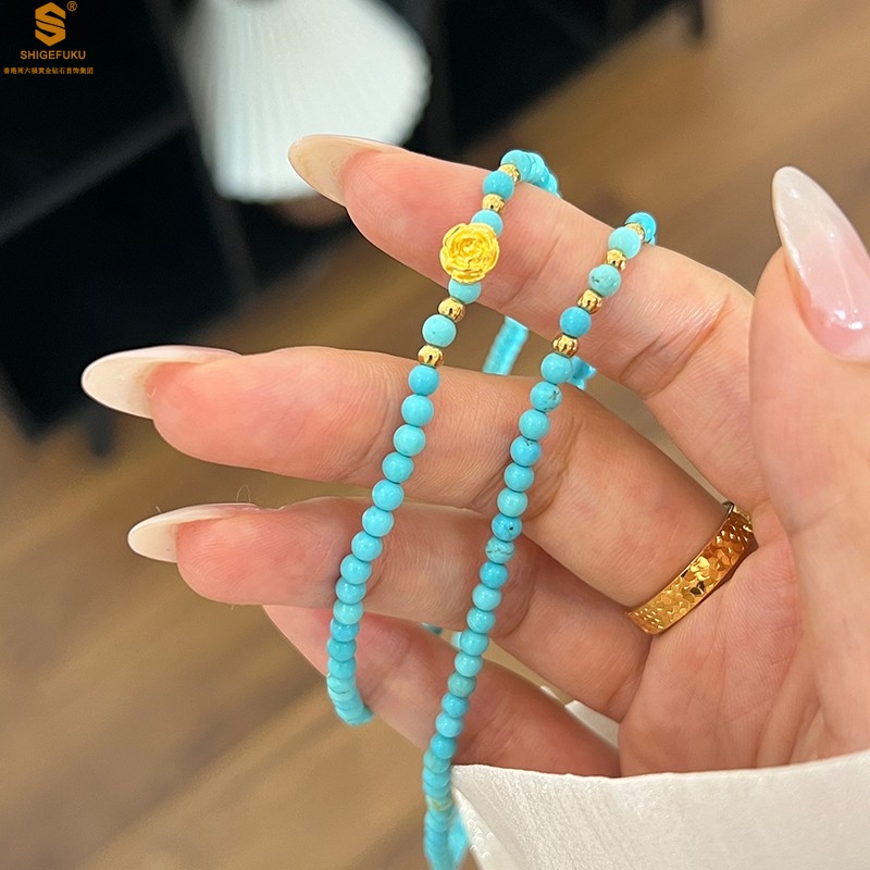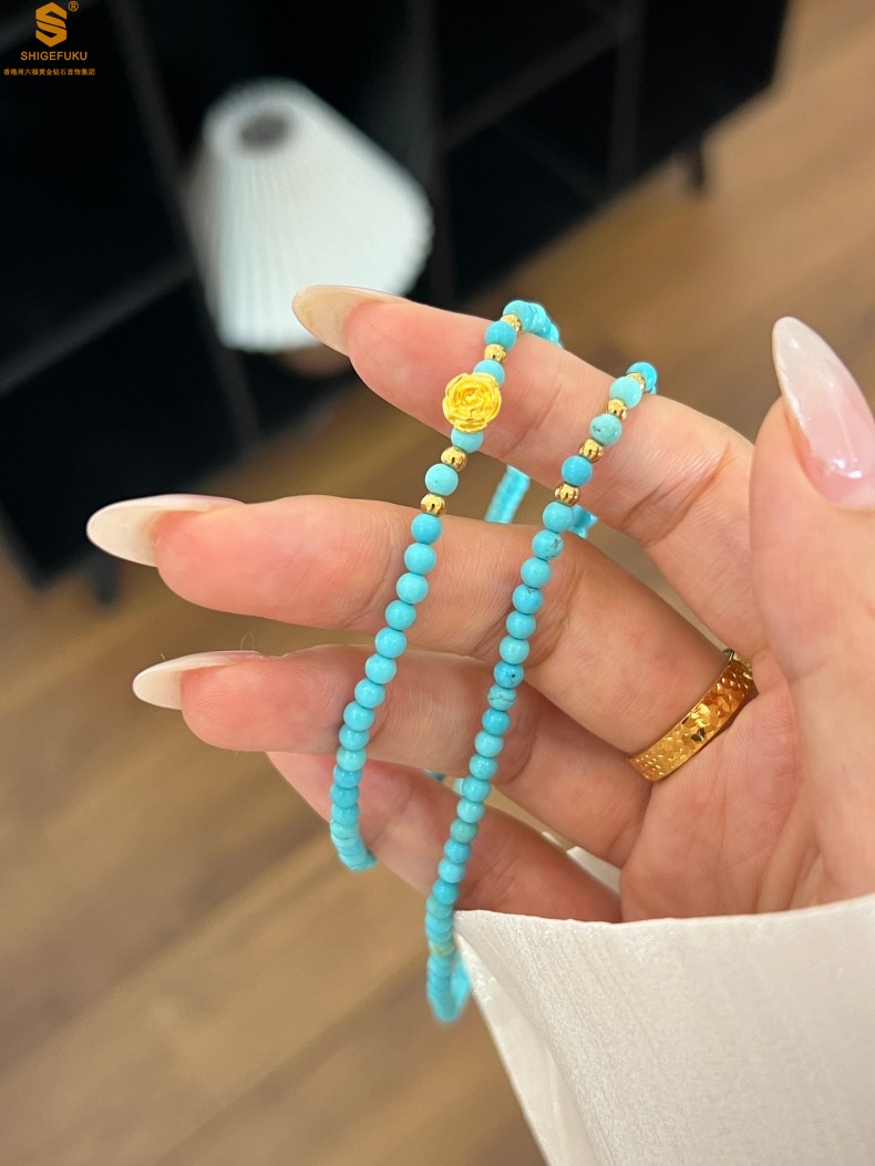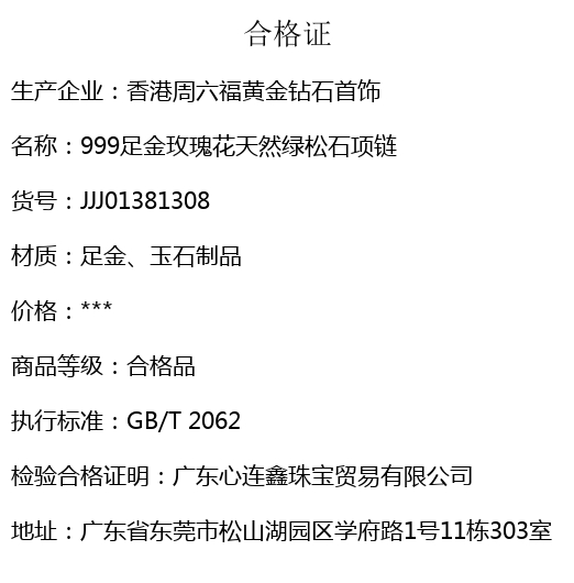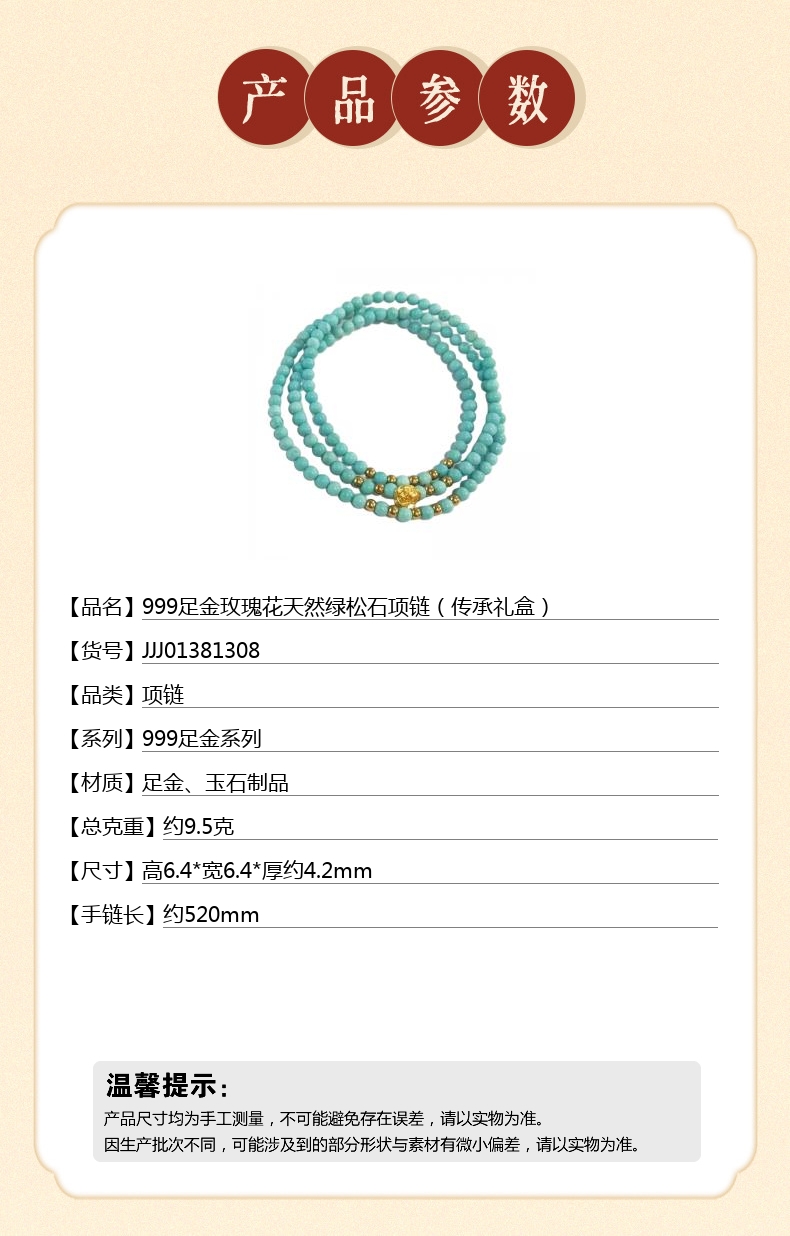 【品名】999足金玫瑰花天然绿松石项链(传承礼盒)